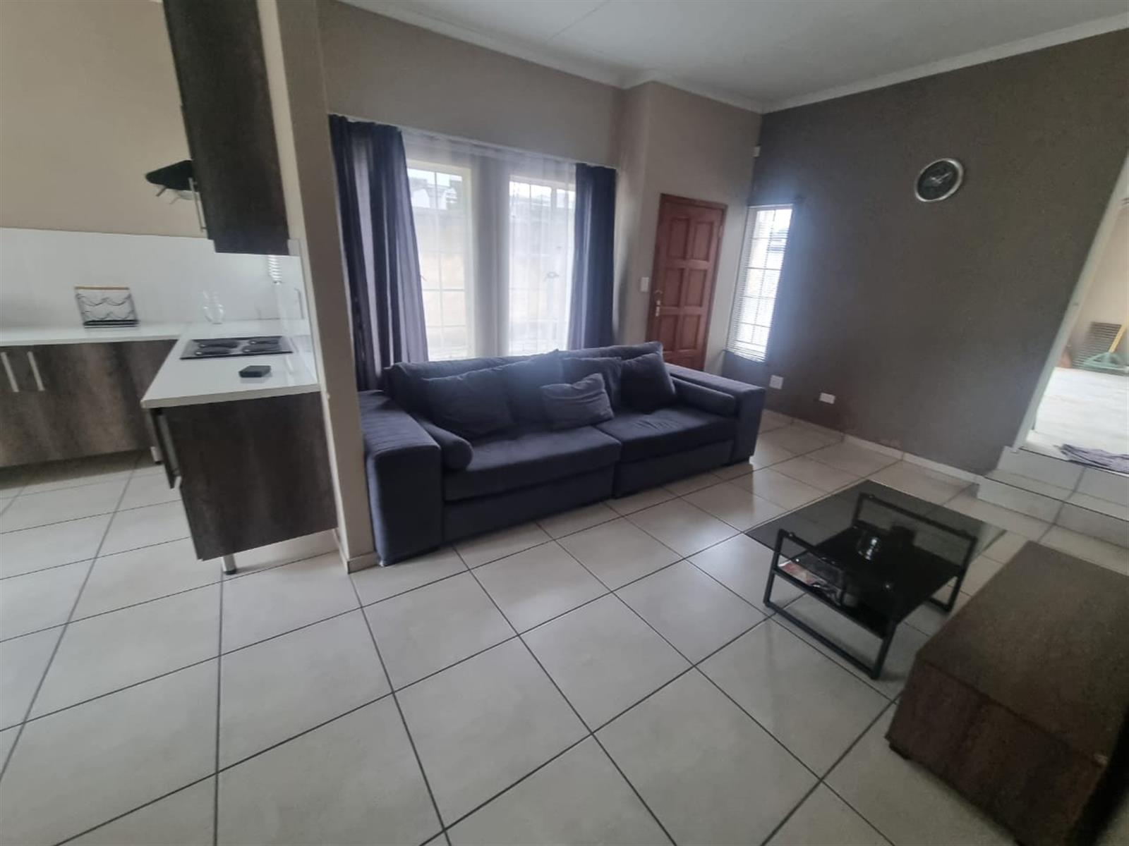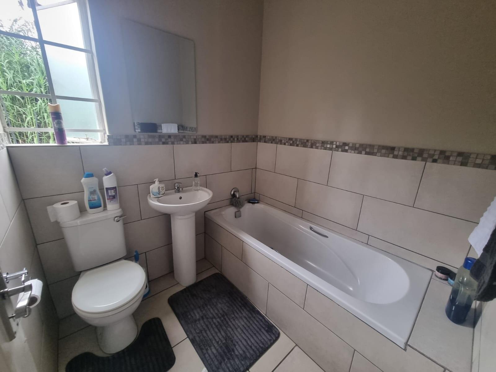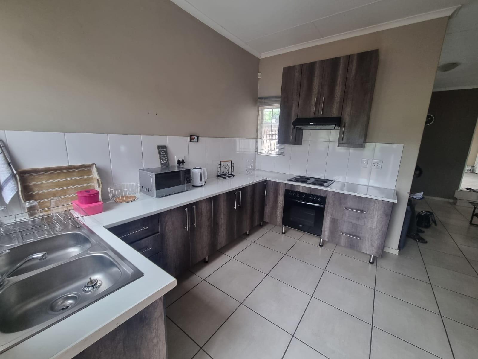 Enter the house form either a front door or directly from the garage into the Livingroom, with open plan kitchen. The spacious kitchen has a lovely open atmosphere thanks to the light colour working surface, tiled floor and white tile back-splash. The kitchen is fitted with a built-in four plate electric Defy stove and oven combo, double sink and plenty of cupboard space.