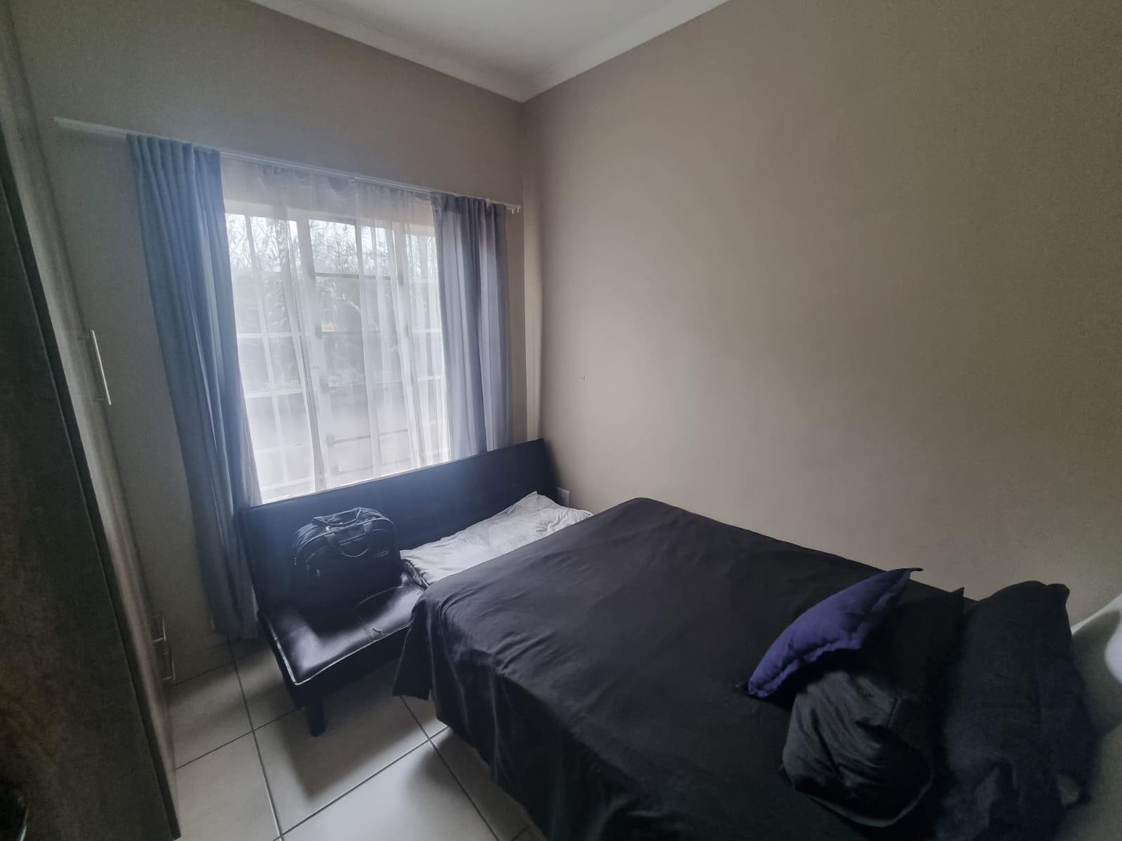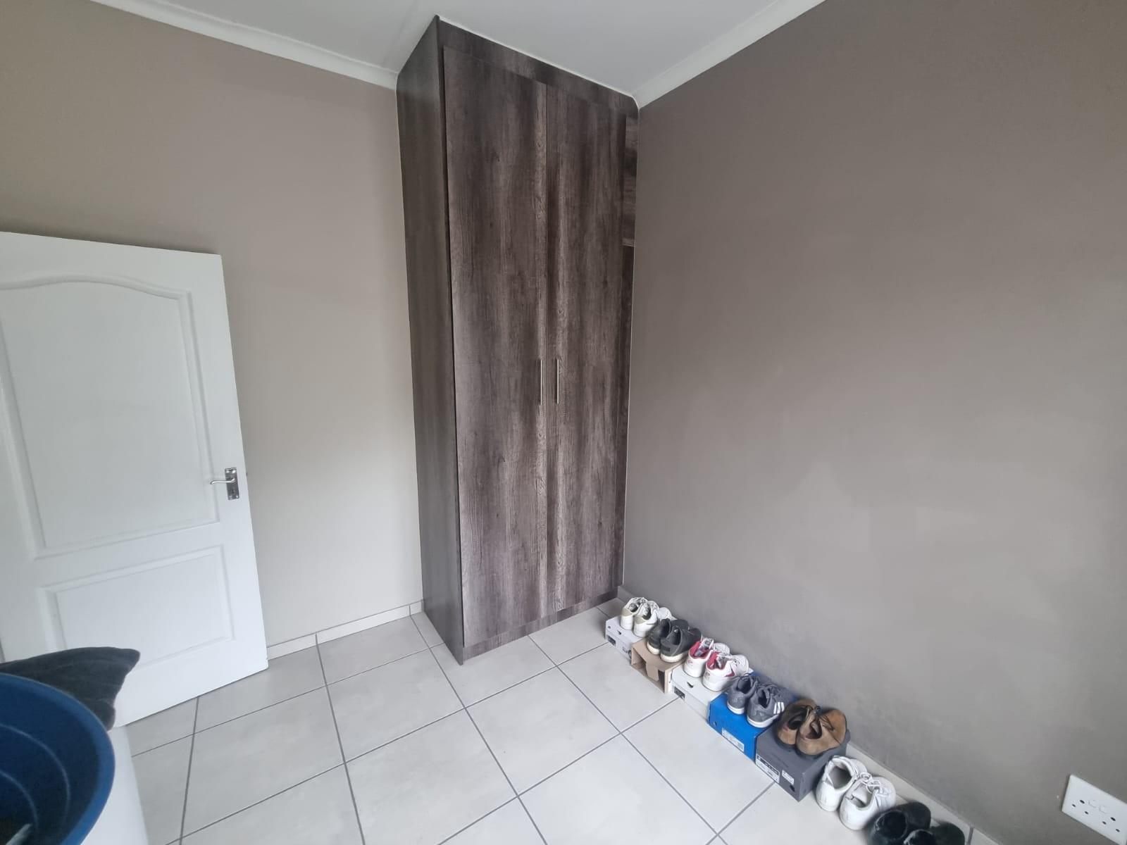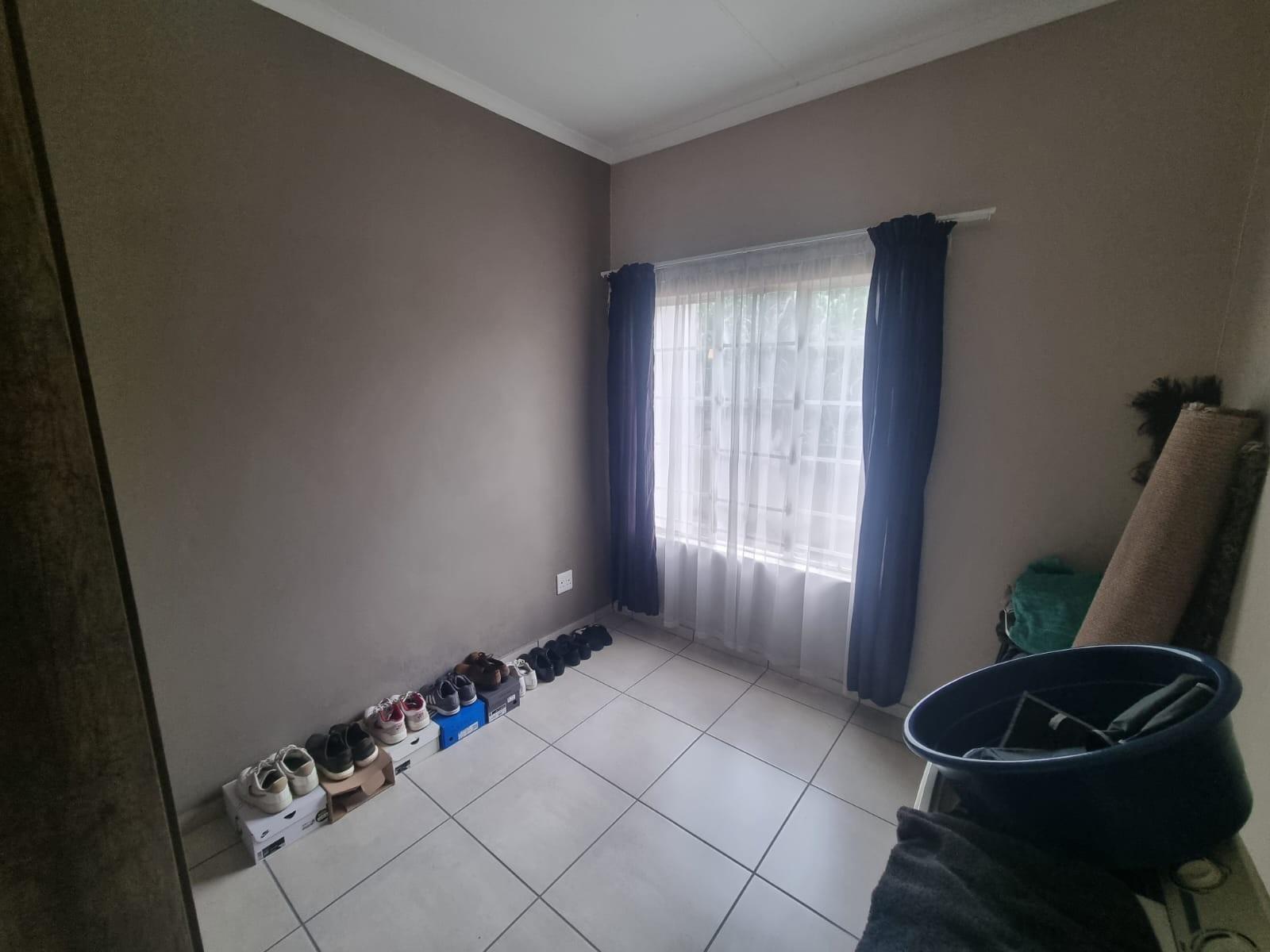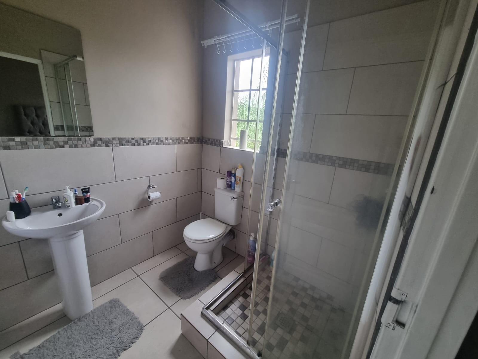 Enter the house form either a front door or directly from the garage into the Livingroom, with open plan kitchen. The spacious kitchen has a lovely open atmosphere thanks to the light colour working surface, tiled floor and white tile back-splash. The kitchen is fitted with a built-in four plate electric Defy stove and oven combo, double sink and plenty of cupboard space.