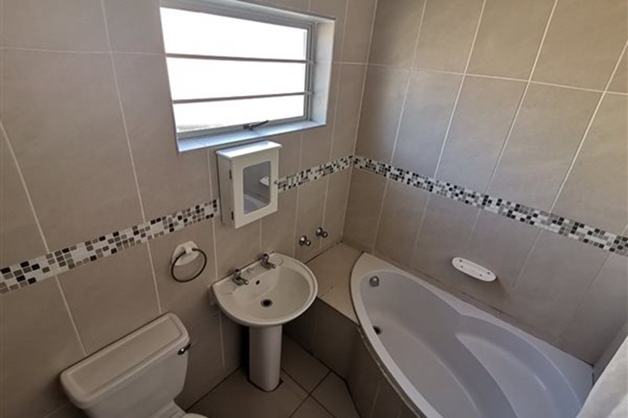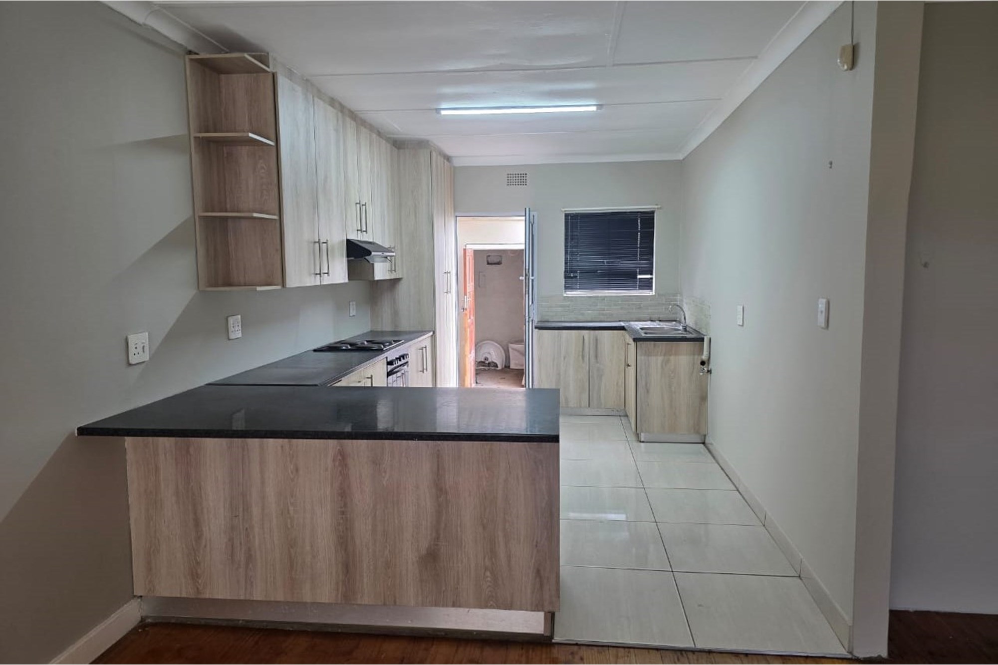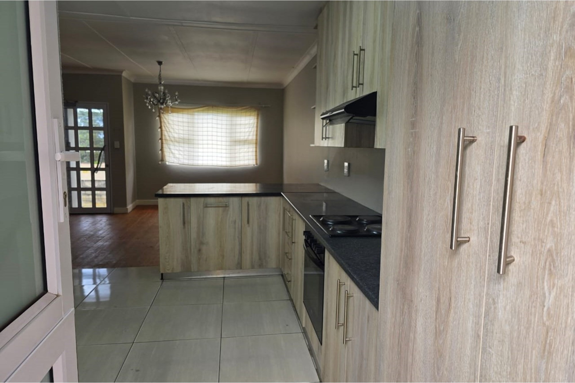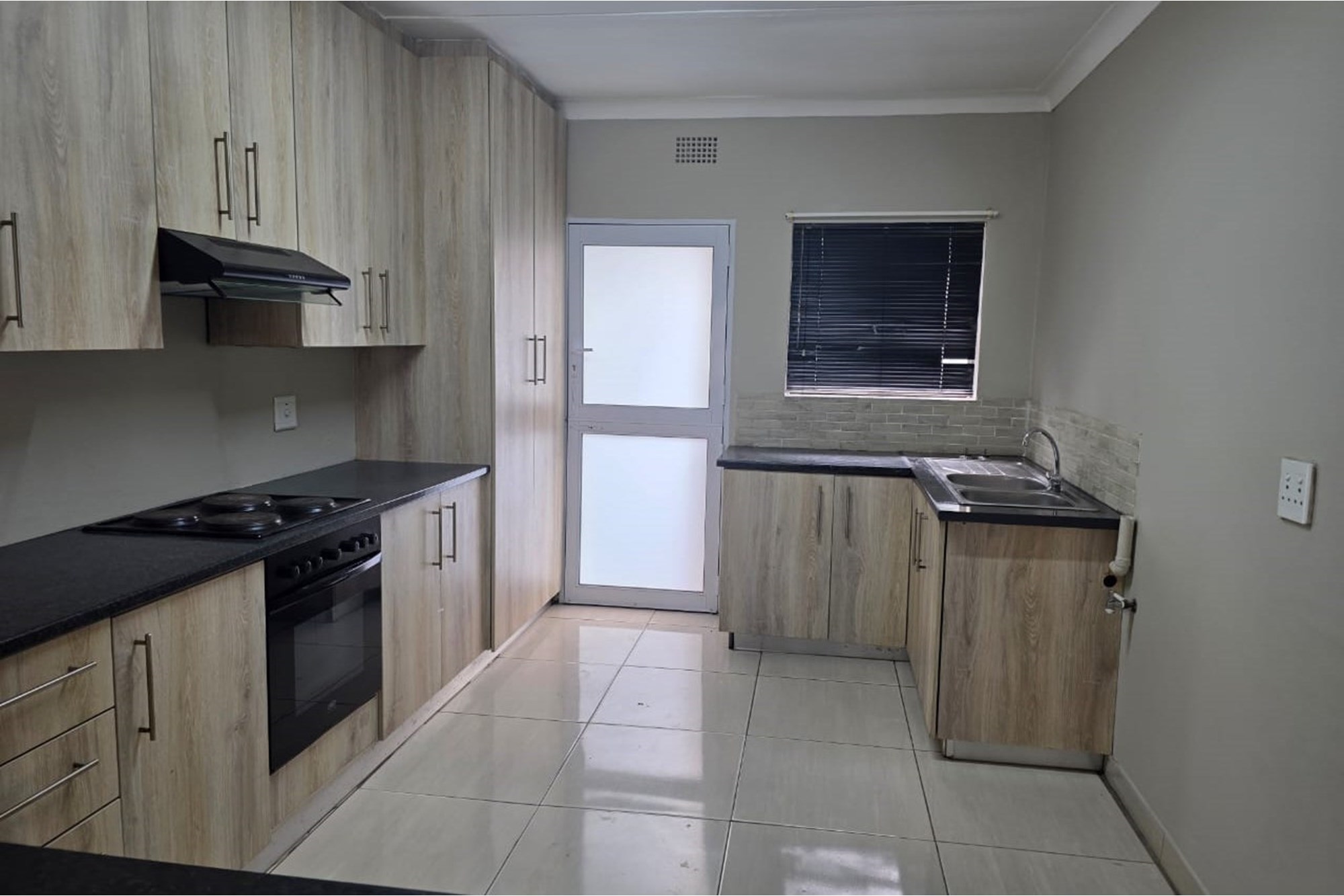 Thoughtfully designed with an open-plan layout, the living room flows seamlessly into the dining area and fully equipped kitchen boasting an electric oven and hob with additional gas stove which assists in times of load shedding. This kitchen with ample cabinets offering many storage options with a large grocery cupboard, is ideal for a home cook. This is an inviting space ideal for family gatherings or entertaining friends.