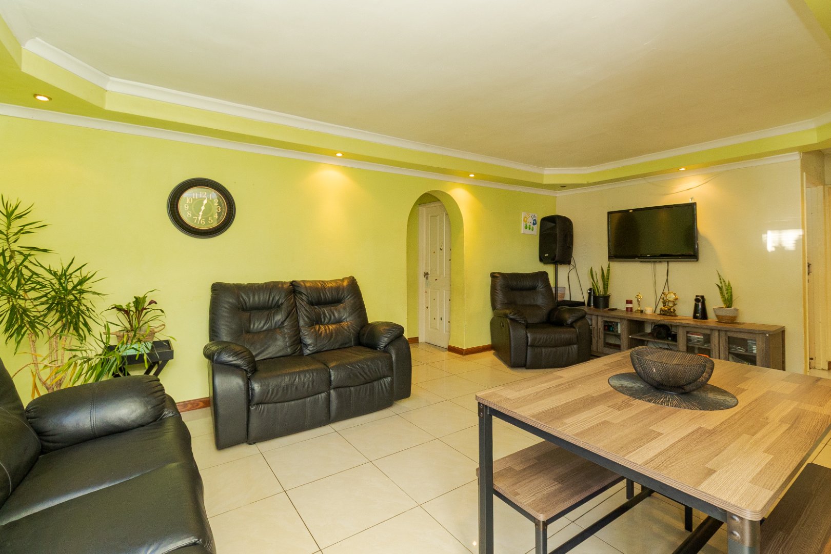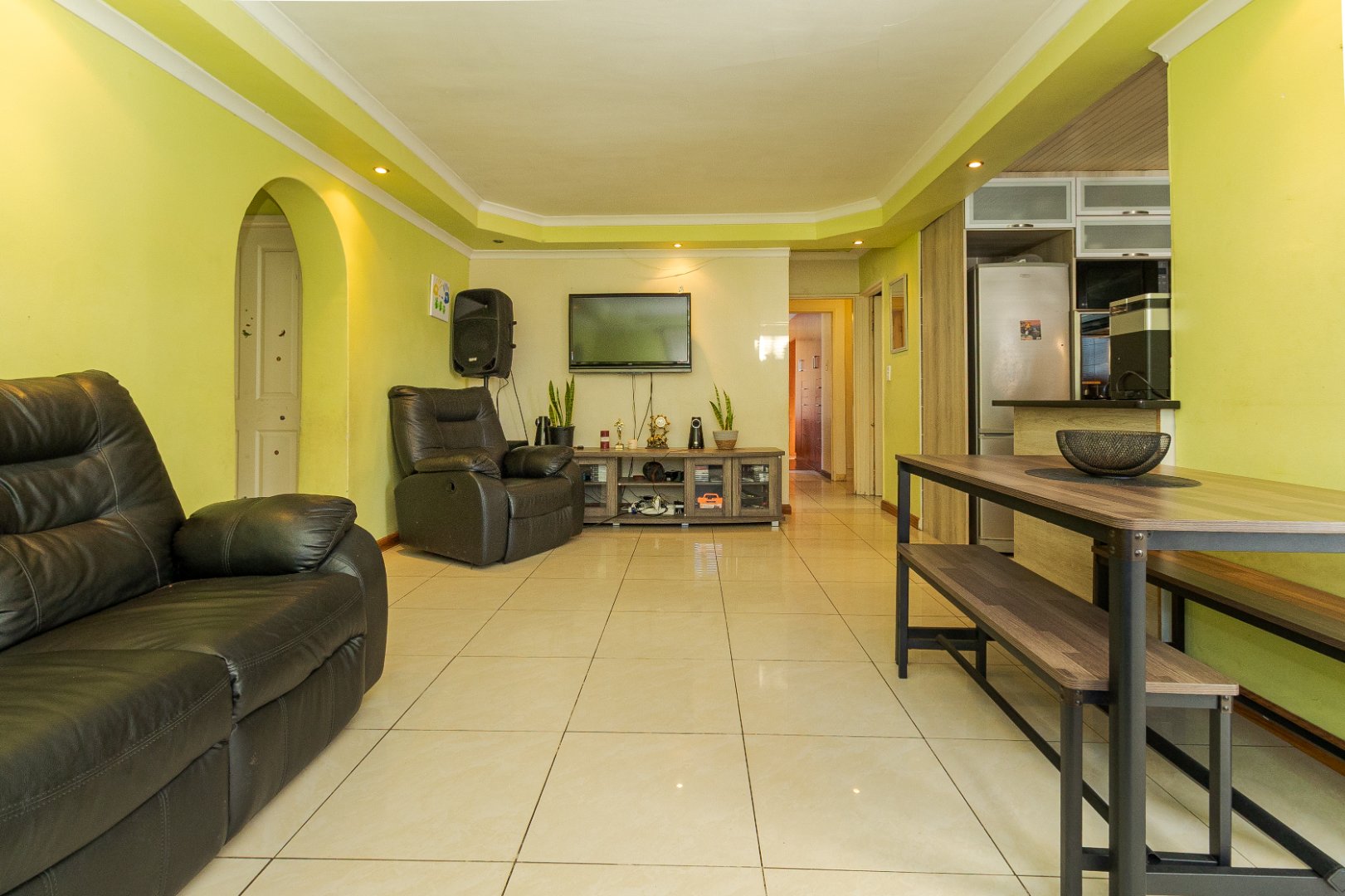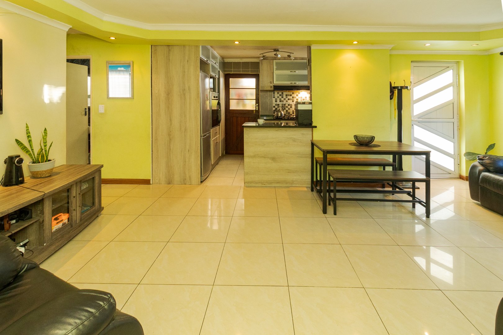 Upon entering, you are welcomed by a generously sized lounge, enhanced with sleek porcelain tiled flooring and modern downlighting, creating a warm and inviting atmosphere. The kitchen is well-equipped with ample built-in cupboards and a gas stove, ideal for both everyday cooking and entertaining.