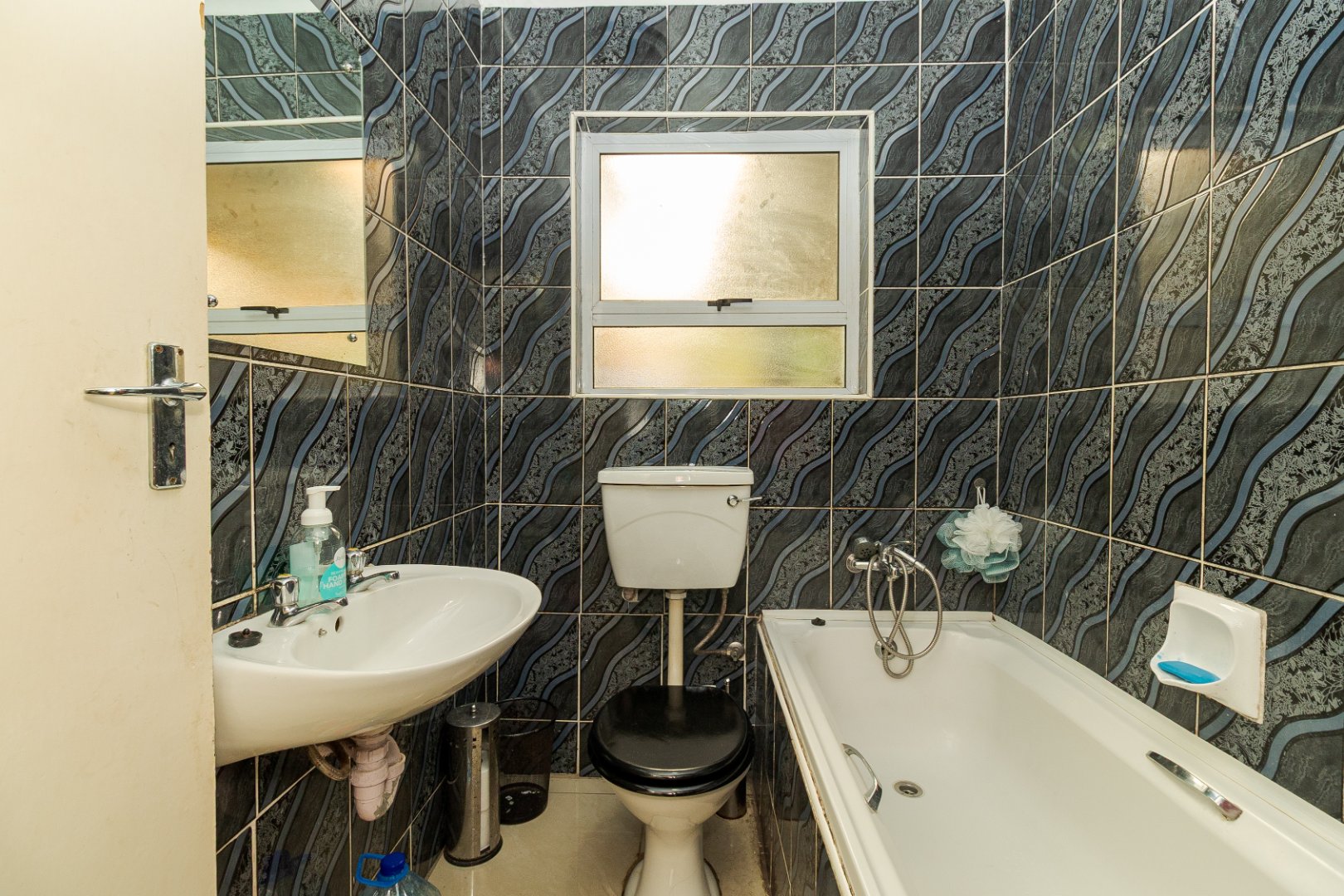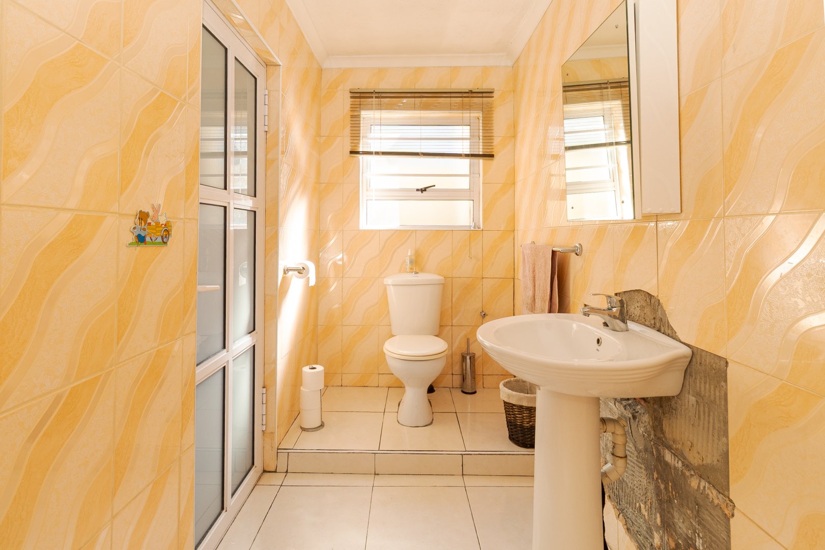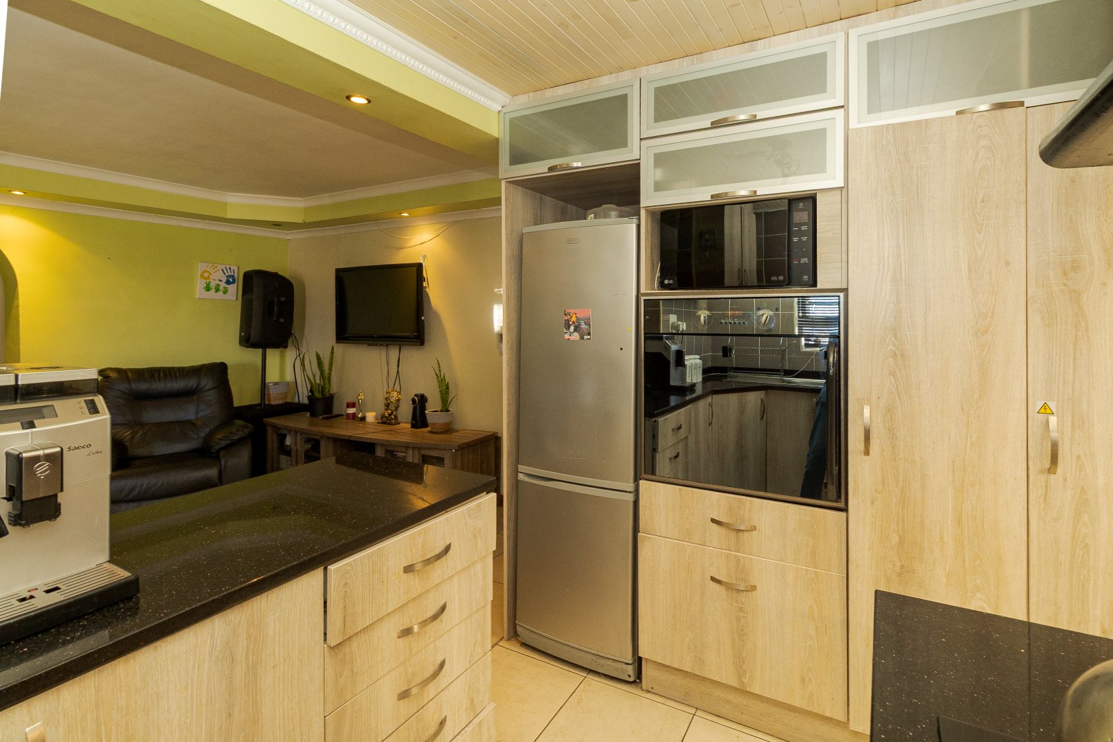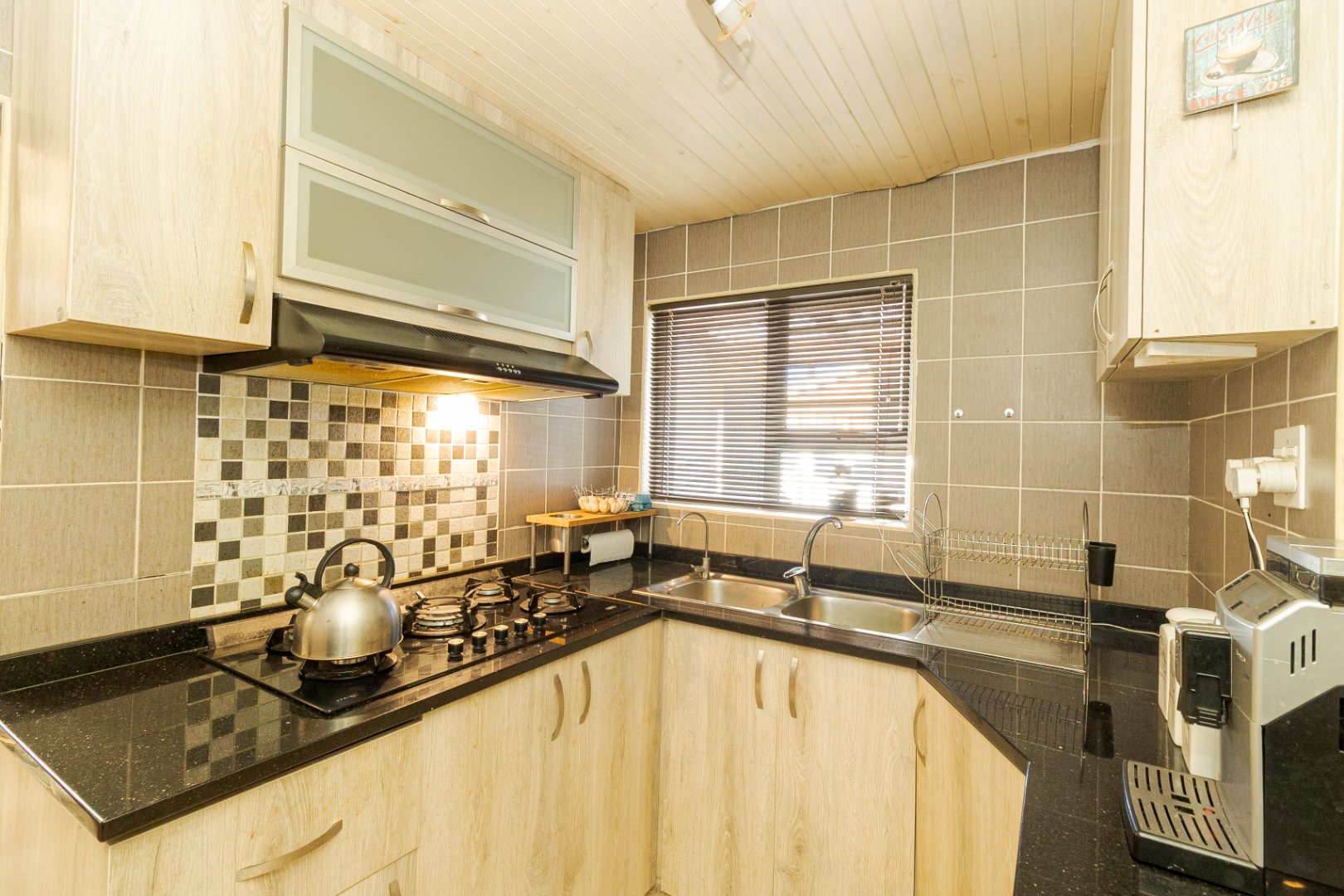 Upon entering, you are welcomed by a generously sized lounge, enhanced with sleek porcelain tiled flooring and modern downlighting, creating a warm and inviting atmosphere. The kitchen is well-equipped with ample built-in cupboards and a gas stove, ideal for both everyday cooking and entertaining.