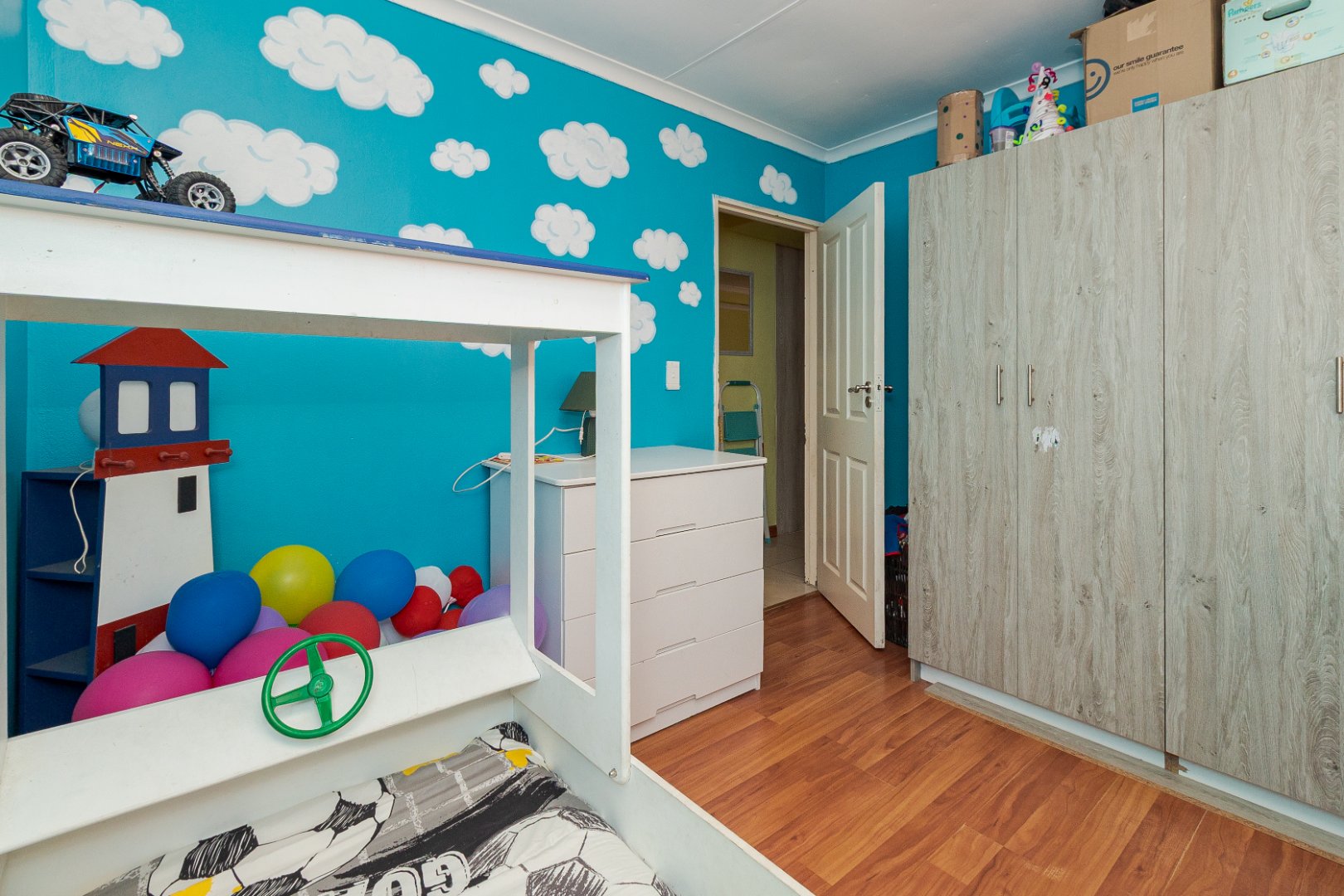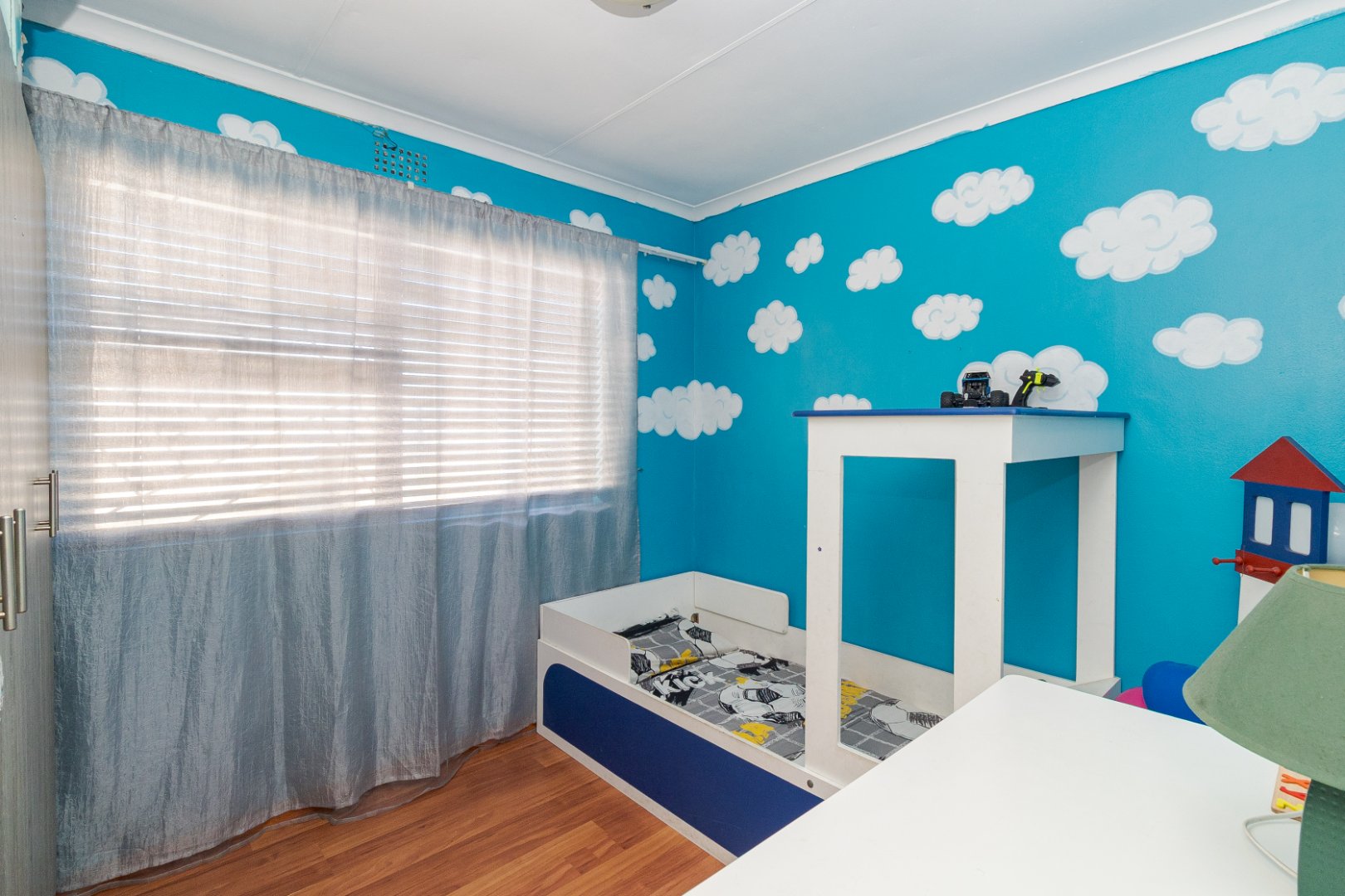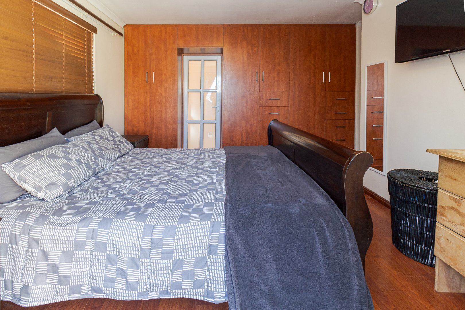 The home features four spacious bedrooms, all with built-in cupboards and laminate flooring, providing ample accommodation for a growing family. The main bedroom includes a private en-suite bathroom with spa-bath, while a second full bathroom caters to the remaining bedrooms.