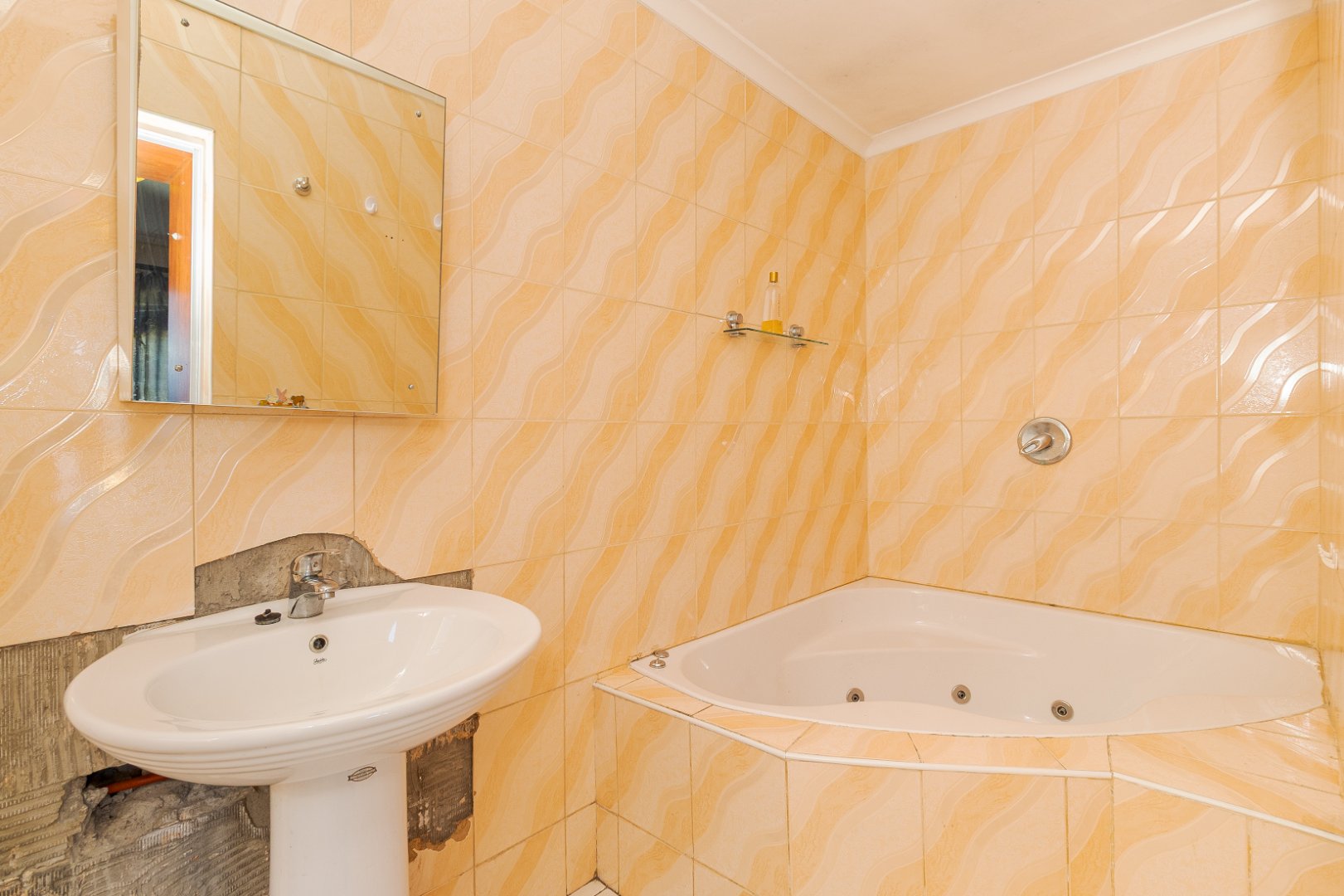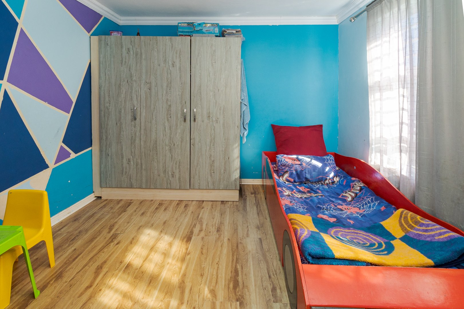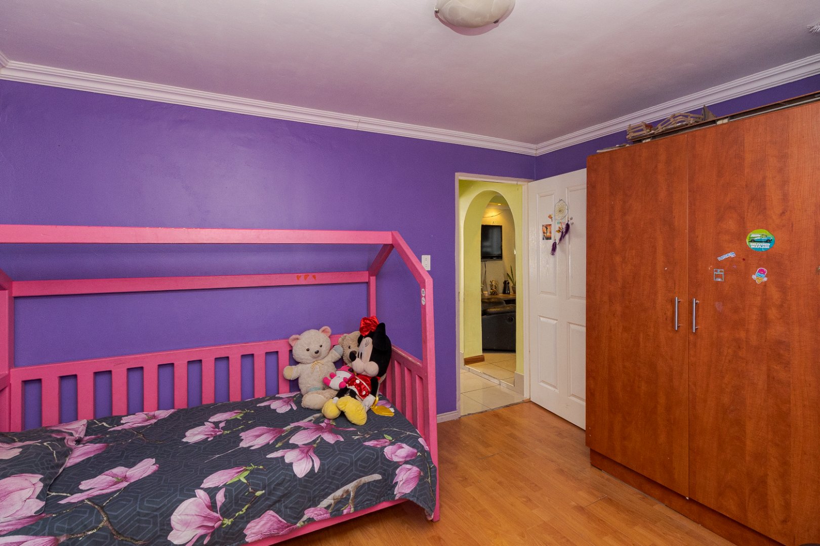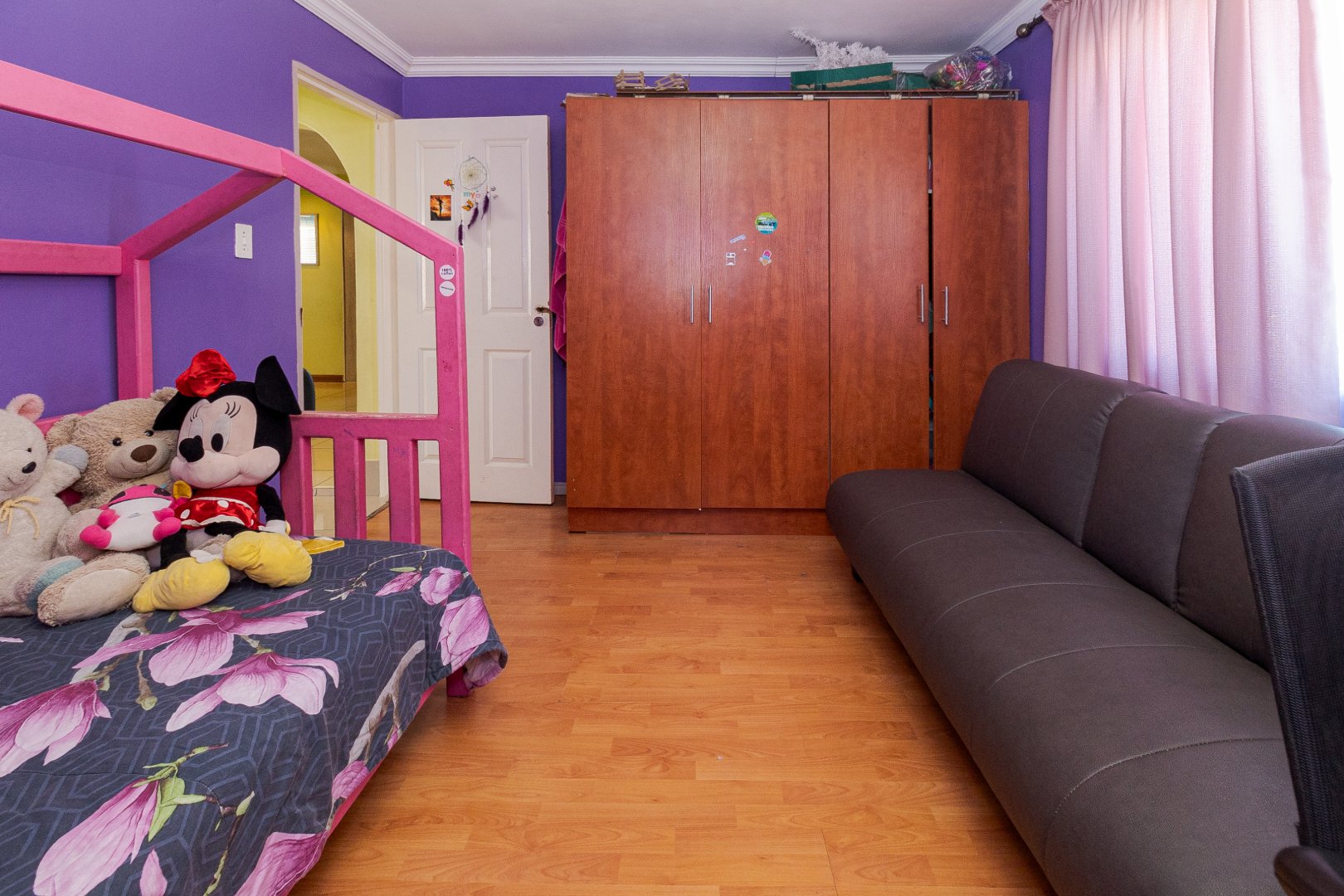 The home features four spacious bedrooms, all with built-in cupboards and laminate flooring, providing ample accommodation for a growing family. The main bedroom includes a private en-suite bathroom with spa-bath, while a second full bathroom caters to the remaining bedrooms.