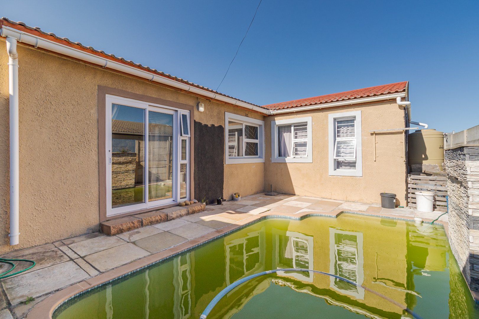 Step outside to enjoy a well-sized swimming pool—perfect for Cape Town summers and weekend gatherings. The property also includes a secure garage with parking for two vehicles, adding both convenience and peace of mind.