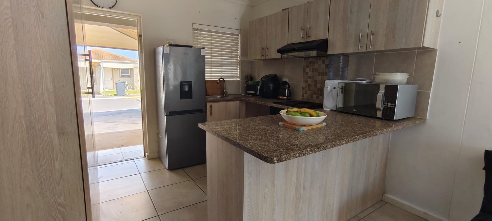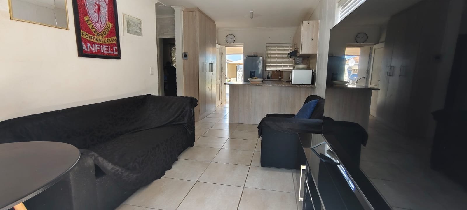 Fully tiled kitchen, lounge and bathroom.