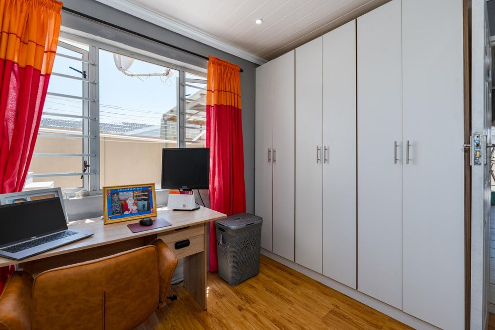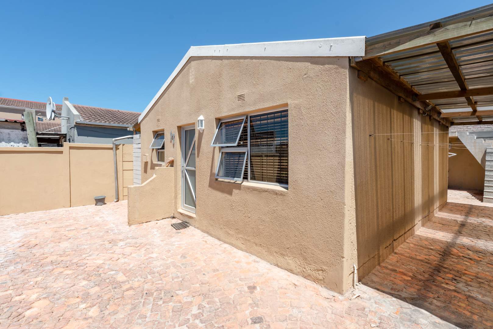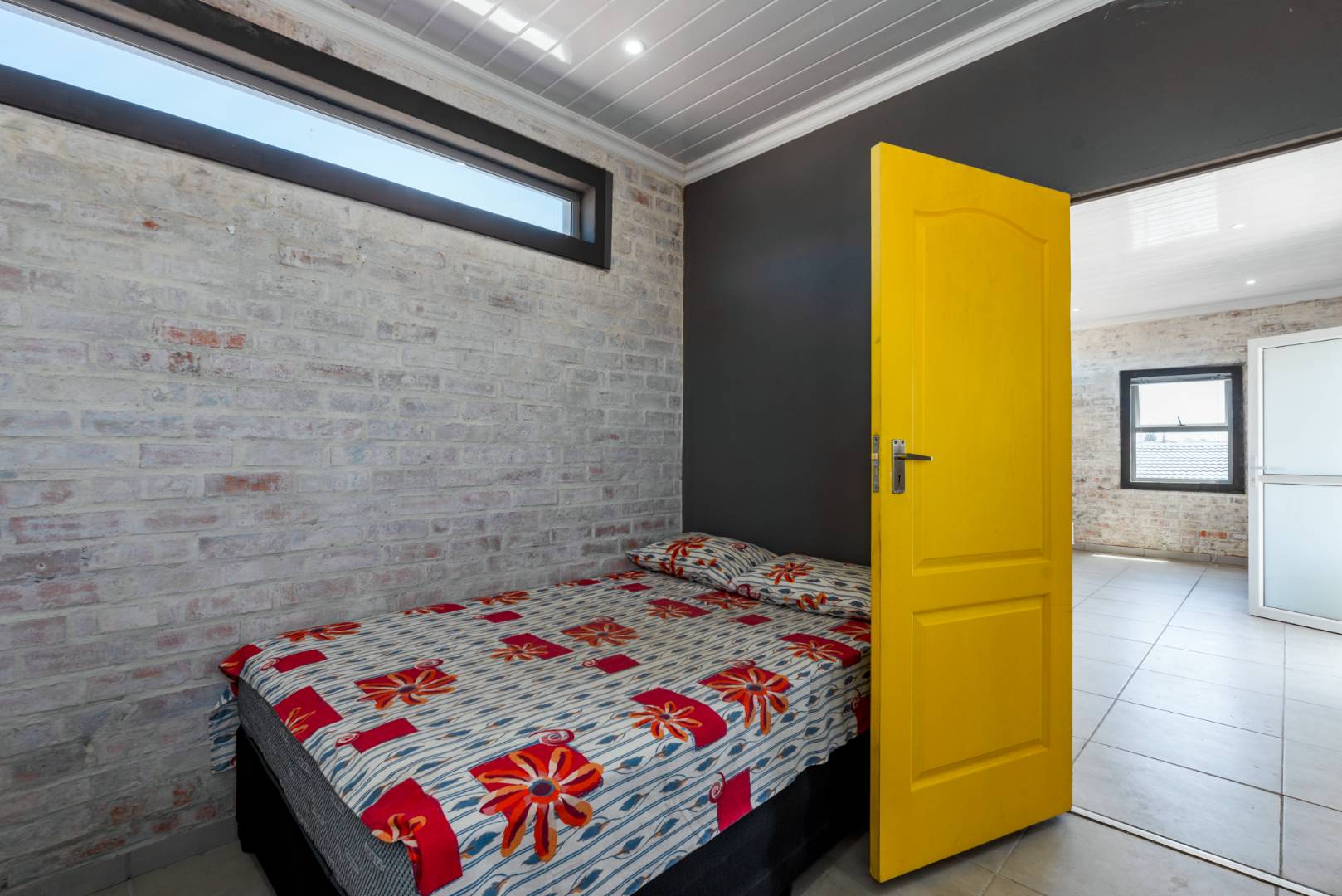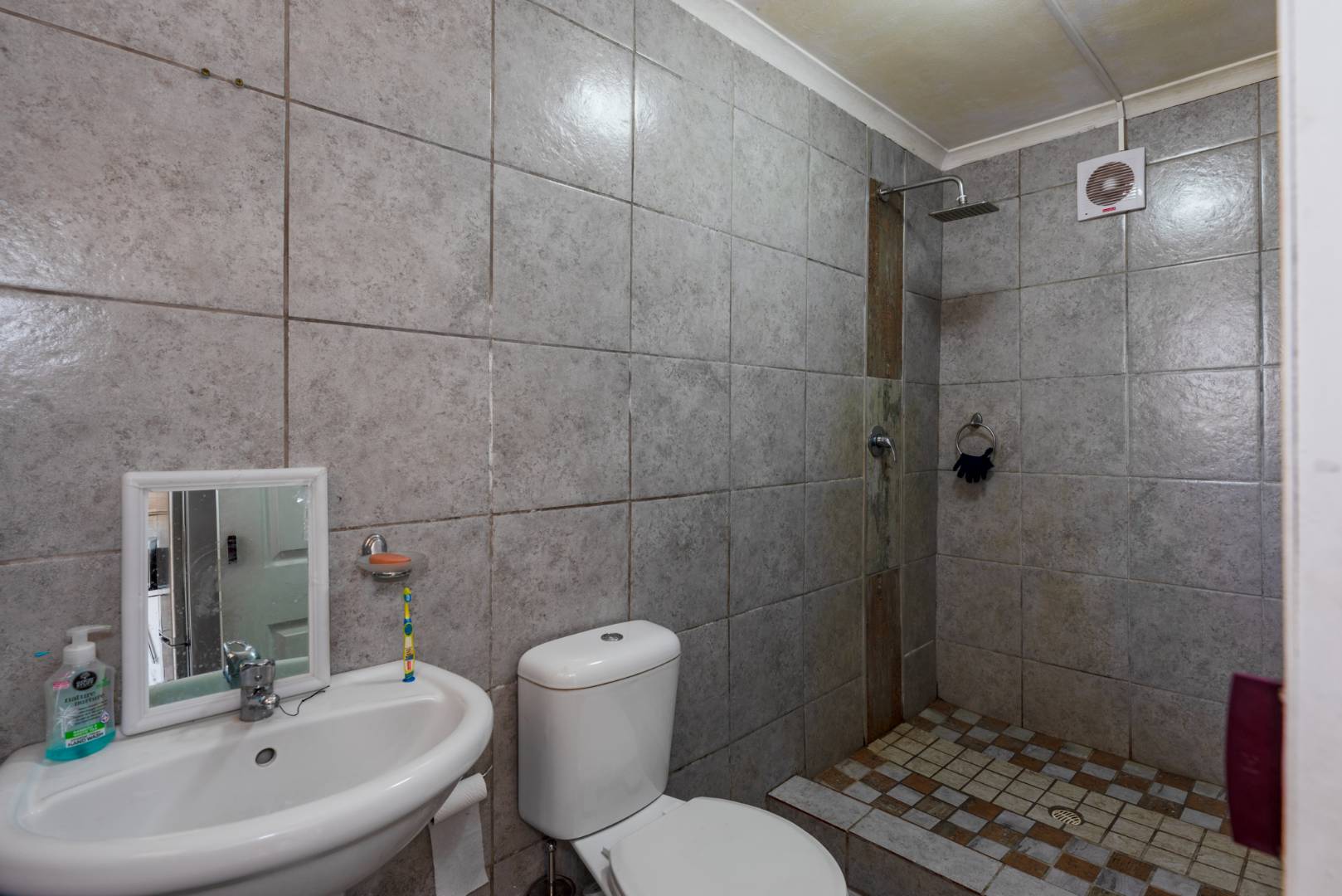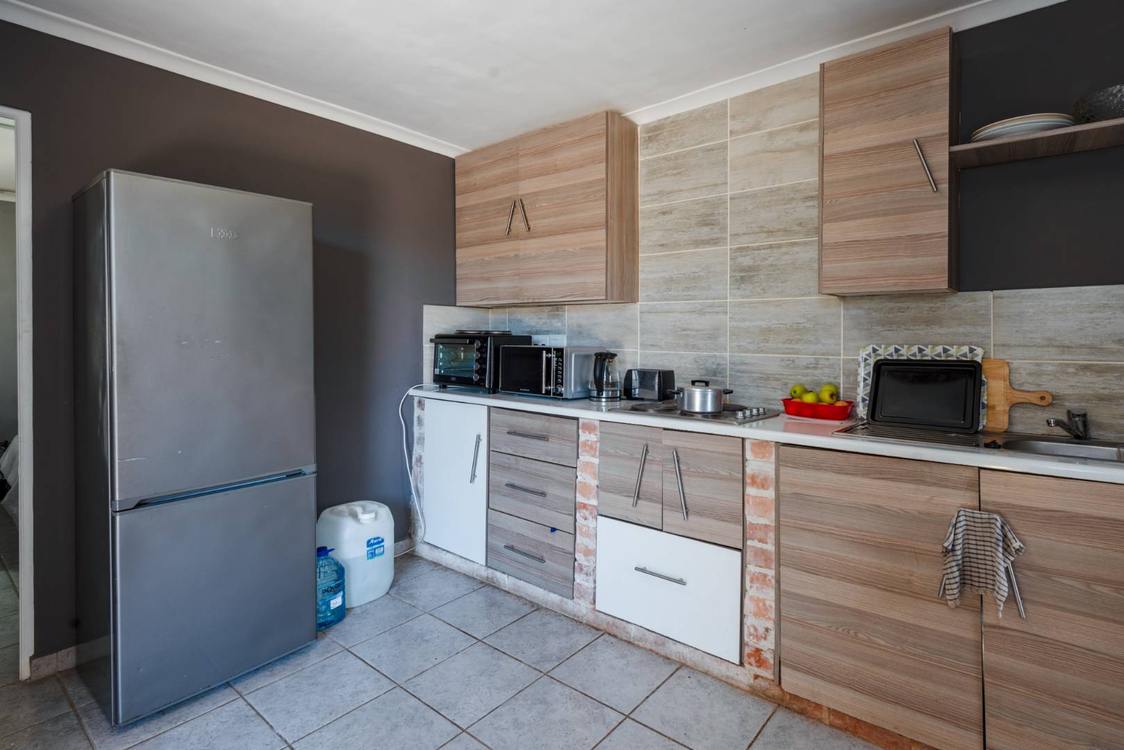 The main house features a neat open-plan kitchen and lounge area, fully tiled and offering ample built-in cupboard space for convenient storage. The home boasts three well-sized bedrooms, all fitted with built-in cupboards and laminated flooring. The main bedroom is generously sized and enhanced with a stylish feature wall. A full family bathroom completes the main house, fitted with a sunken bath, shower, toilet, and basin.