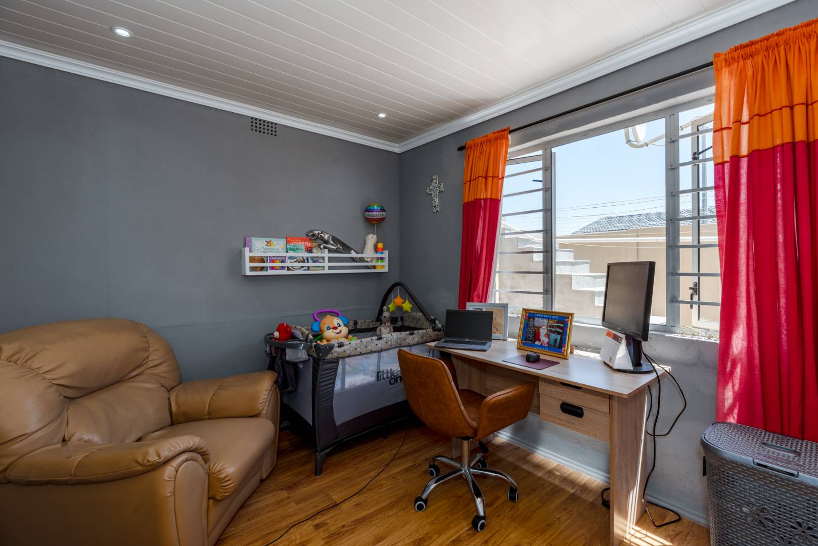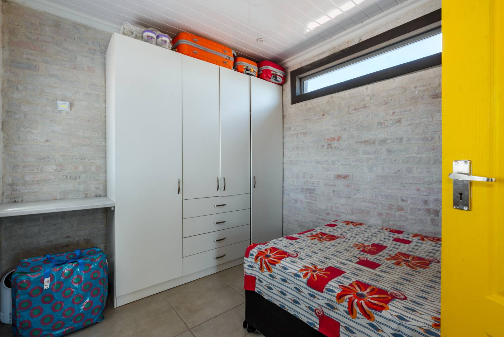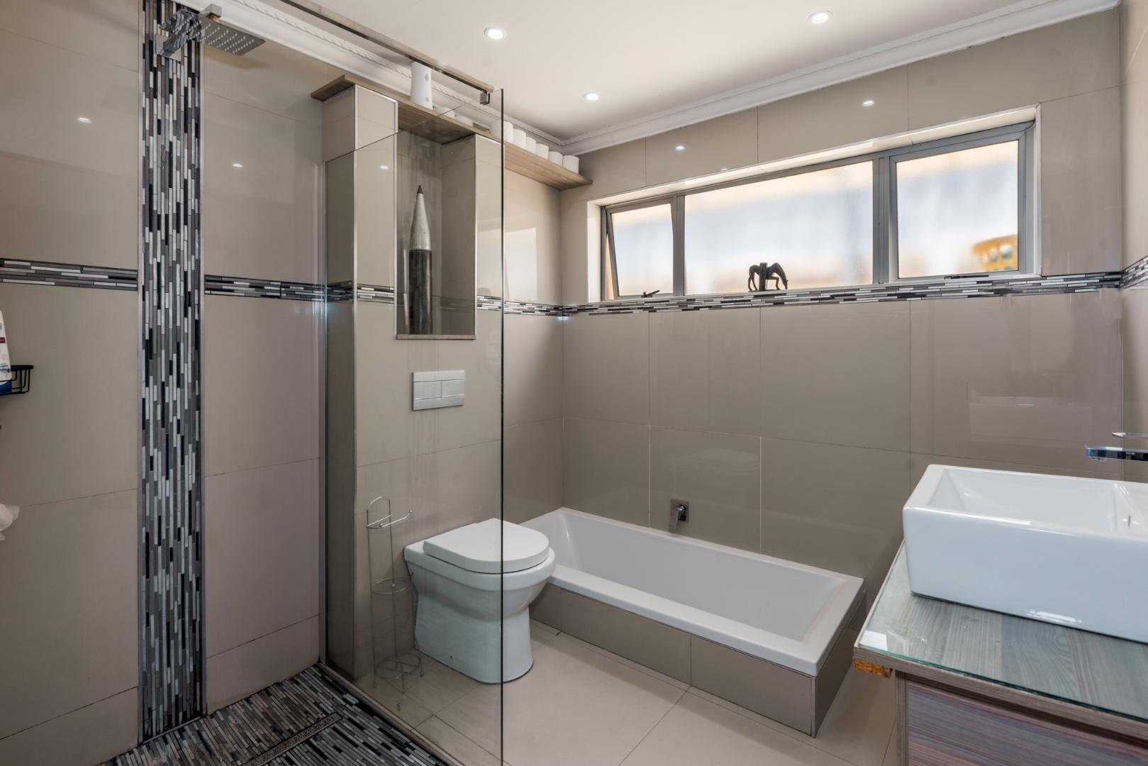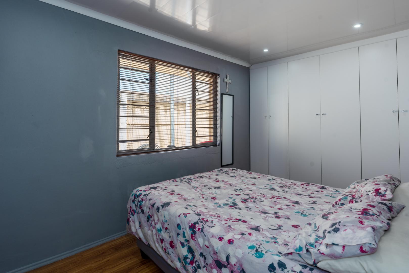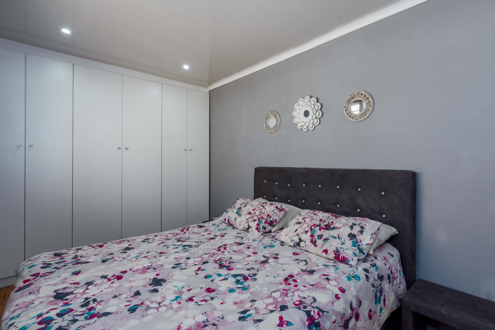 The main house features a neat open-plan kitchen and lounge area, fully tiled and offering ample built-in cupboard space for convenient storage. The home boasts three well-sized bedrooms, all fitted with built-in cupboards and laminated flooring. The main bedroom is generously sized and enhanced with a stylish feature wall. A full family bathroom completes the main house, fitted with a sunken bath, shower, toilet, and basin.