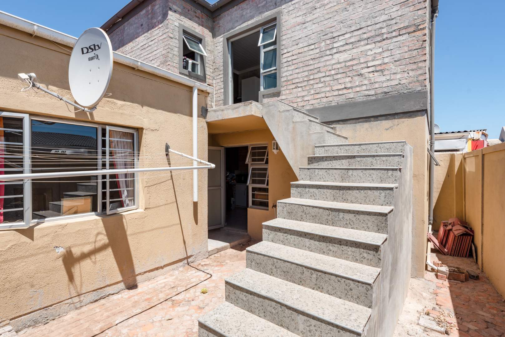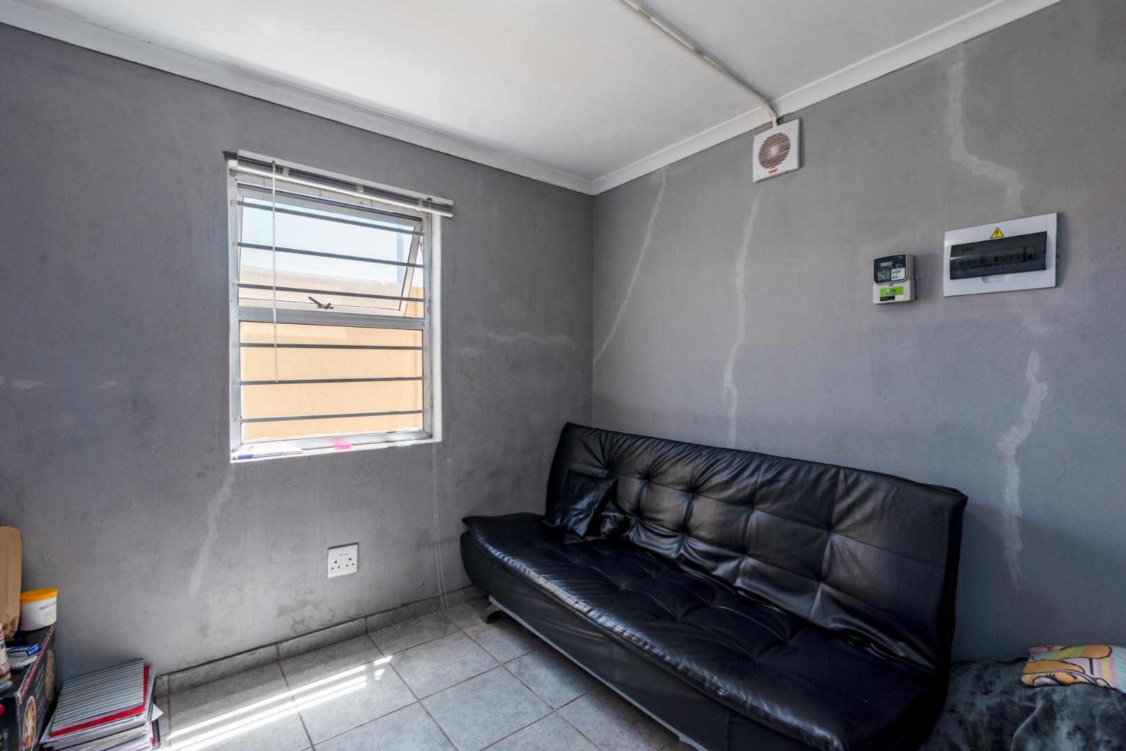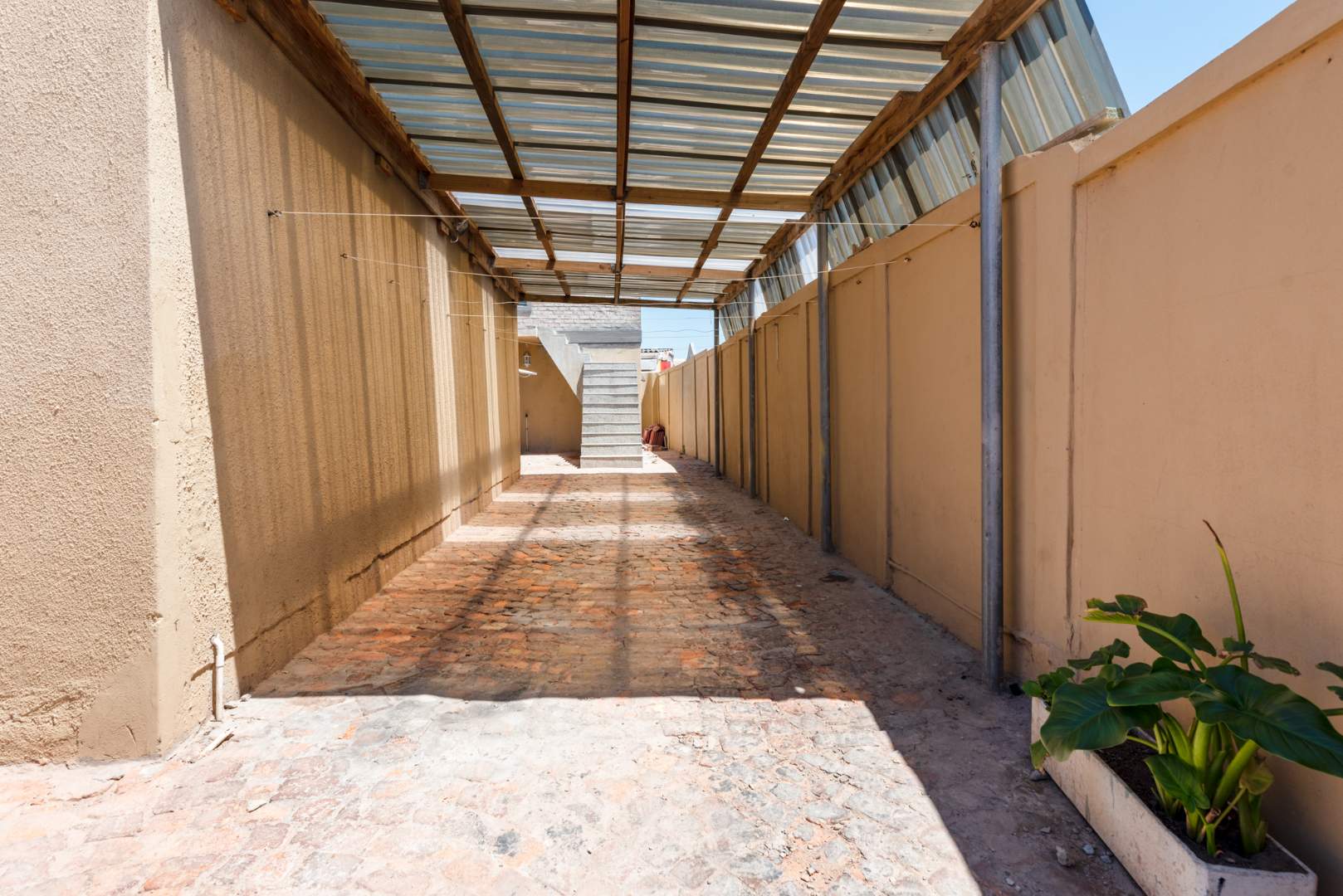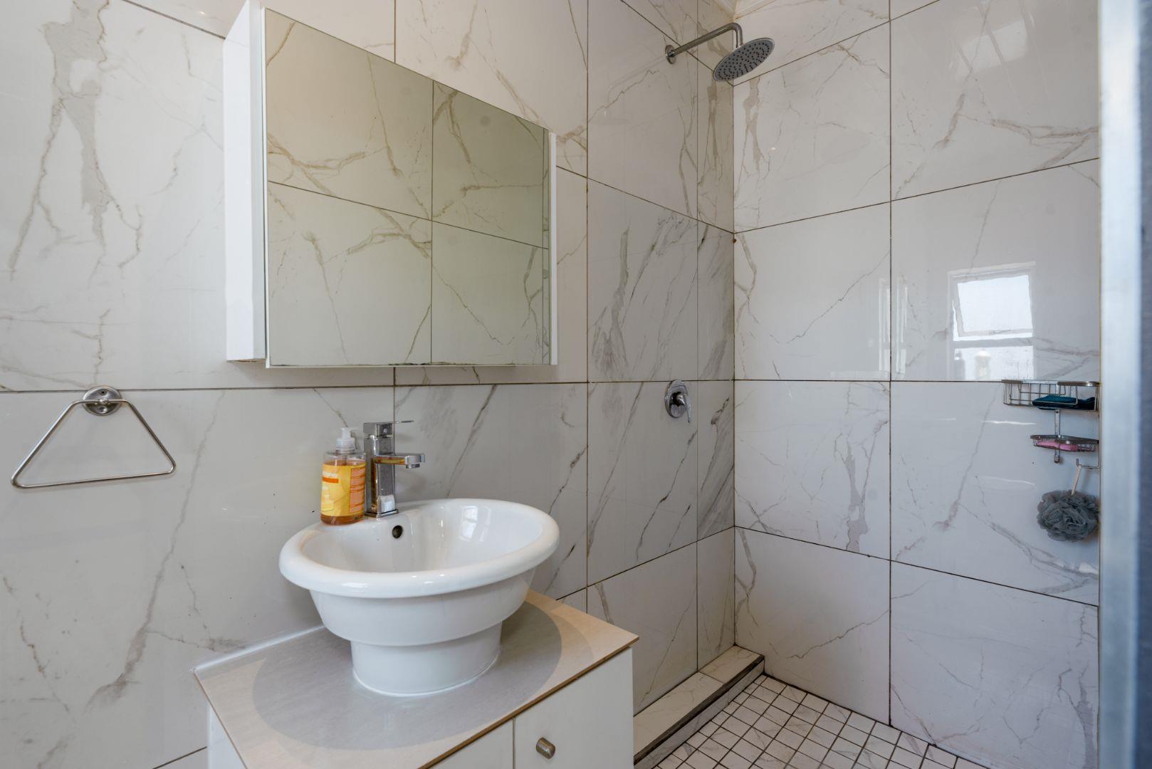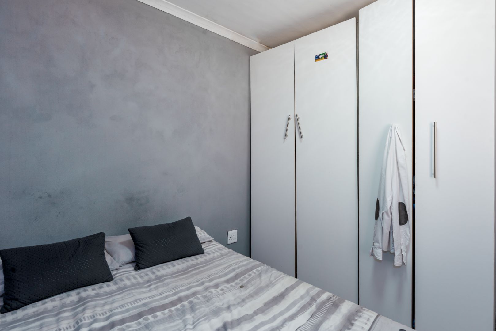 The main house features a neat open-plan kitchen and lounge area, fully tiled and offering ample built-in cupboard space for convenient storage. The home boasts three well-sized bedrooms, all fitted with built-in cupboards and laminated flooring. The main bedroom is generously sized and enhanced with a stylish feature wall. A full family bathroom completes the main house, fitted with a sunken bath, shower, toilet, and basin.