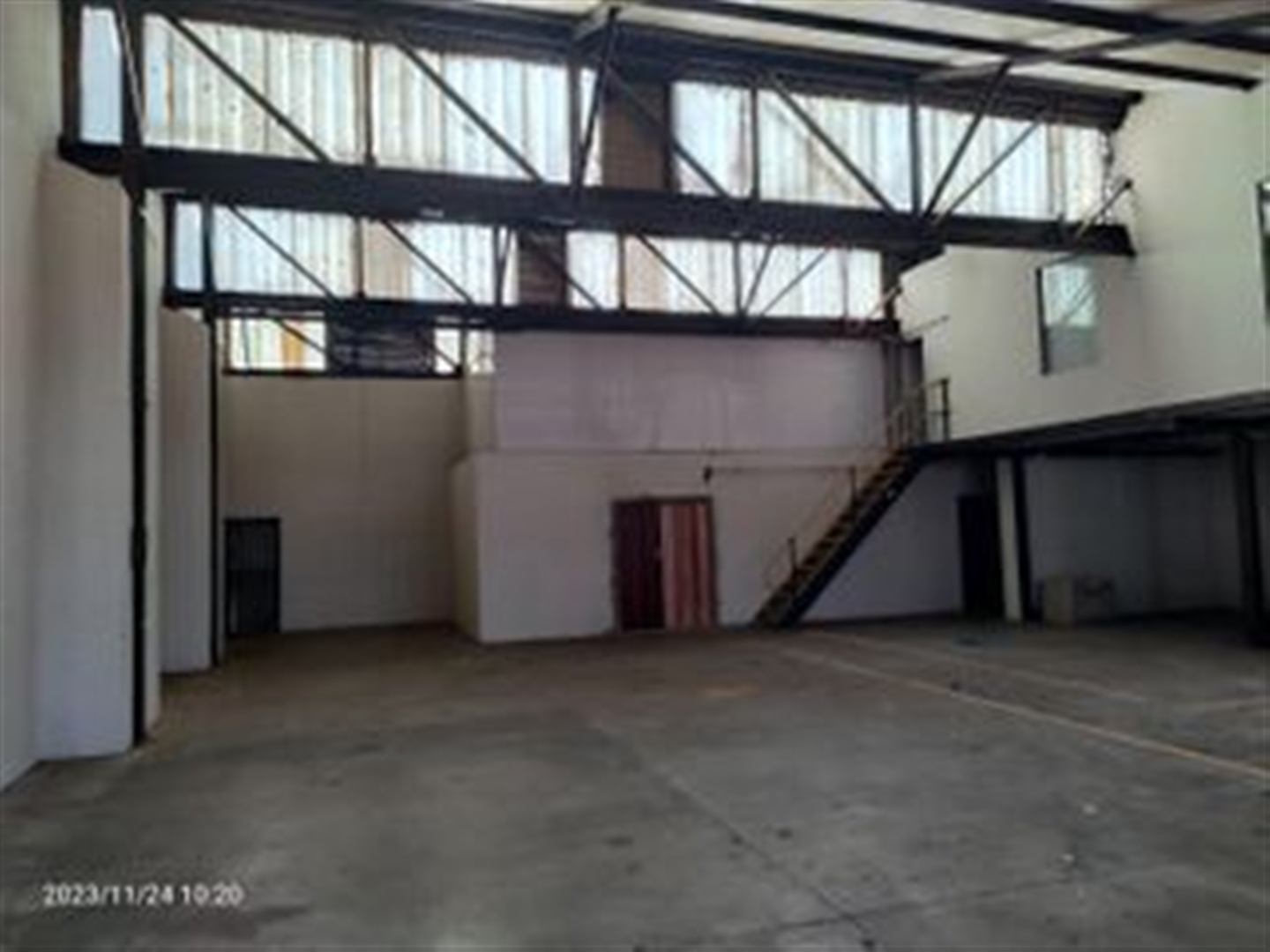 The warehouse has a large sliding door and a mezzanine for additional storage. The rear of the building has a large yard and a covered car parking area.