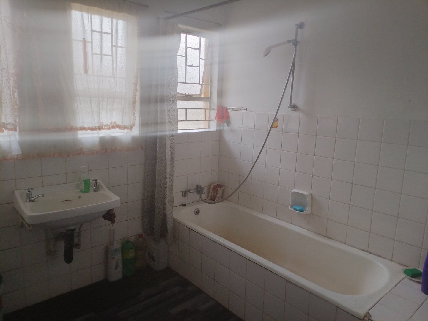 - One spacious bathroom consisting of bath with shower railing and shower hose and basin plus