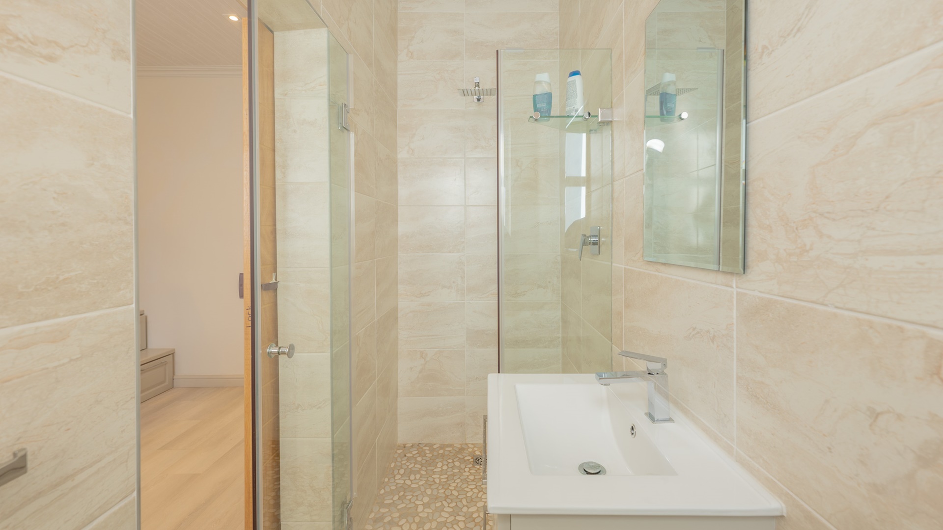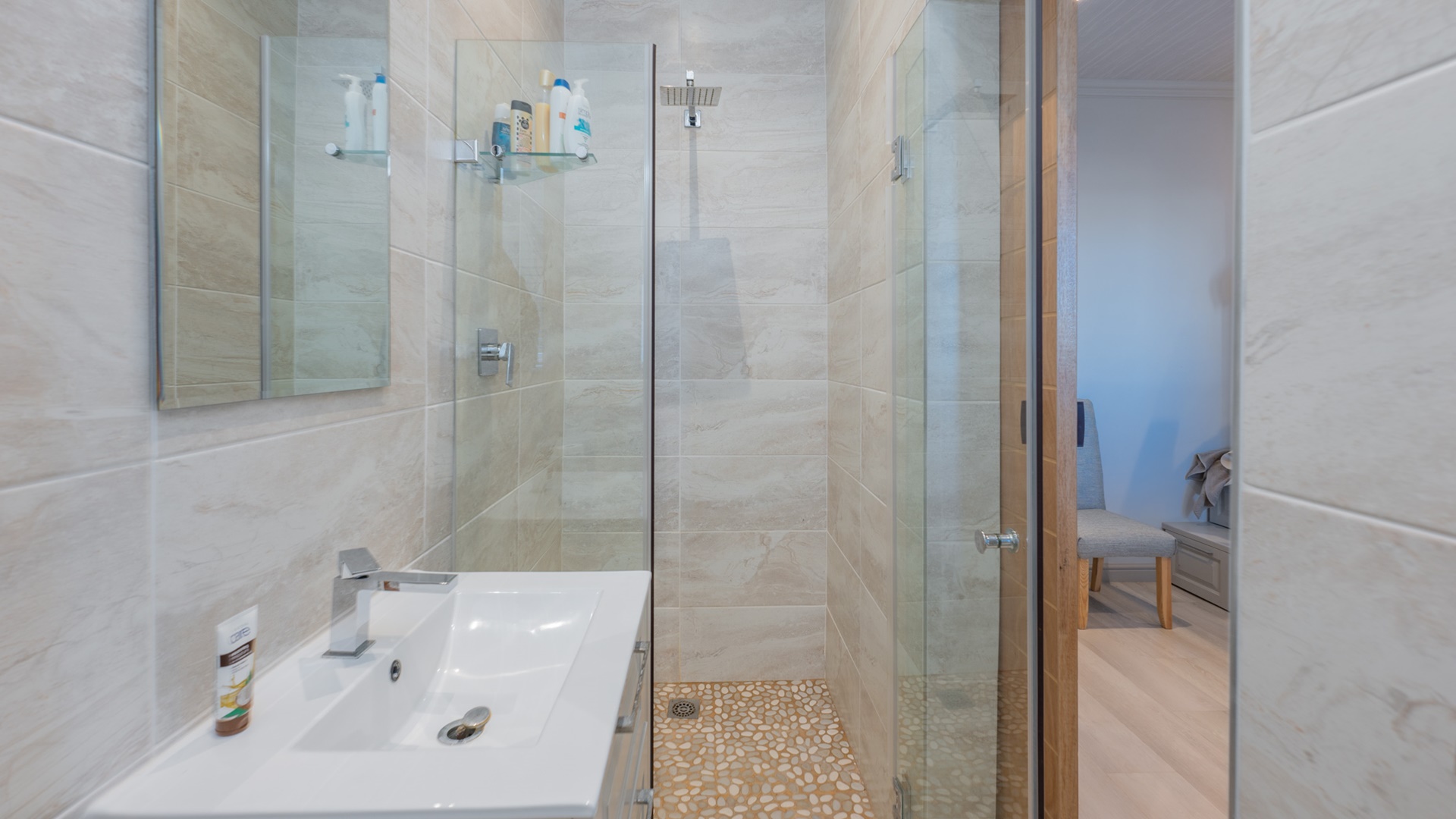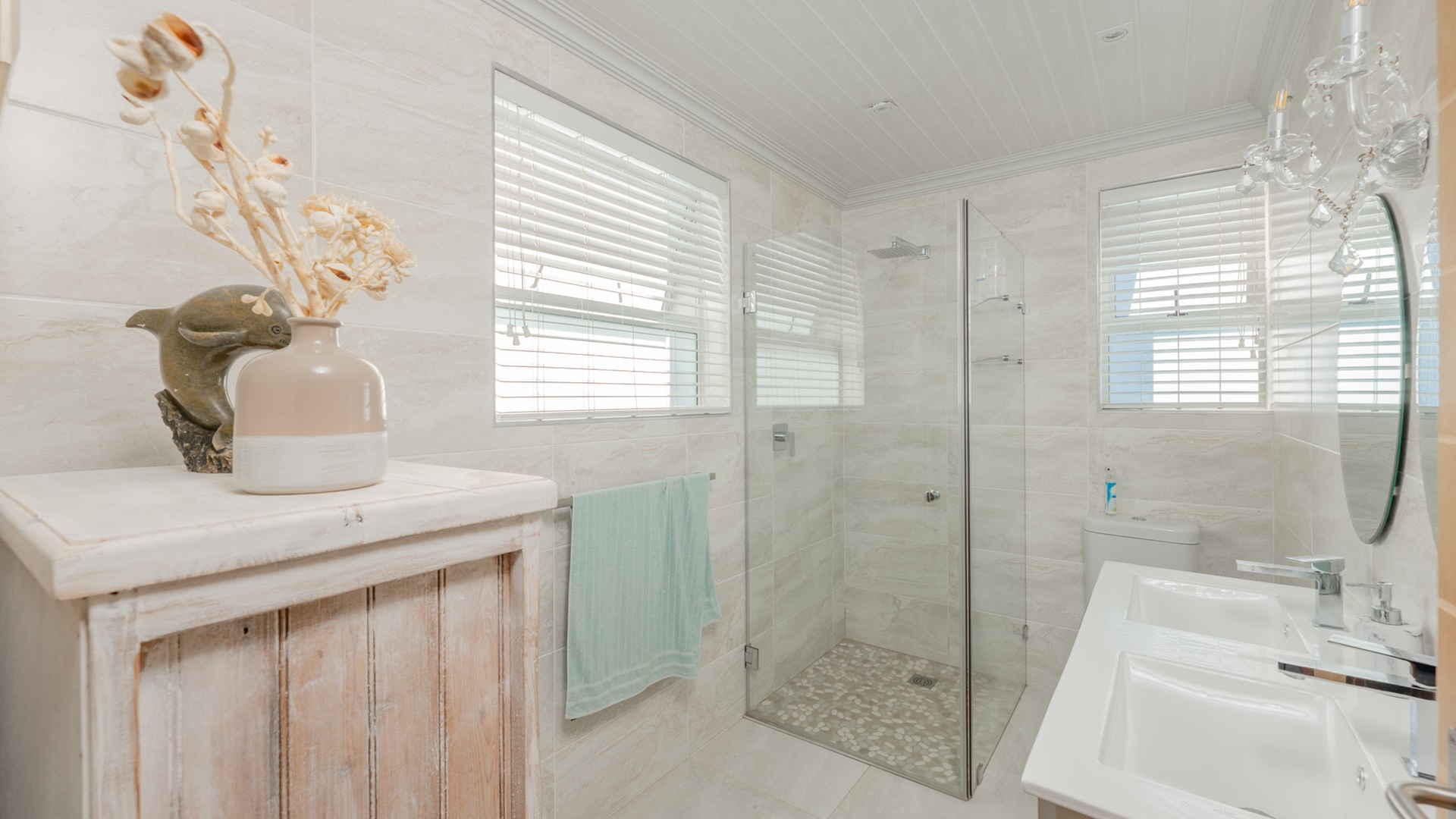 Continuing forward, you'll discover a built-in braai with a closed combustion fireplace, creating a cozy atmosphere for gatherings. Nearby, a well-appointed guest bathroom ensures convenience for your visitors. The first floor also boasts two luxurious ensuite bedrooms, both facing the ocean and opening onto the heated infinity pool, where you can soak in the views and unwind.