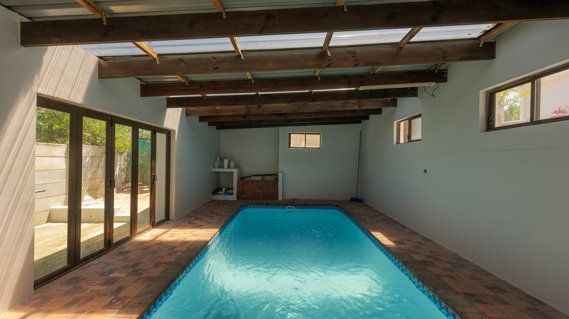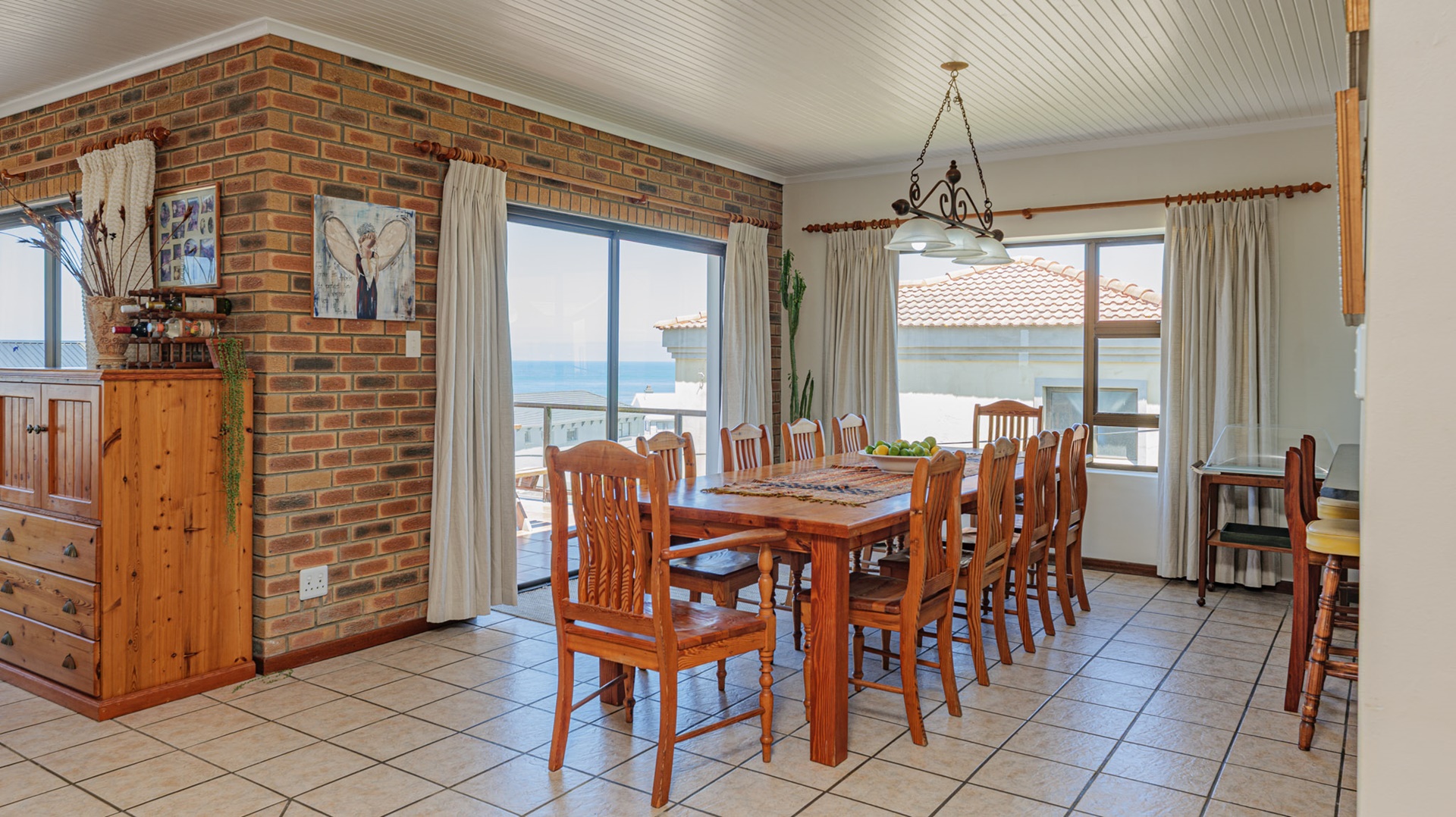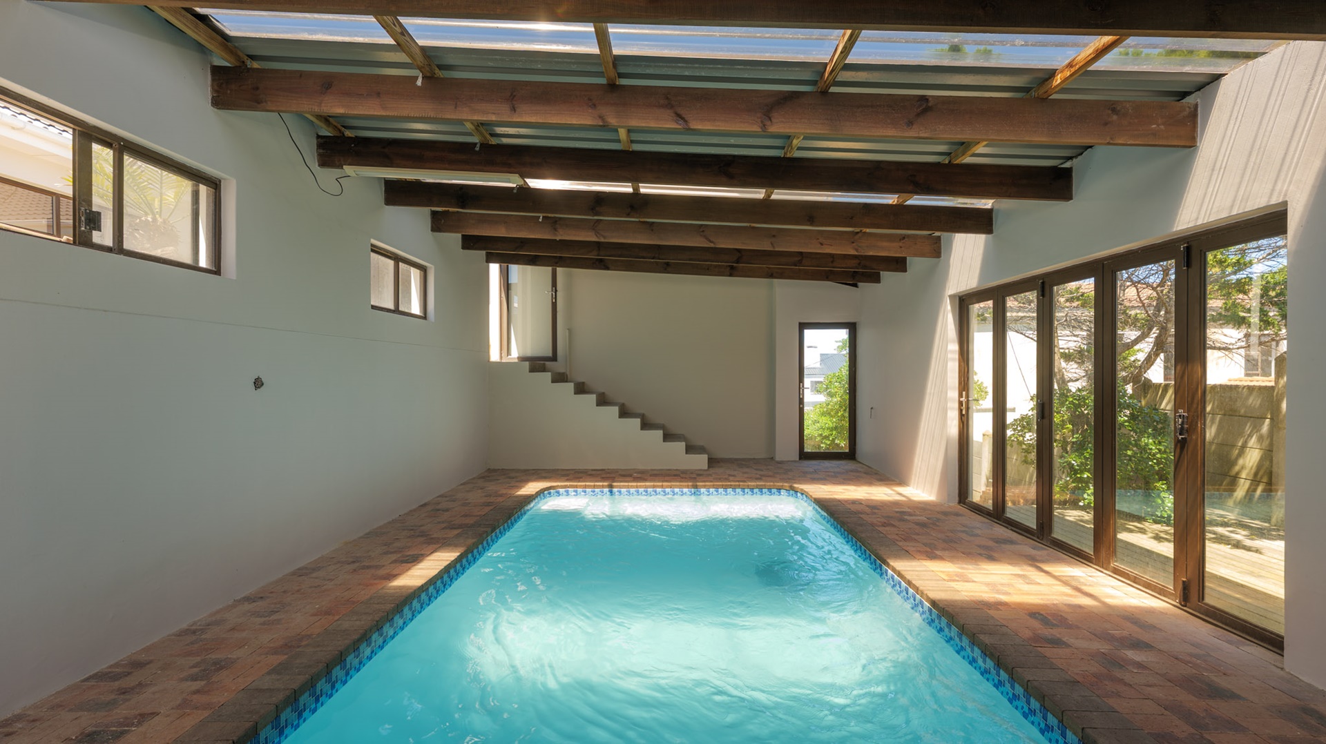 Upstairs features an open-plan layout where the dining room, dual lounge areas, and kitchen flow seamlessly together, creating a warm and welcoming atmosphere perfect for both family living and entertaining. One of the lounges includes an indoor braai and opens through sliding doors to a balcony with incredible sea views. From the open-plan area, a private courtyard offers a quiet outdoor retreat, and from here, steps lead down to a beautiful indoor swimming pool area, perfect for year-round enjoyment.