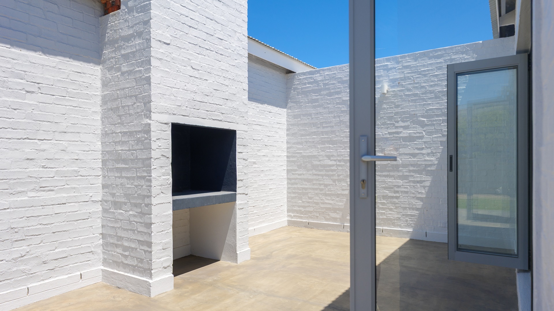 - Open plan living area with two sets of stacker doors leading to the garden with a big tree and outside braai area
