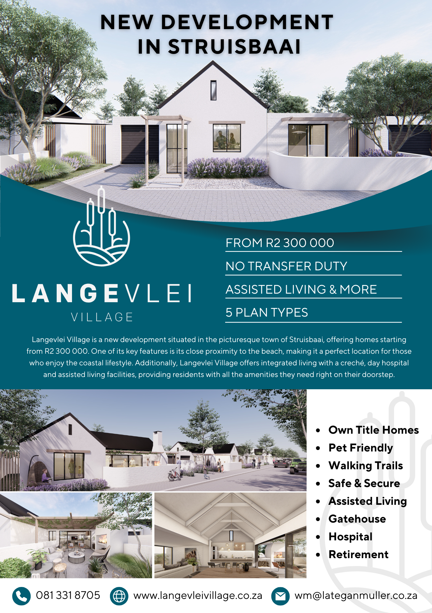 Langevlei Village is a brand-new residential development in the beautiful seaside town of Struisbaai, offering modern own-title homes from R2,300,000. Perfectly positioned just moments from the beach, it’s an ideal choice for anyone who dreams of a relaxed coastal lifestyle while still enjoying convenience, comfort, and connected living.