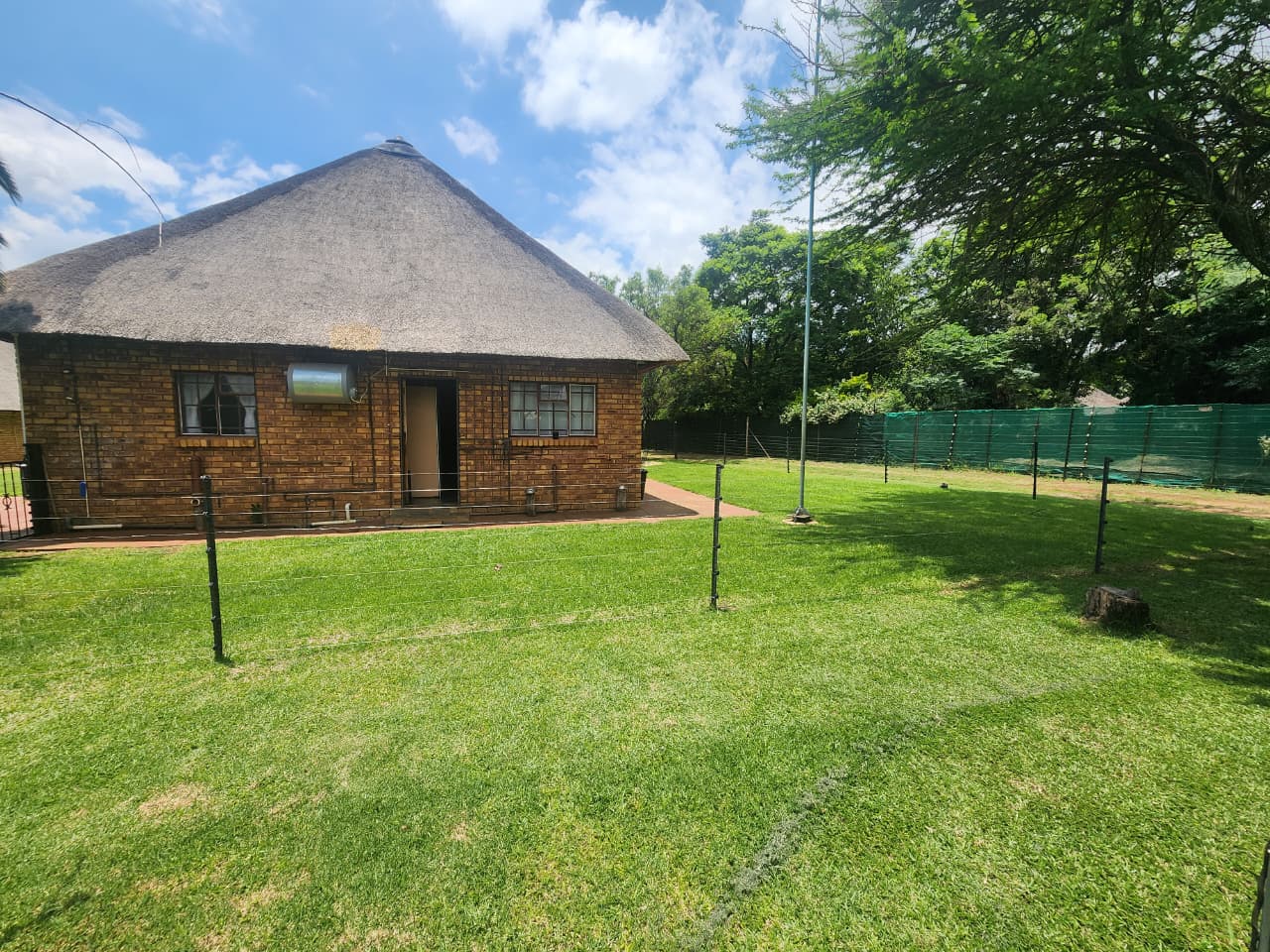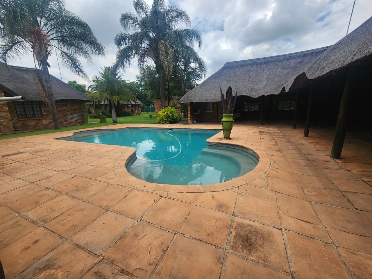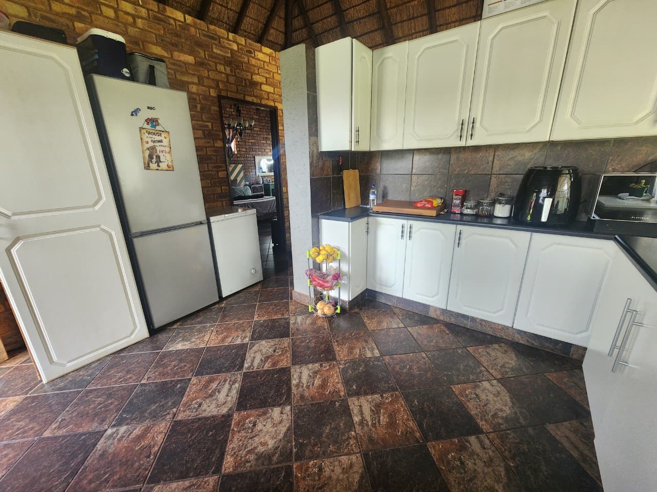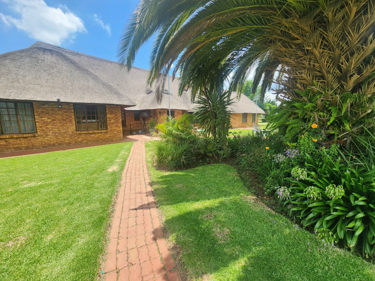 Situated in Strydfontein, this 4.2ha small holding offers approximately 981sqm total building coverage, with the main residence measuring around 420sqm. The thatched roof home is fully tiled throughout and comprises 4 bedrooms, 2 full bathrooms including 1 en-suite, a spacious open living area, and an additional versatile living space ideal for a home office or formal lounge. The kitchen is fitted with a gas stove and the home includes a loft area. A separate 1 bedroom flatlet offers a living area, kitchen with gas stove, and a full en-suite bathroom, also fully tiled. The property further includes a 3-car carport positioned in front of the main house, an additional 4-car carport adjacent to storage space, and multiple sheds for equipment and property maintenance.
