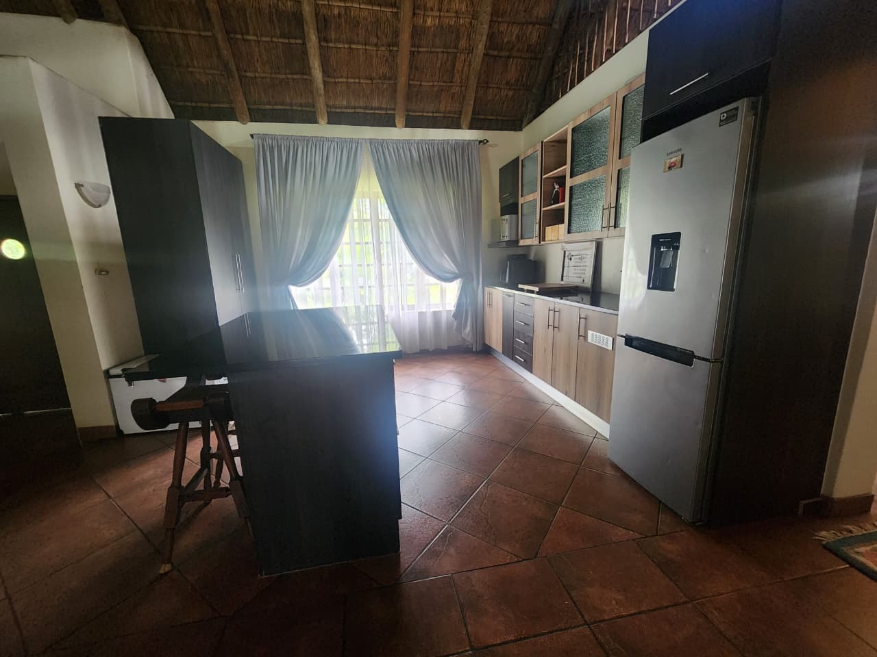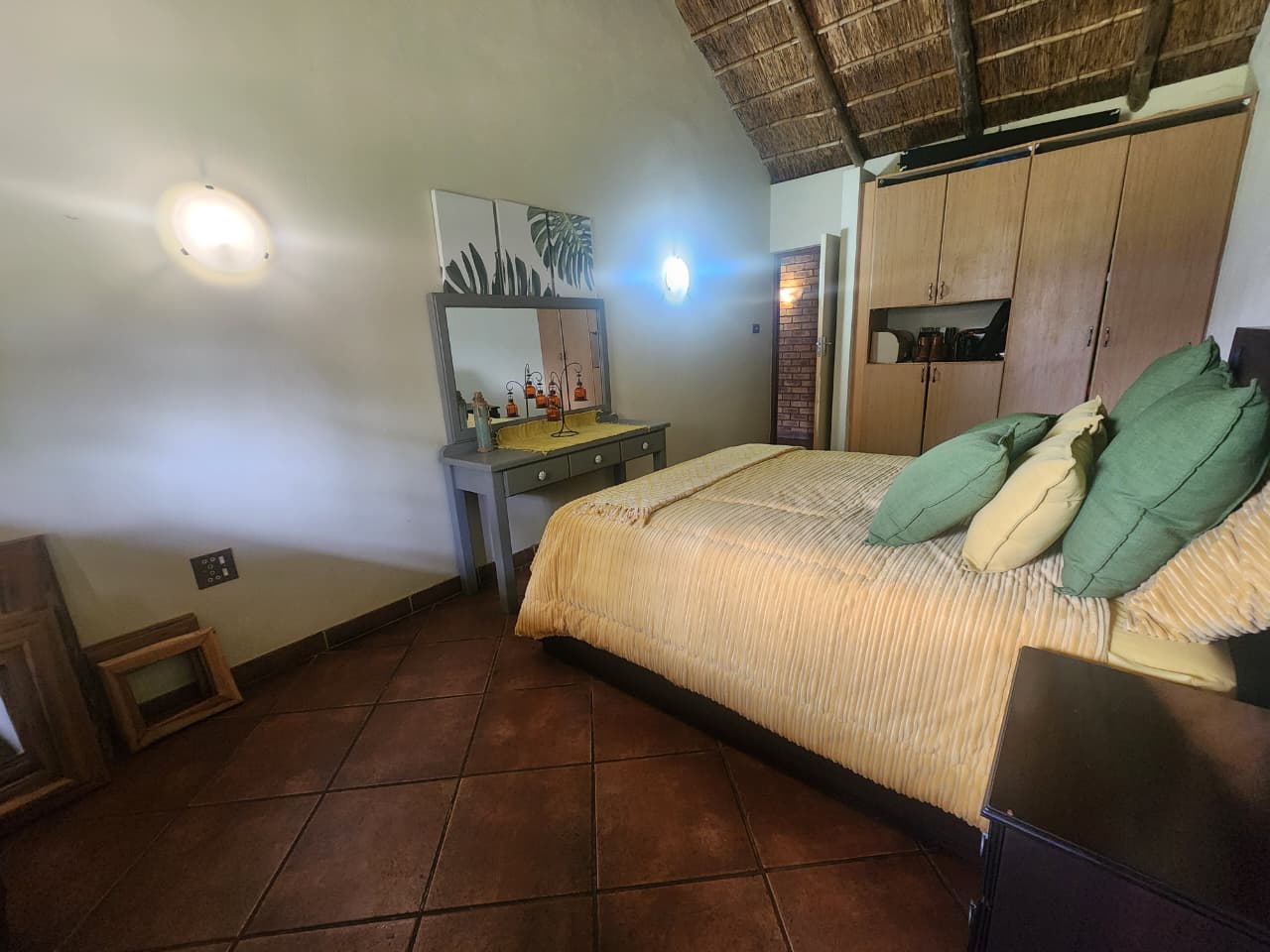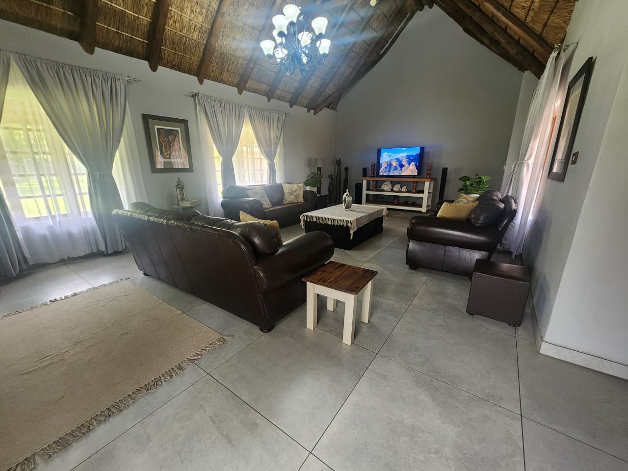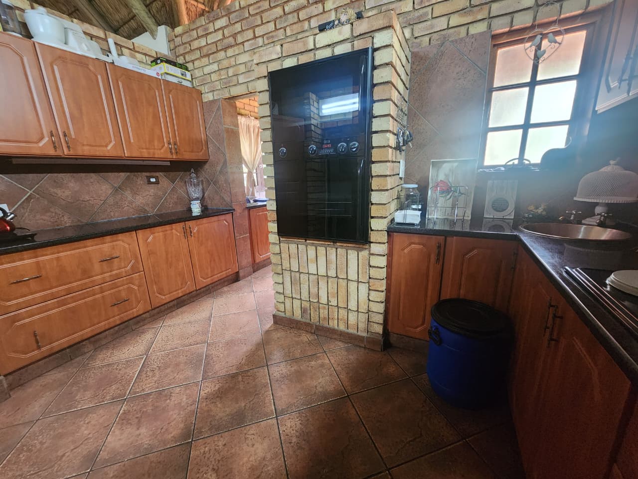 Situated in Strydfontein, this 4.2ha small holding offers approximately 981sqm total building coverage, with the main residence measuring around 420sqm. The thatched roof home is fully tiled throughout and comprises 4 bedrooms, 2 full bathrooms including 1 en-suite, a spacious open living area, and an additional versatile living space ideal for a home office or formal lounge. The kitchen is fitted with a gas stove and the home includes a loft area. A separate 1 bedroom flatlet offers a living area, kitchen with gas stove, and a full en-suite bathroom, also fully tiled. The property further includes a 3-car carport positioned in front of the main house, an additional 4-car carport adjacent to storage space, and multiple sheds for equipment and property maintenance.