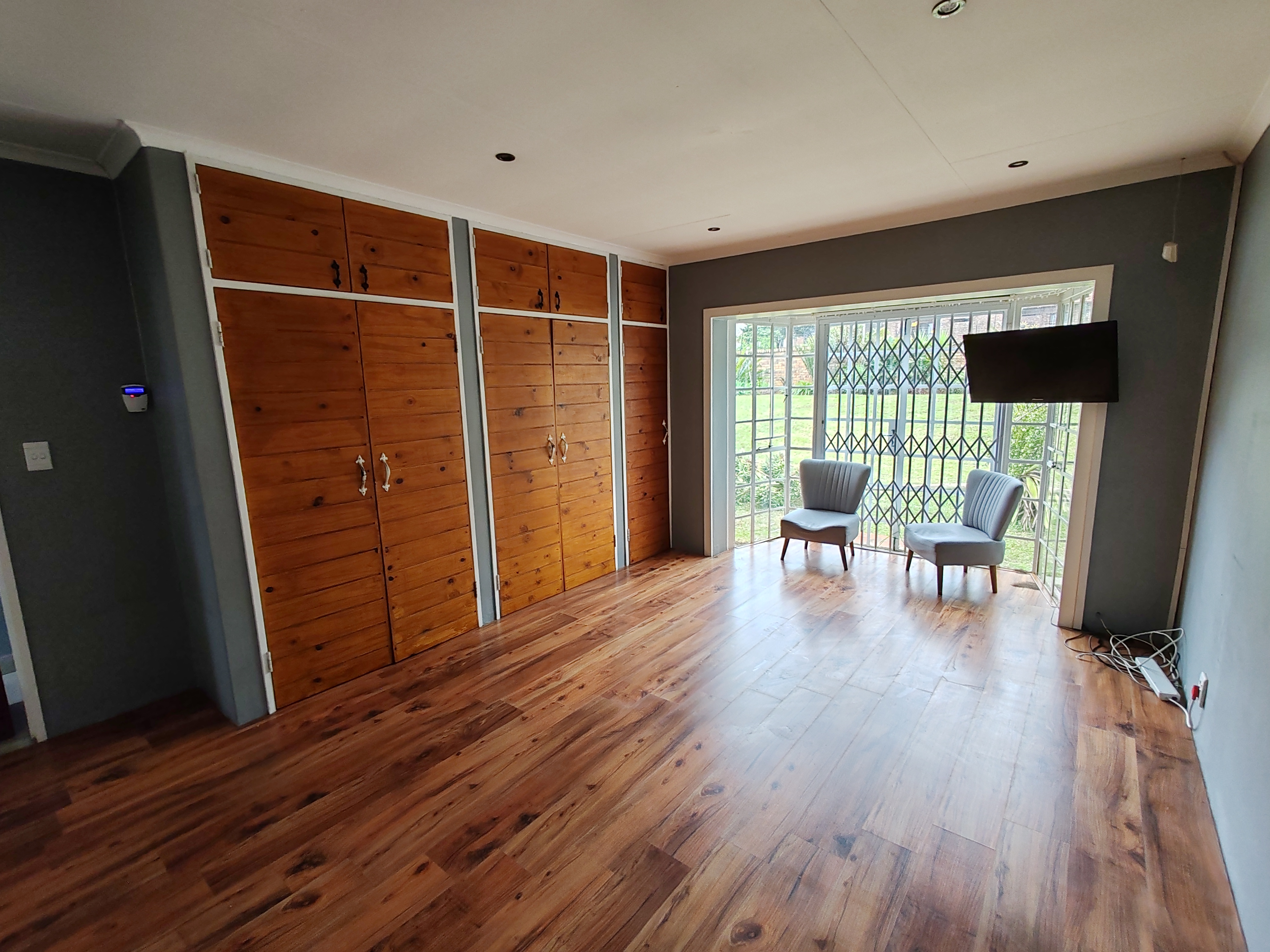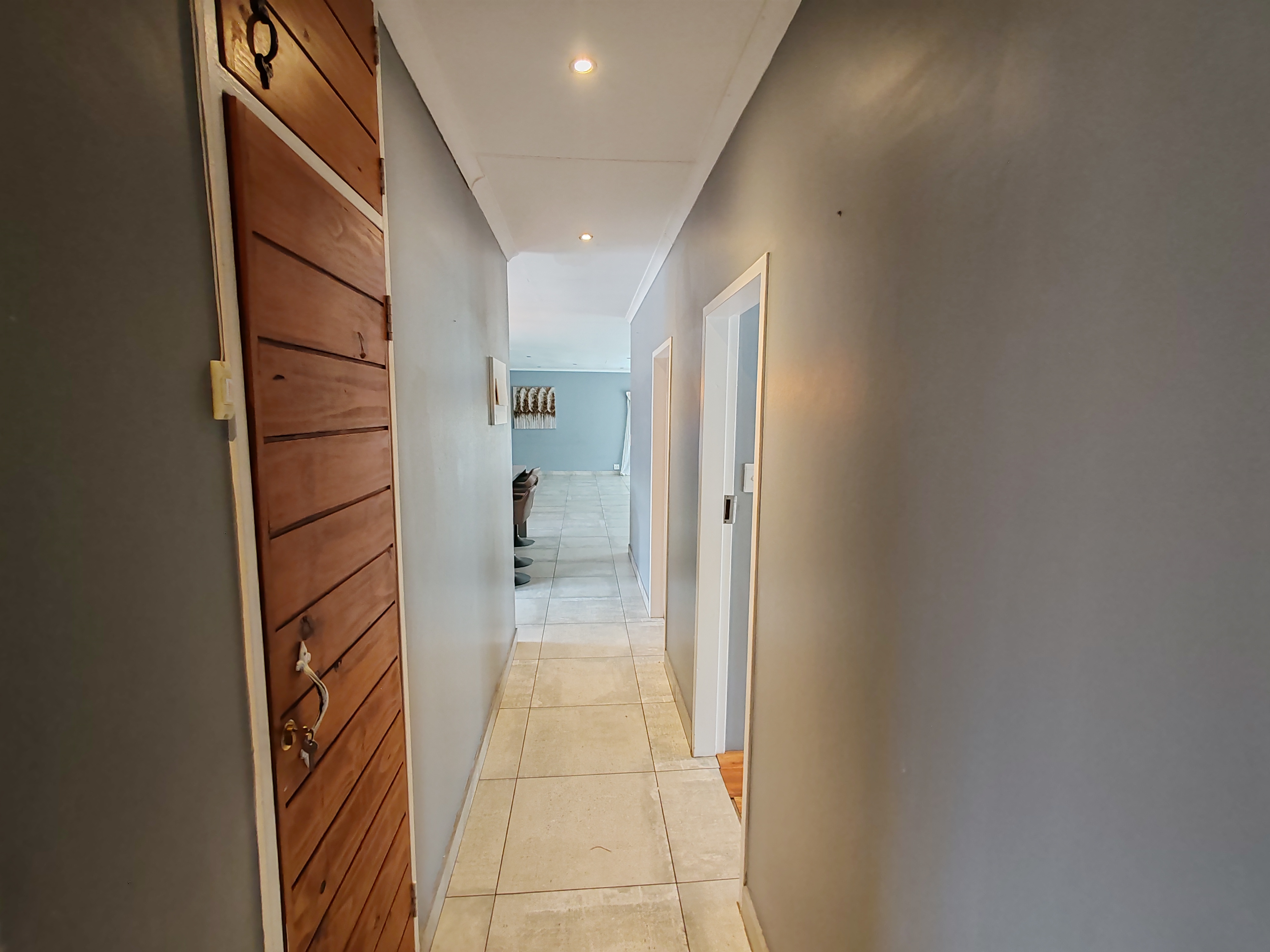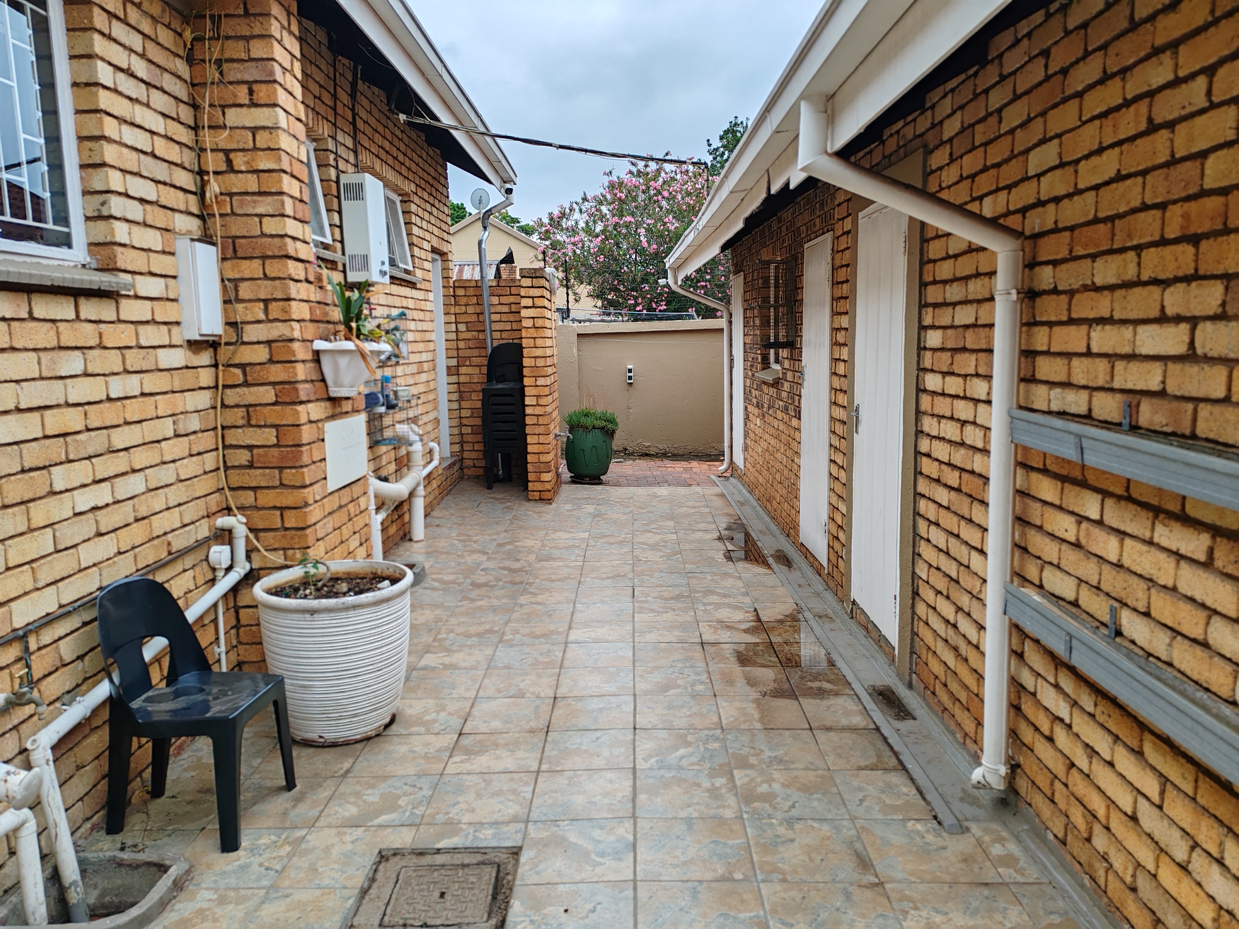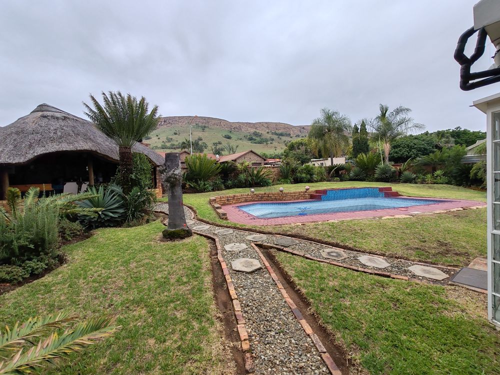 The home features an open-plan lounge, dining area, and kitchen fitted with a gas stove and a separate scullery. A JoJo tank is connected to the borehole, ensuring a reliable water supply, while a solar geyser helps reduce electricity costs. The garden benefits from computerized irrigation for easy maintenance.