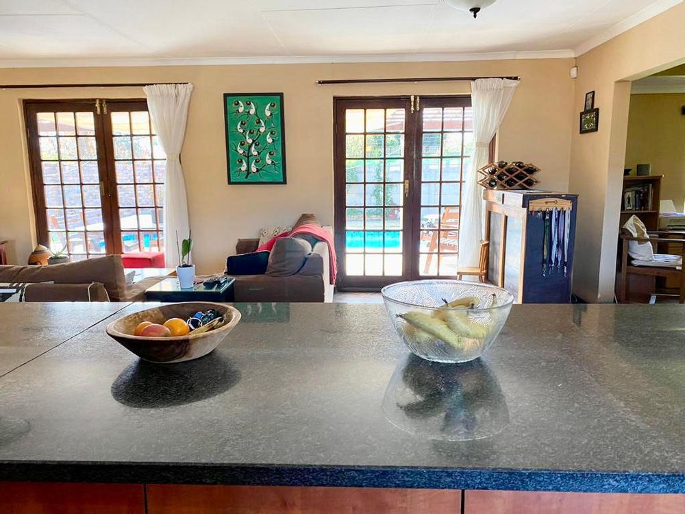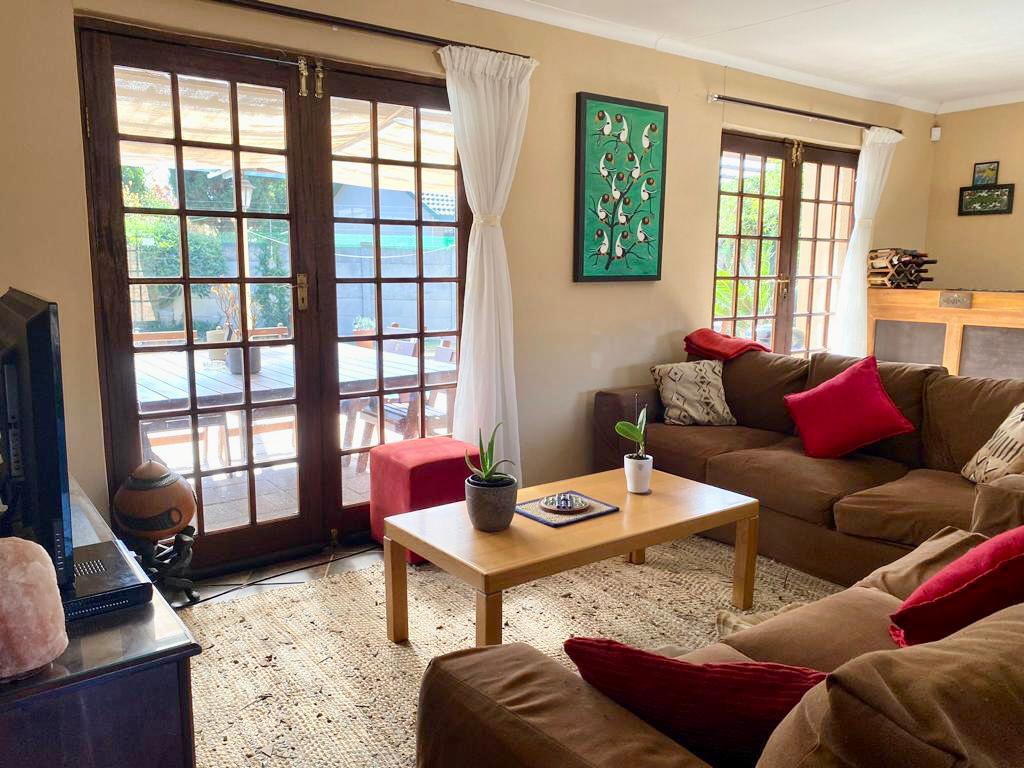 Open plan living area with wooden doors that open up onto a patio area with a built in braai and sparkling blue swimming pool, ideal for entertaining guests and family.