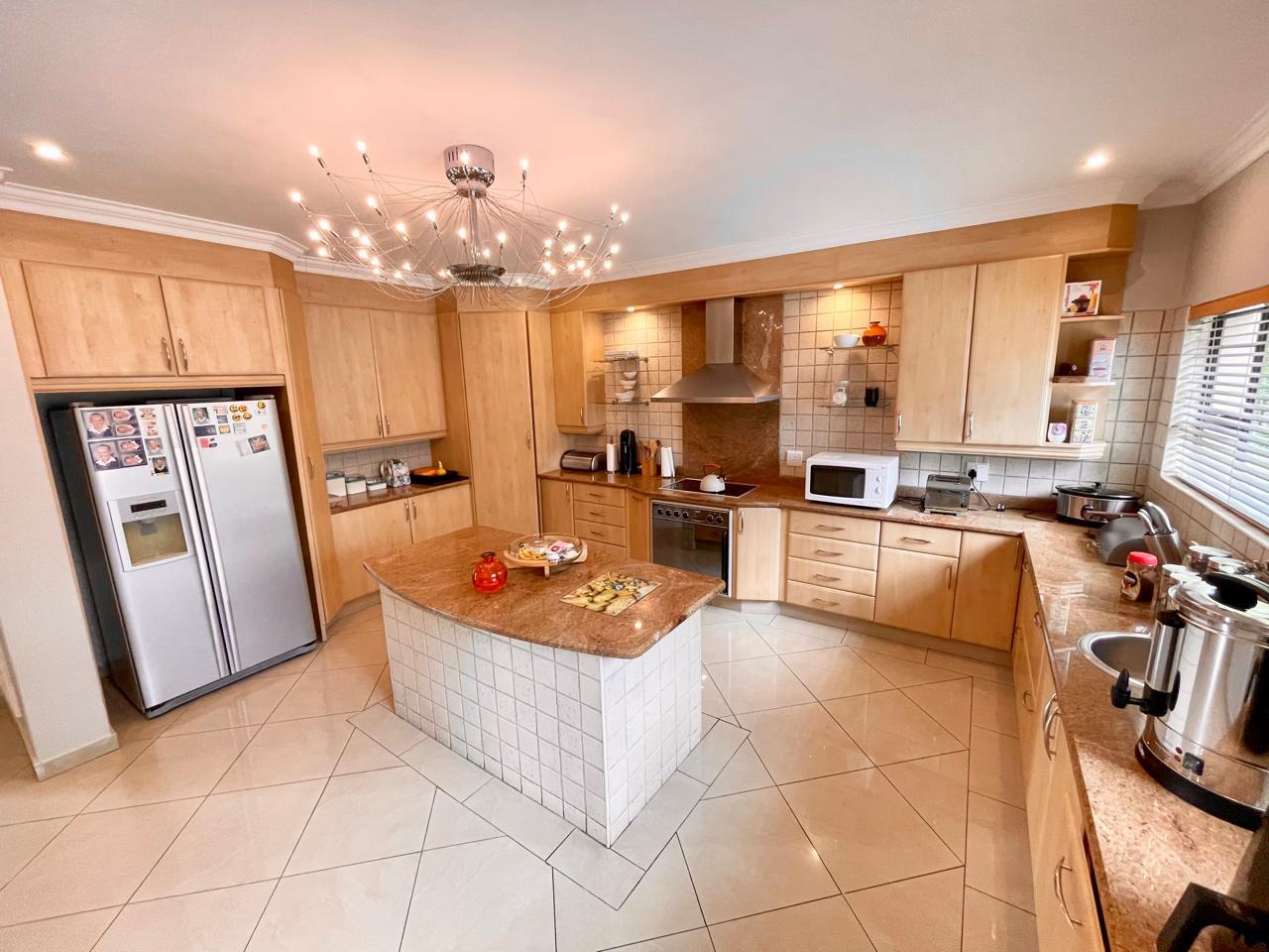 The kitchen epitomizes sophistication with its classy wooden cupboards and granite countertops, illuminated by impressive lighting fixtures. Equipped with modern amenities including an under-counter oven with an electric stove plate, a prepping basin, and a filtration system, it caters to the needs of discerning chefs. Blinds adorn the windows, offering privacy and ambiance, while a spacious scullery, complete with built-in cupboards and all necessary connection points for a dishwasher and washing machine, ensures seamless workflow and organization.
