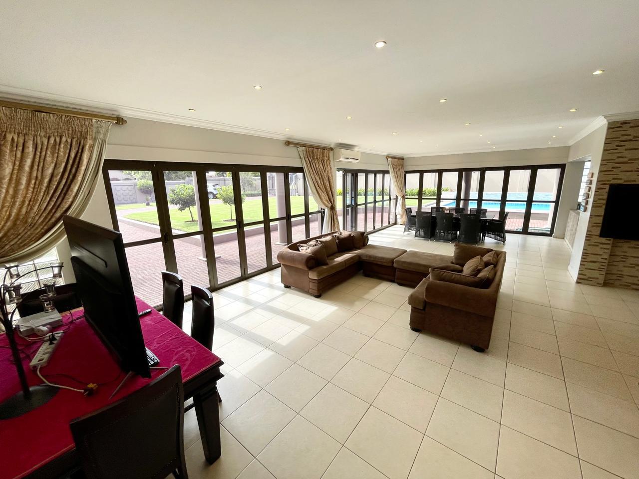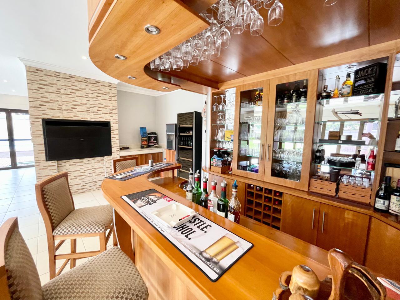 A highlight of this lavish abode is the indoor entertainment area, where tiled floors and aluminium stacking doors seamlessly merge indoor and outdoor spaces. Here, a heated Jacuzzi invites relaxation, while a built-in bar with cupboards and shelves provides the perfect setting for entertaining guests. A built-in braai further enhances the allure of this space, offering the ideal venue for alfresco dining and social gatherings.