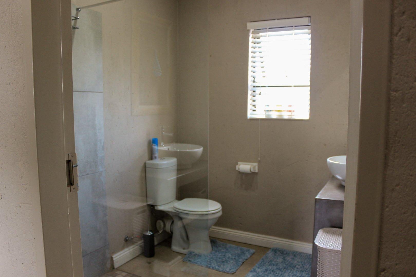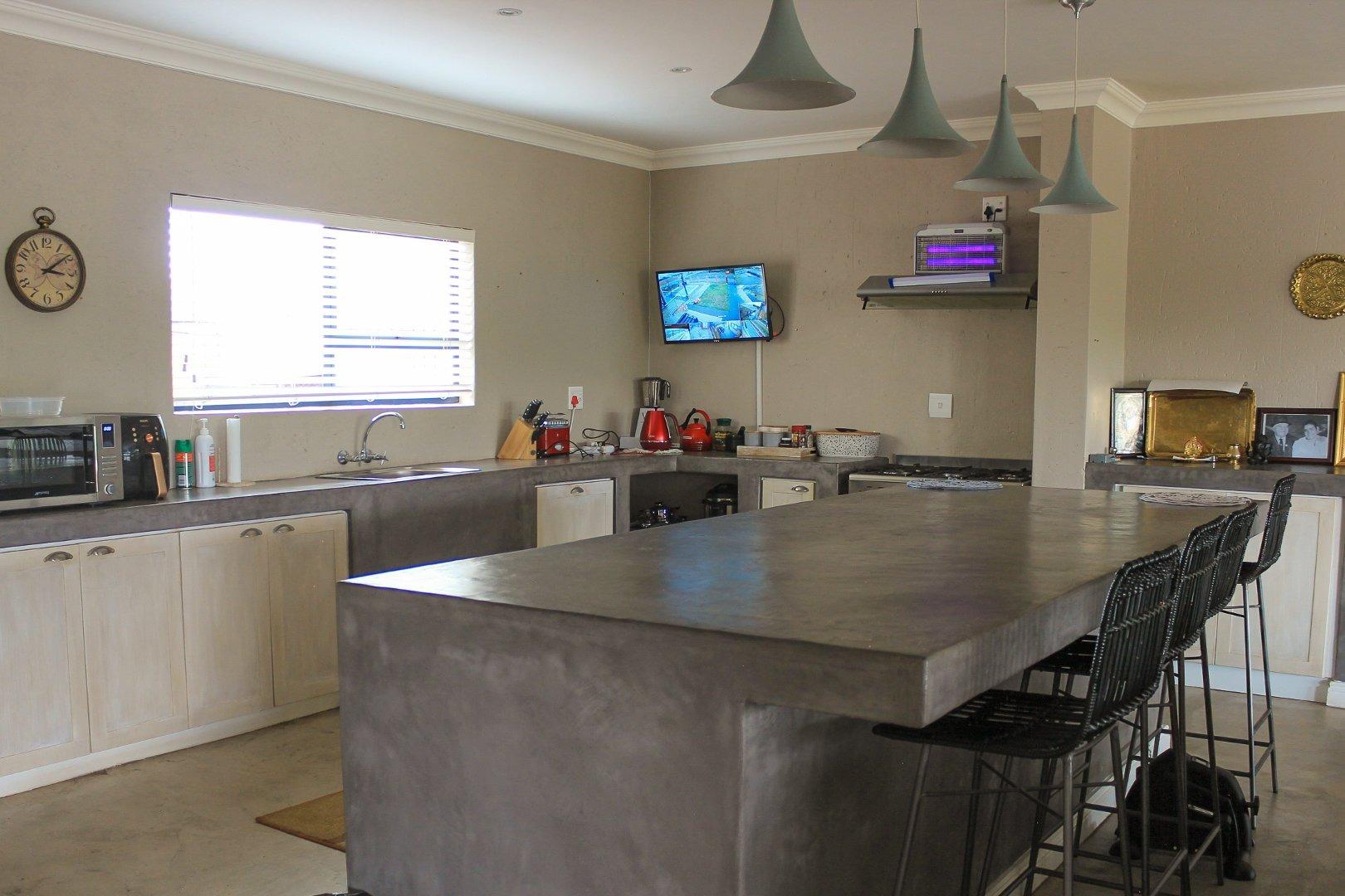 The kitchen is a designer’s dream, featuring cement-finish countertops, open shelving, and a versatile kitchen island, perfect for both cooking and entertaining. A separate scullery adds a touch of practicality to the space. On the ground floor, a generously sized bedroom with an en-suite bathroom ensures privacy and comfort for family or guests.