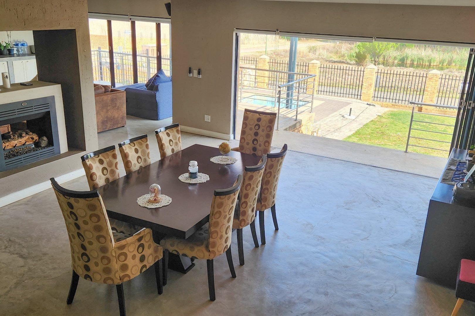 Your tranquil retreat awaits in this gorgeous family home at Summer Place Estate. This immaculate double-story masterpiece is more than just a house—it’s a canvas of elegance and serenity. As you step inside, spacious open-plan living areas welcome you with a dual fireplace that creates a warm atmosphere for gatherings. Aluminum stack doors open to reveal stunning views of the shimmering pool and the peaceful dam beyond, seamlessly blending indoor and outdoor living.
