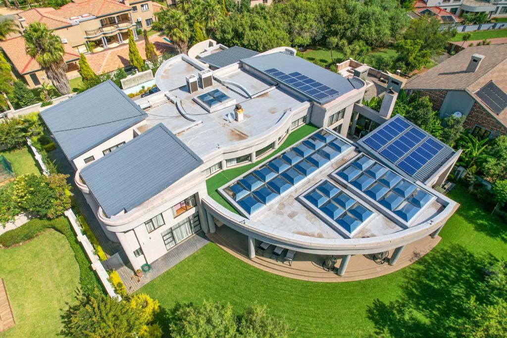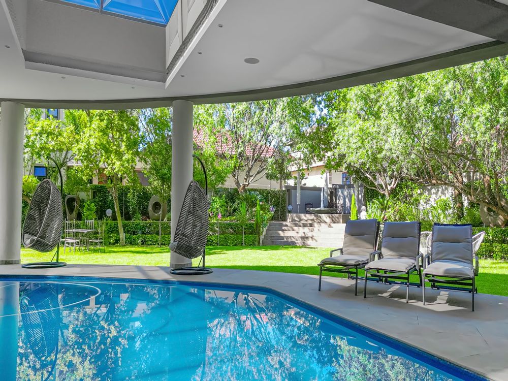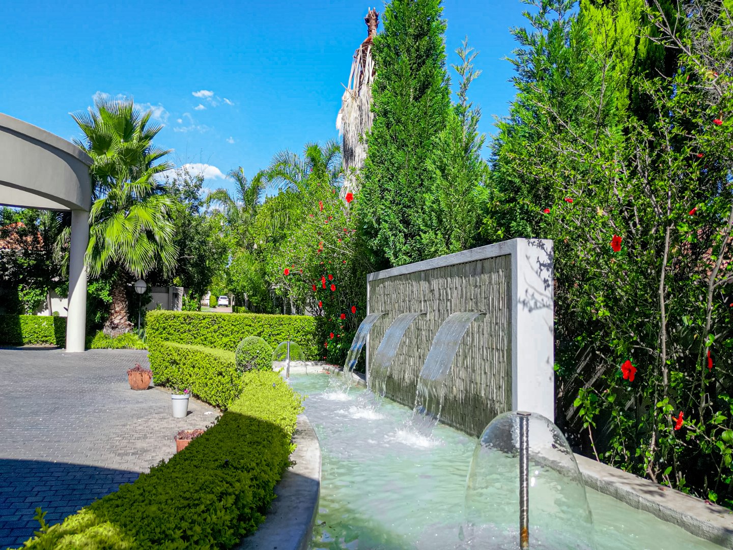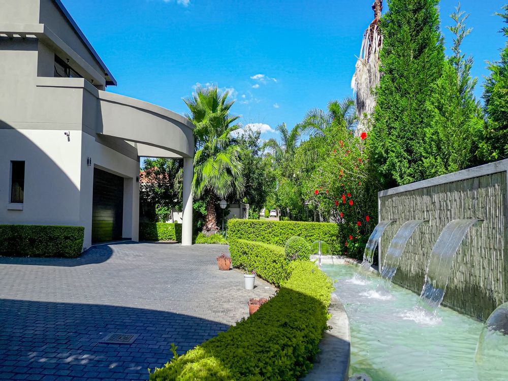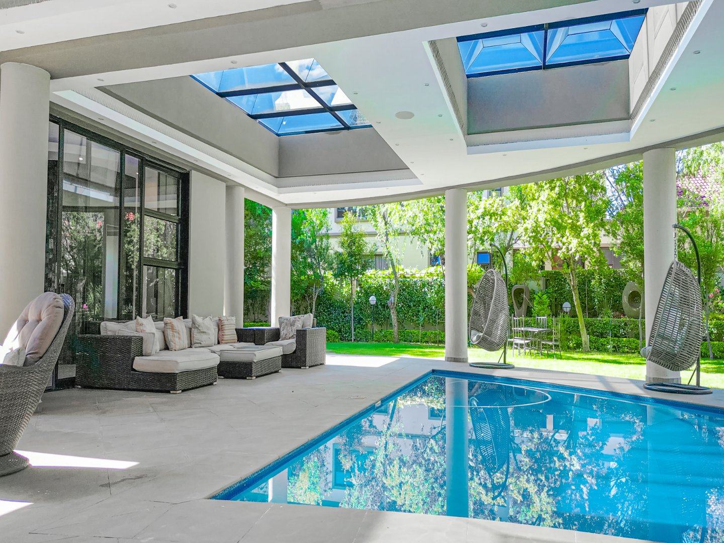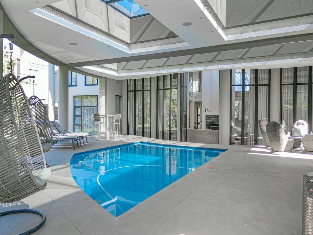 * An indoor pool with skylights, water features, and a meticulously landscaped garden with an irrigation system.