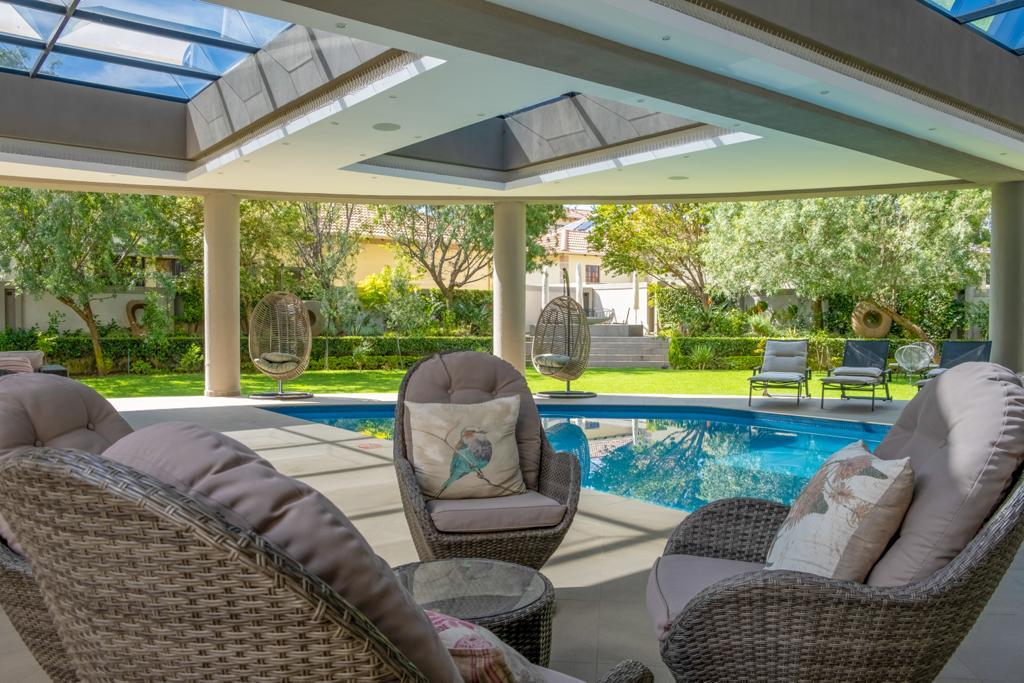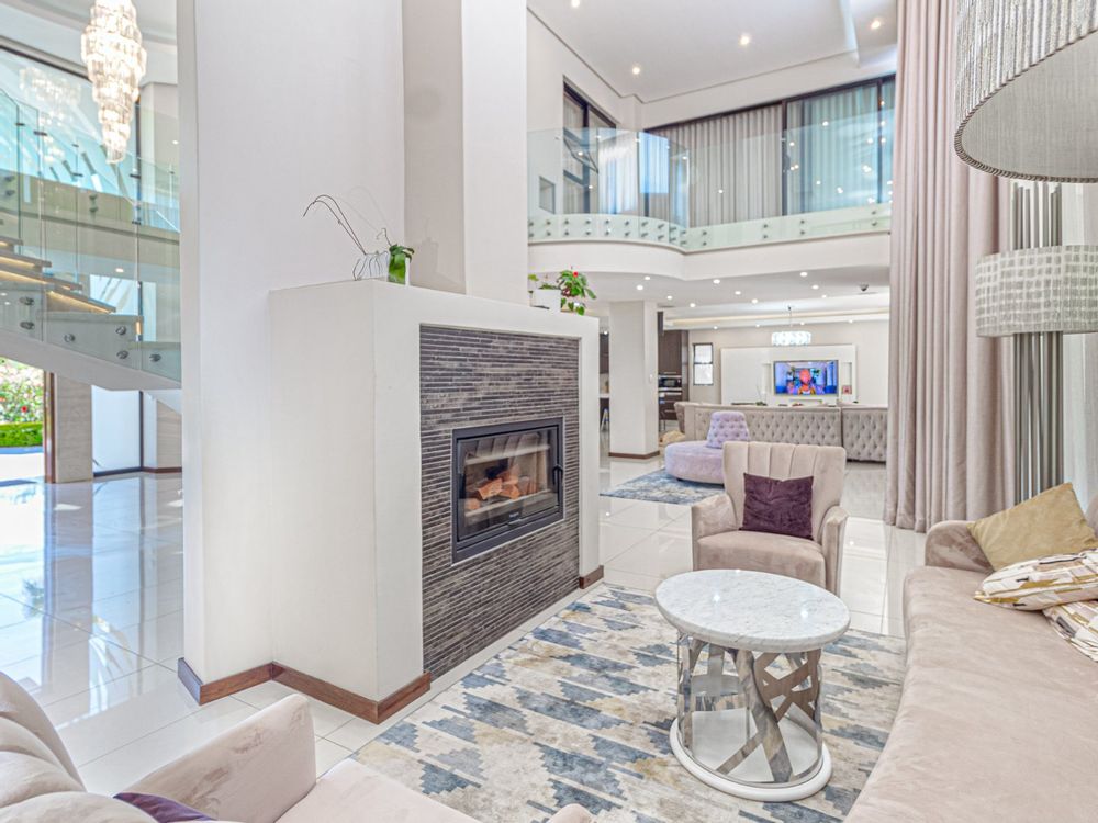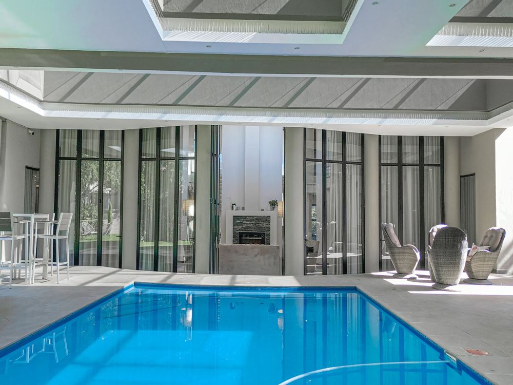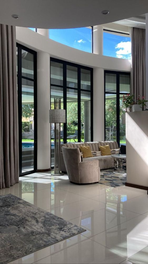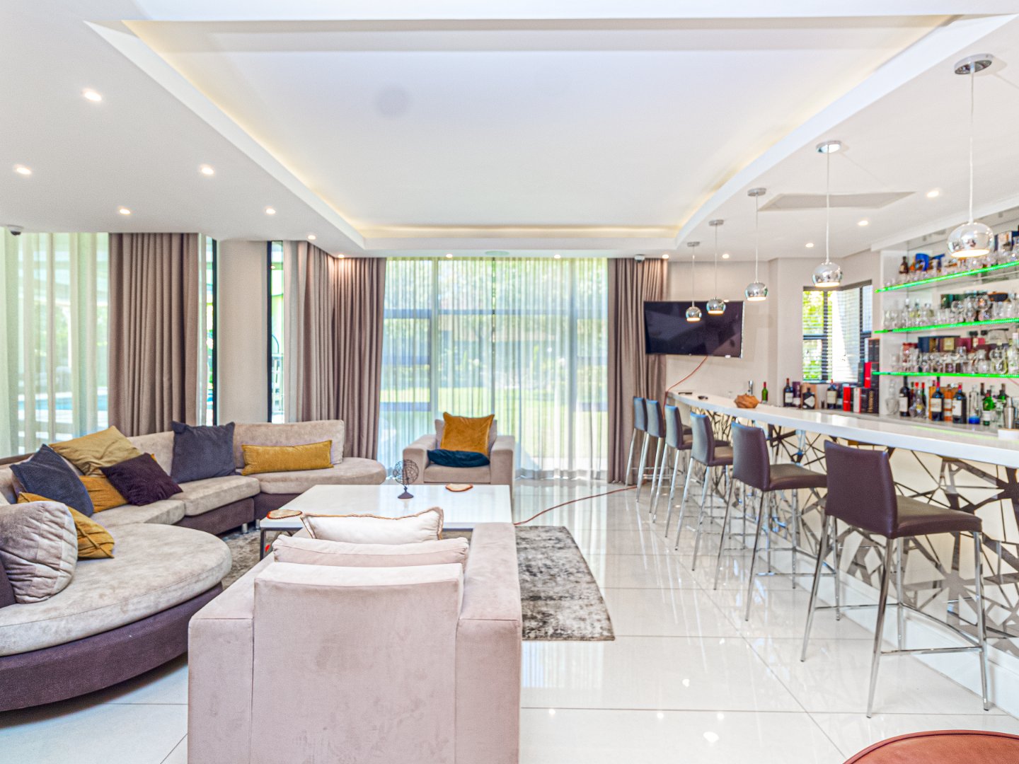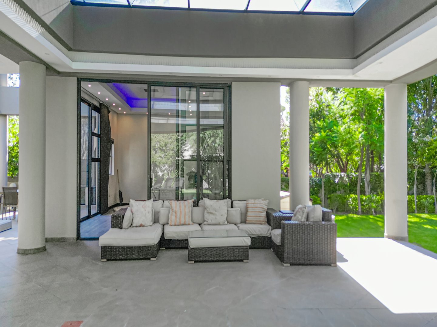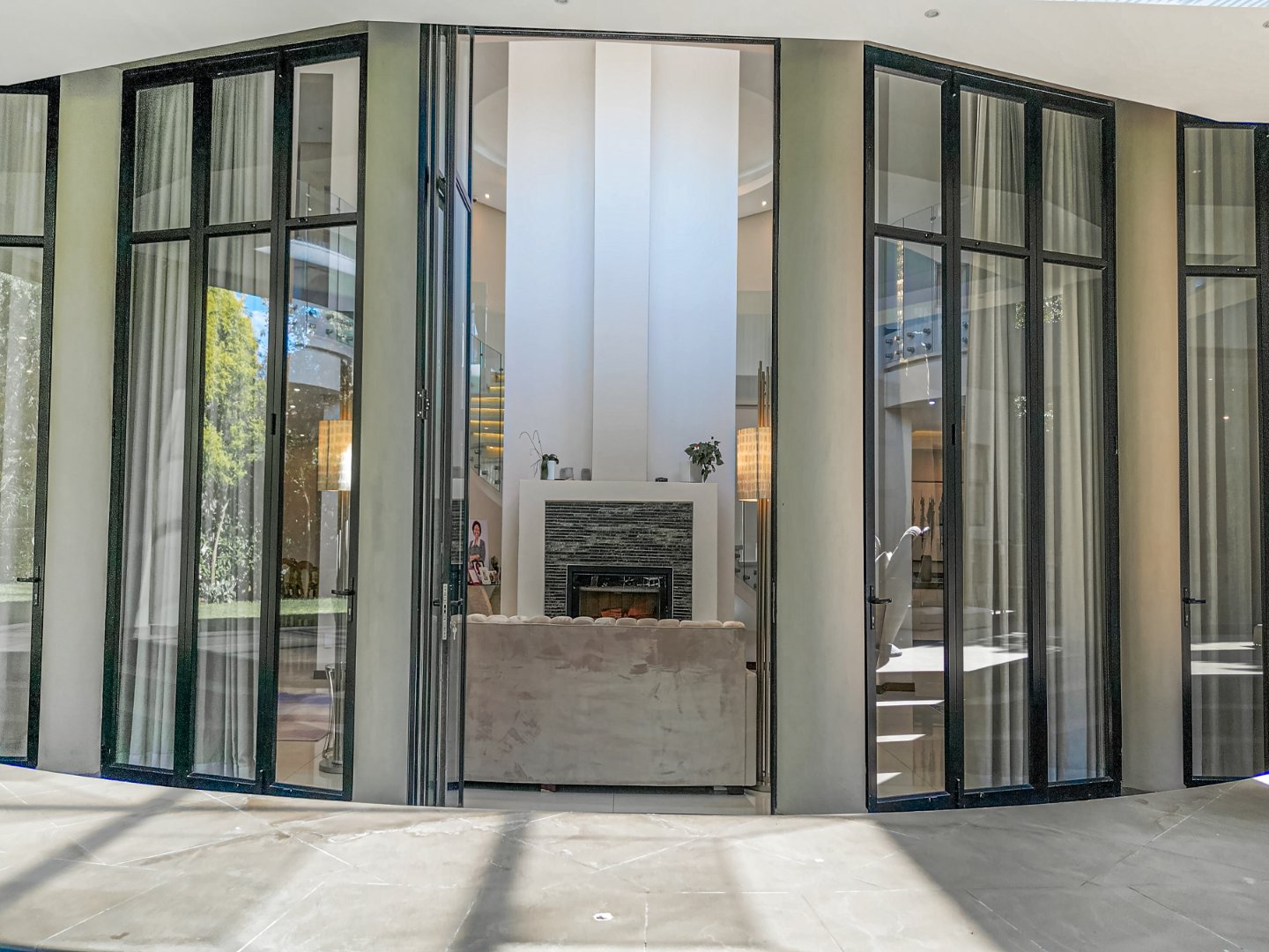 * The living space extends through automated curtains and large stack doors to an entertainment area equipped with a built-in braai area, a closed-off cubical with stack doors, featuring a jacuzzi, and a steam room with shower and toilet.
