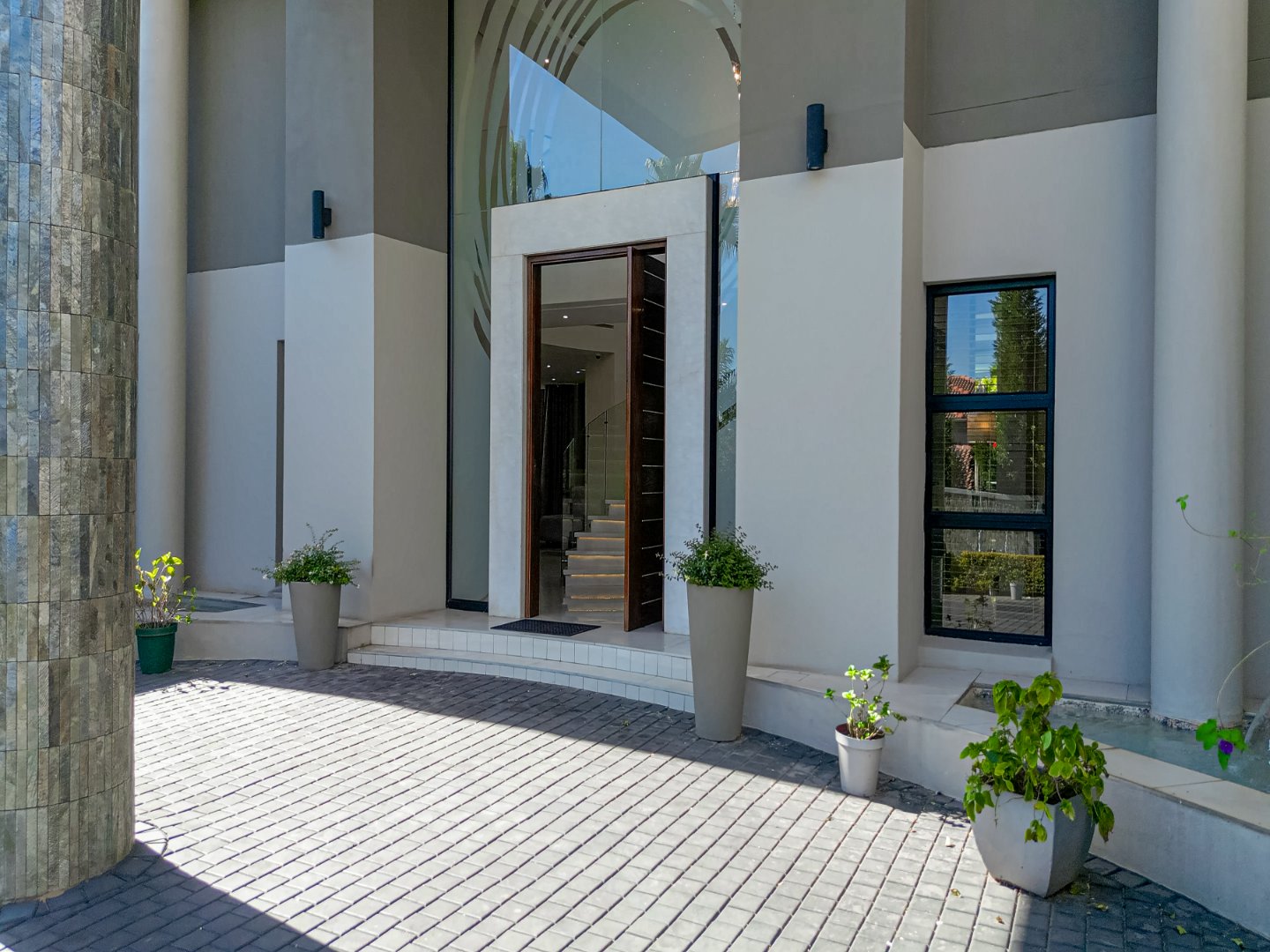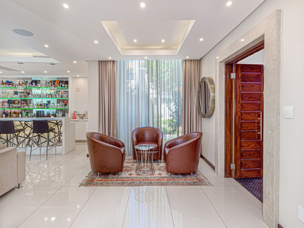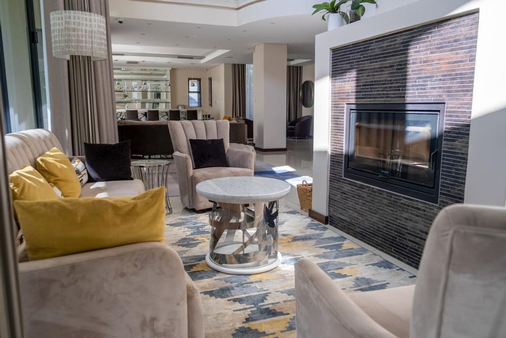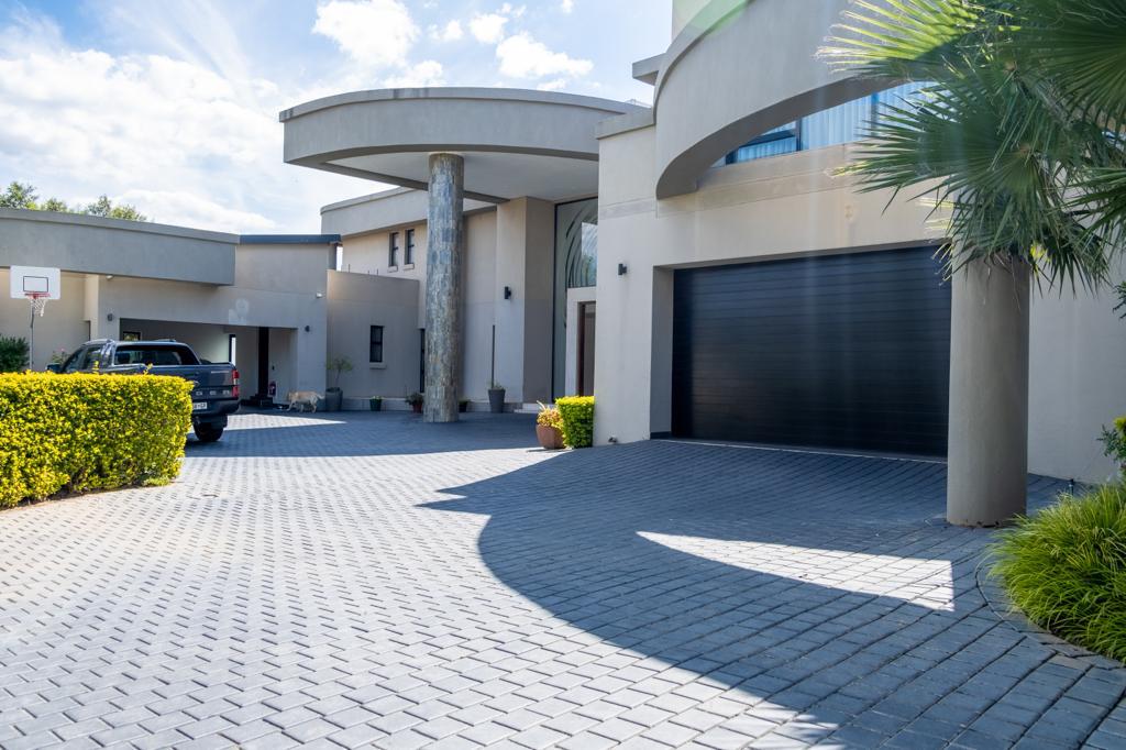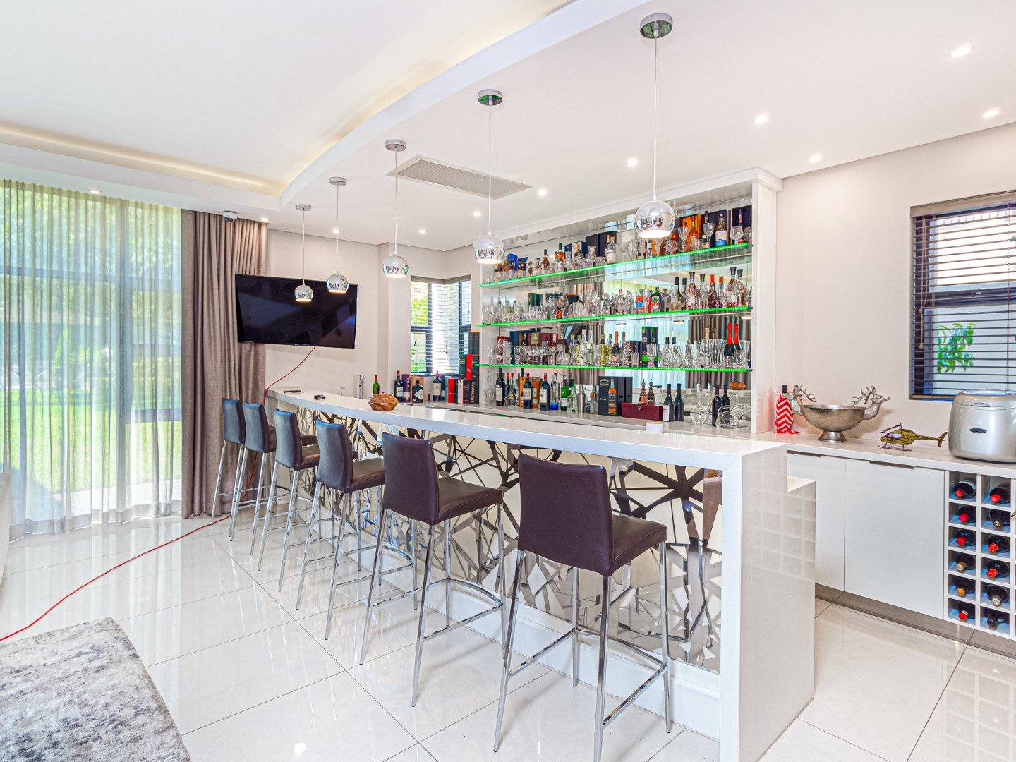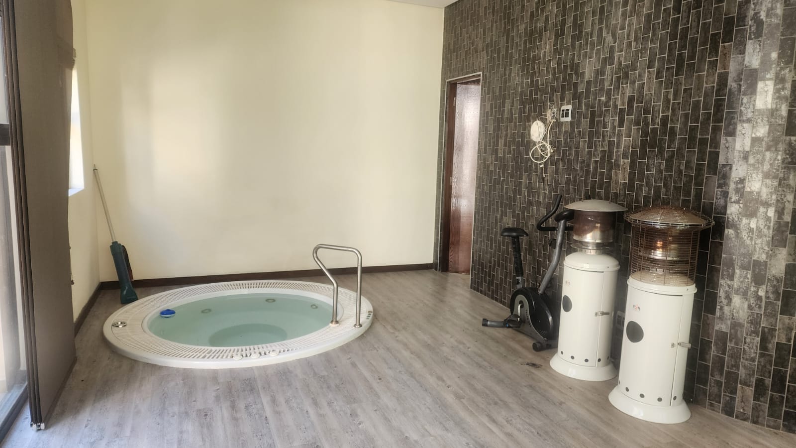 * The living space extends through automated curtains and large stack doors to an entertainment area equipped with a built-in braai area, a closed-off cubical with stack doors, featuring a jacuzzi, and a steam room with shower and toilet.