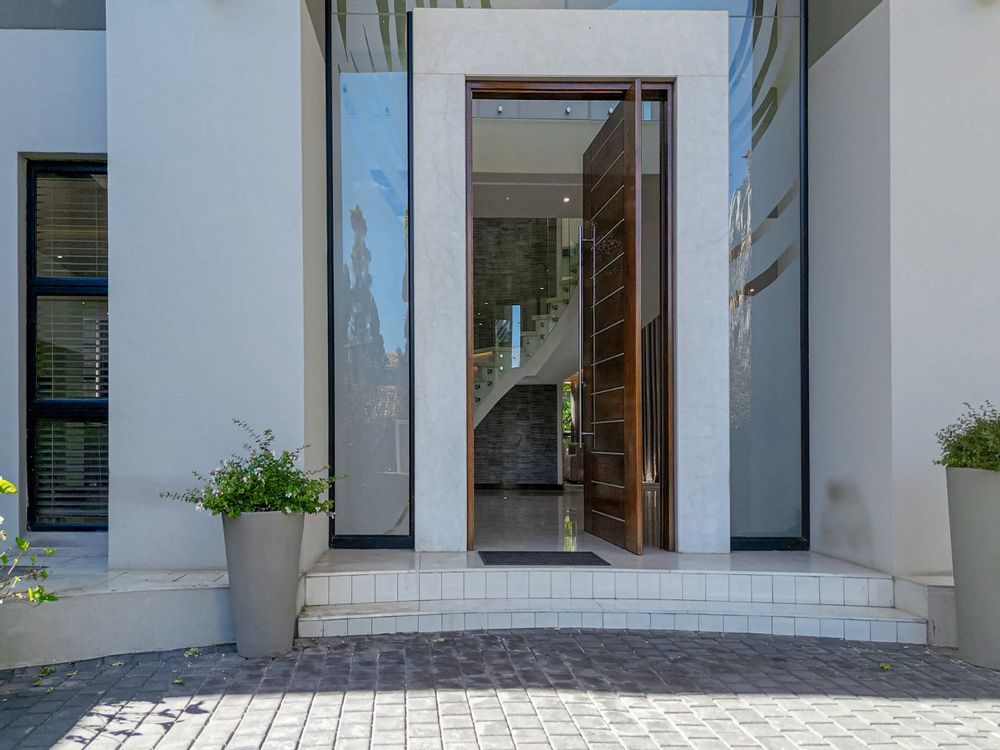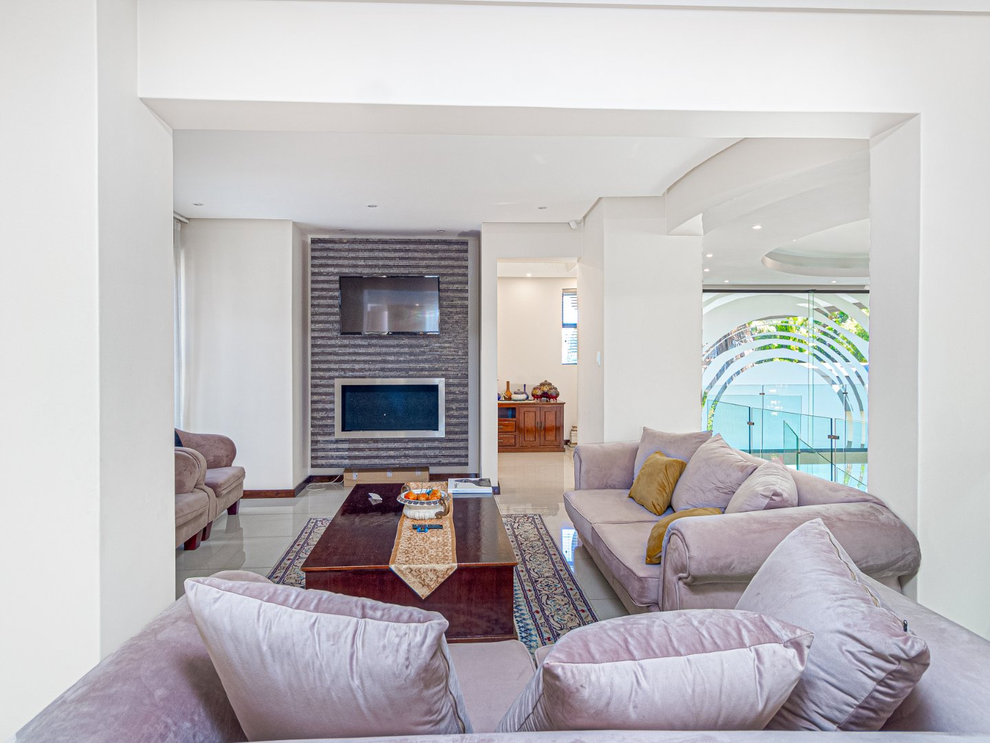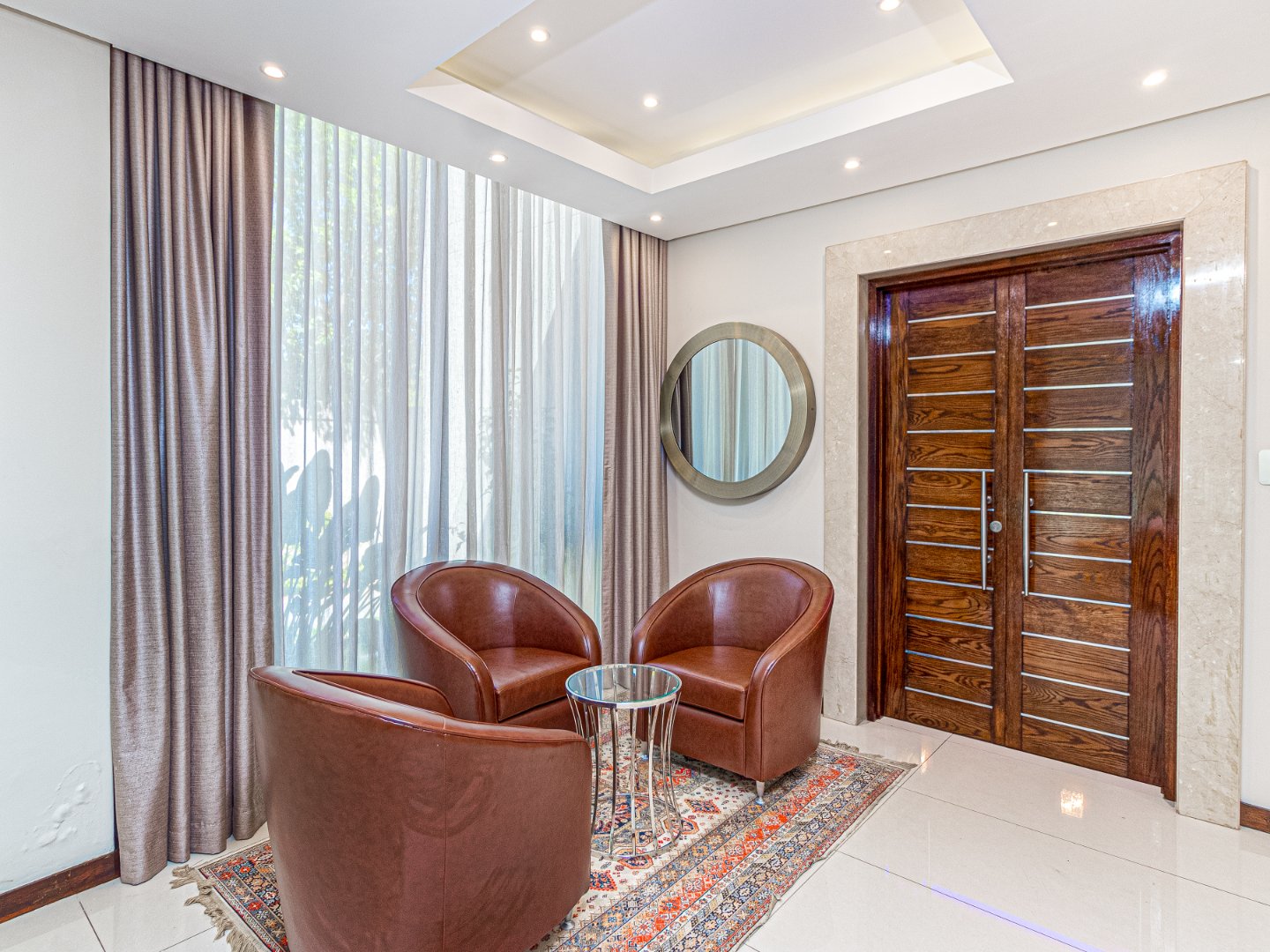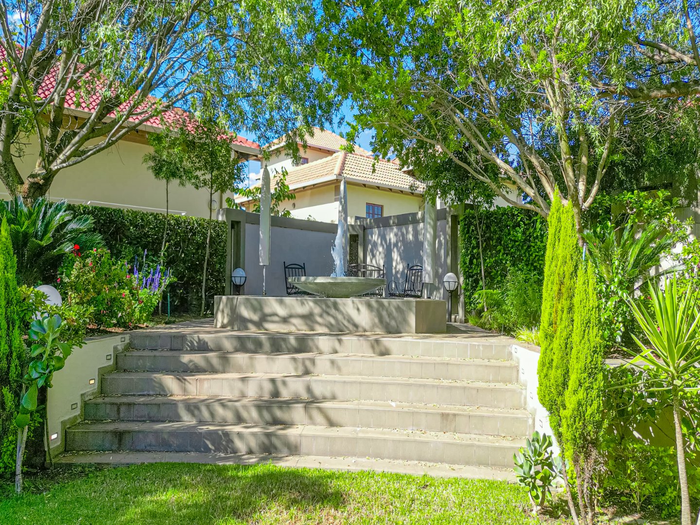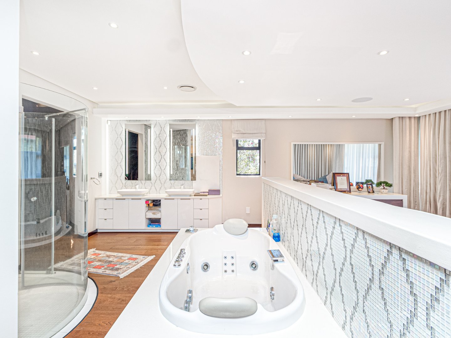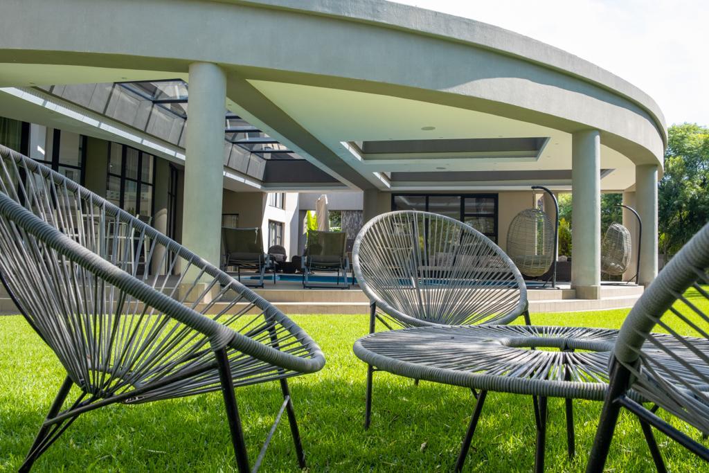 * The living space extends through automated curtains and large stack doors to an entertainment area equipped with a built-in braai area, a closed-off cubical with stack doors, featuring a jacuzzi, and a steam room with shower and toilet.