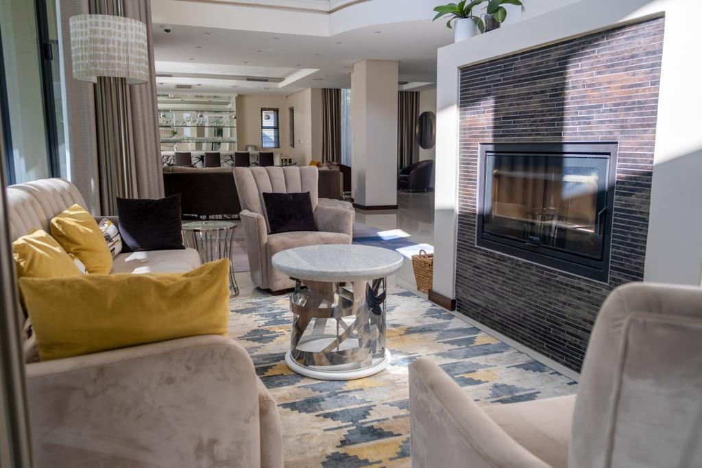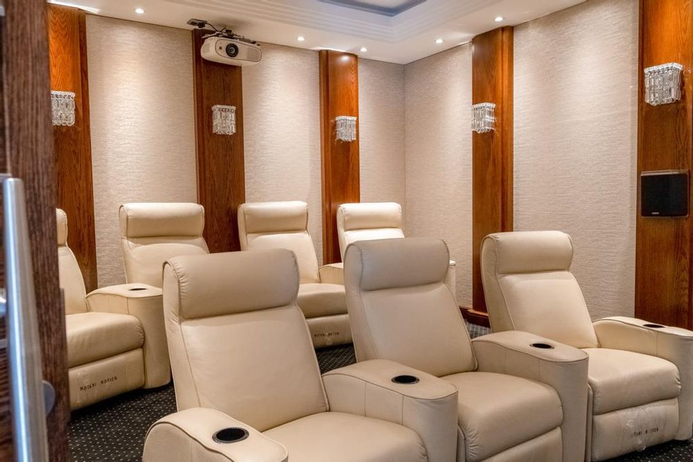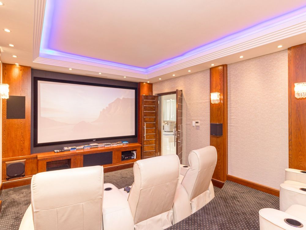 * The downstairs living area is designed with both style and convenience in mind, featuring an open-plan layout with a modern bar area, a fireplace to cuddle nearby and read a book, a guest bathroom, a cinema room with a big screen, and luxury reclining chairs.