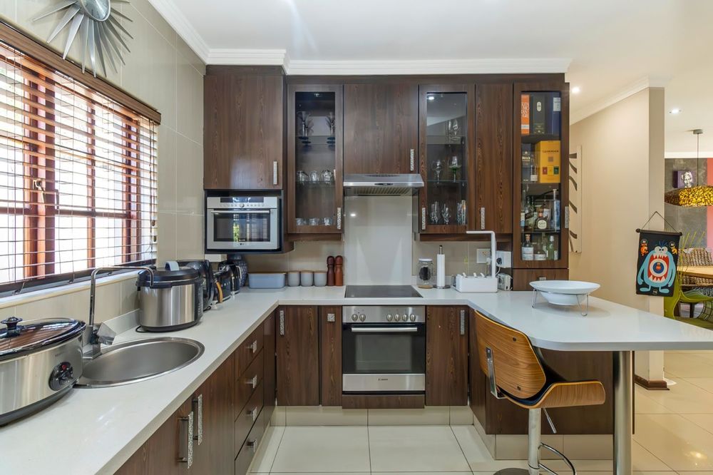 The kitchen is a chef's delight, with modern appliances, ample cupboard space, and a breakfast bar. The kitchen also leads to a furnished Wendy's house that can be used as a nanny's room, a guest room, or a home office. The Wendy's house has a kitchen and bathroom, giving you extra privacy and comfort.
