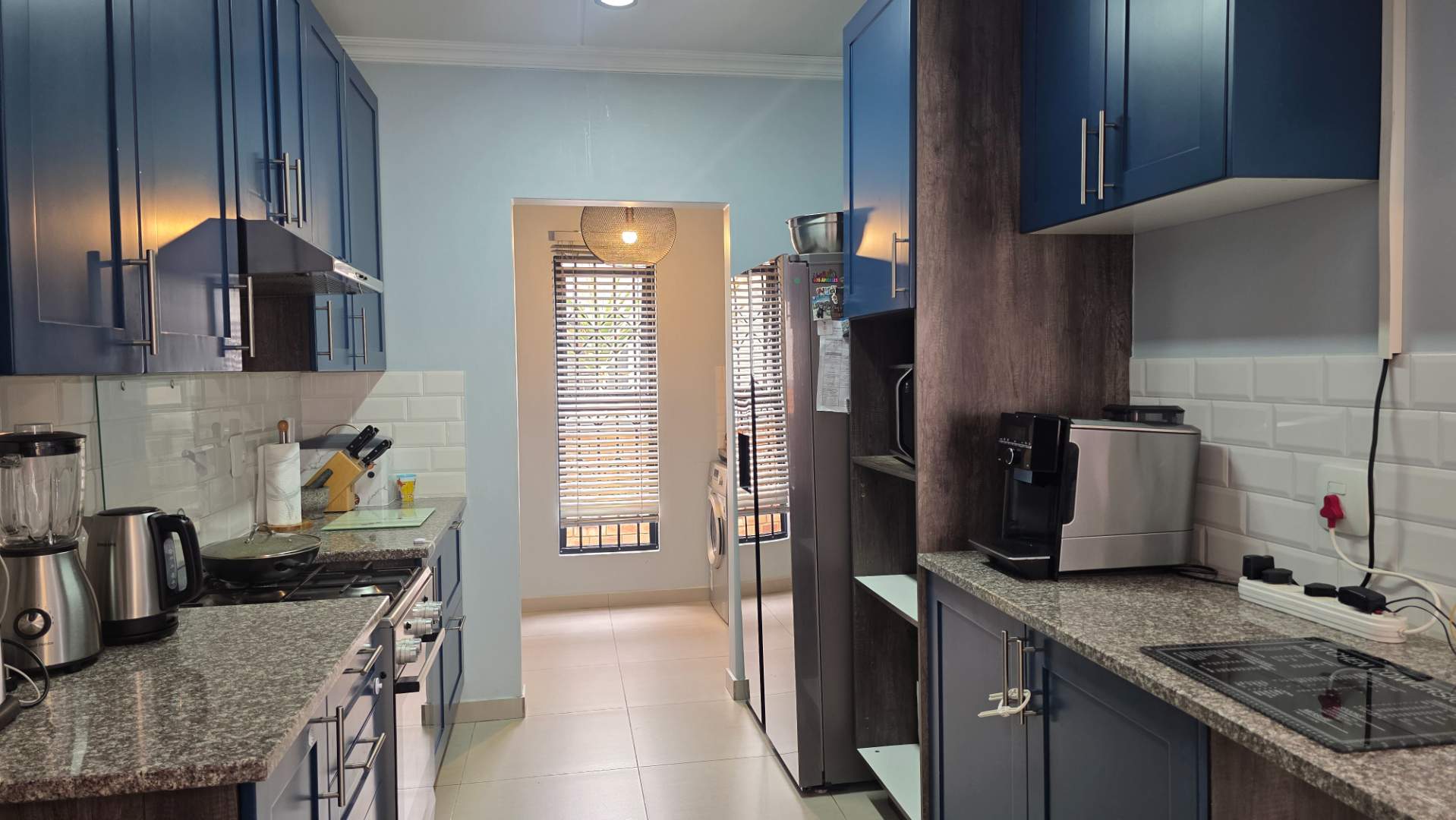 Inside, you’ll find stylish modern finishes throughout, complemented by a separate scullery with provision for both a dishwasher and washing machine, keeping the kitchen neat and functional. The property is fitted with a gas stove and a solar geyser, offering significant savings on electricity costs, as well as power back-up for added convenience.