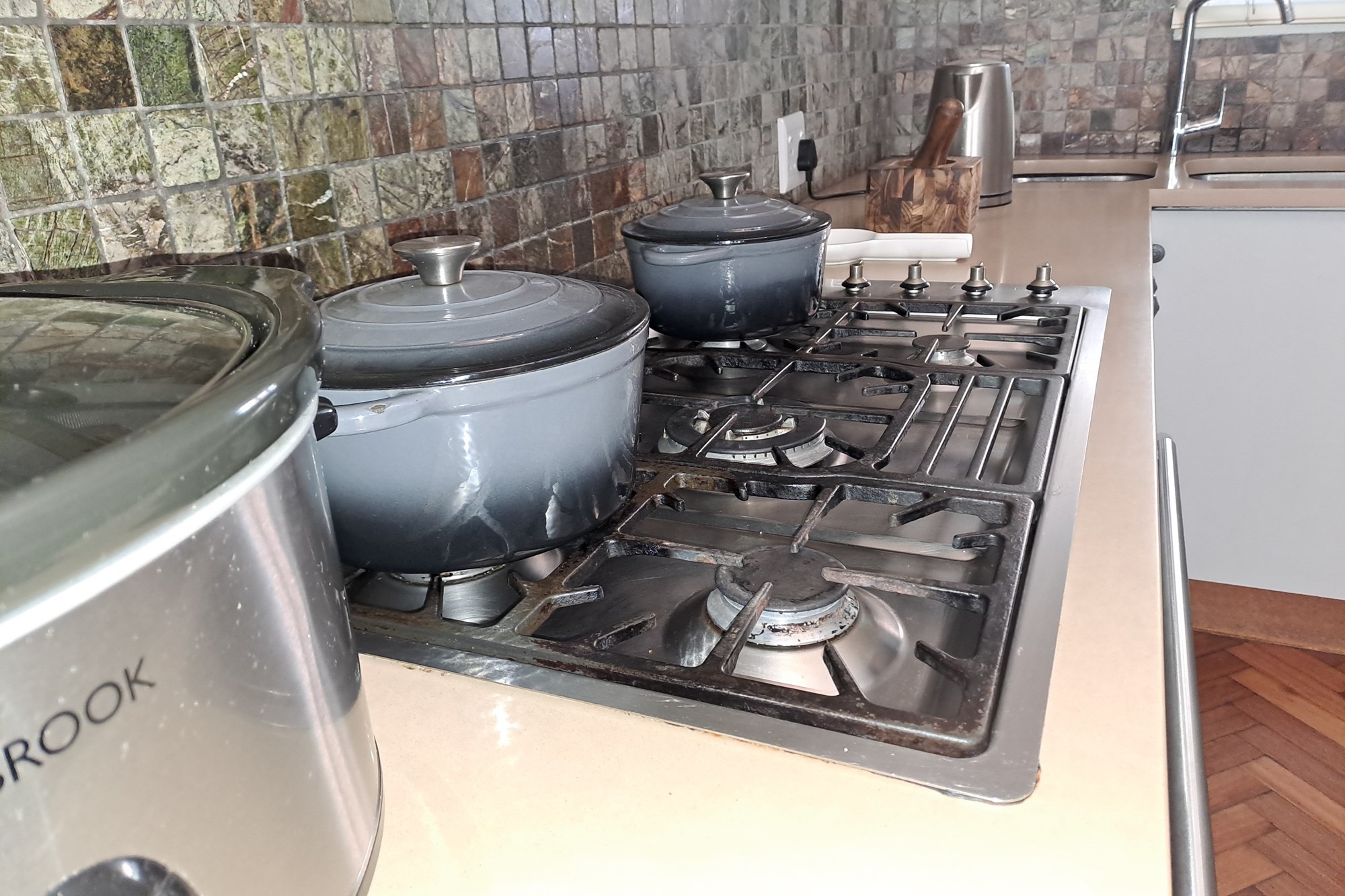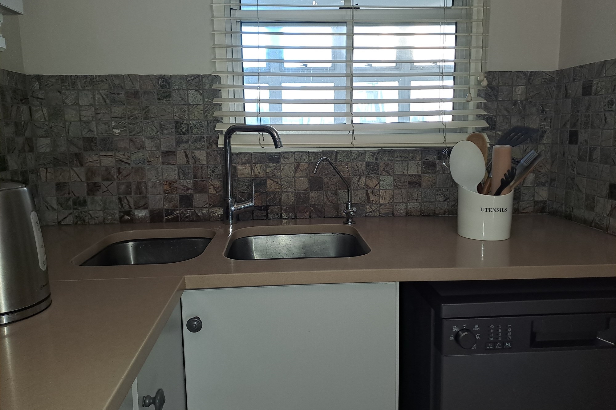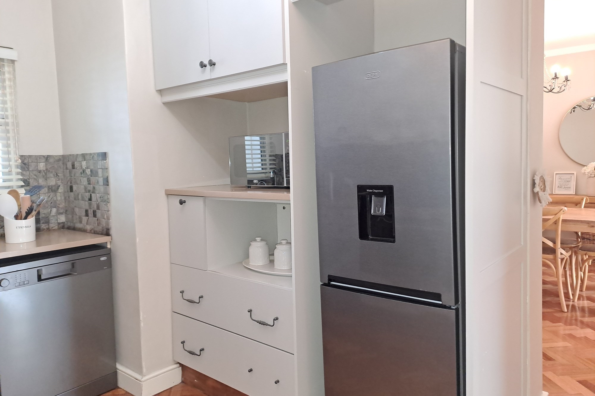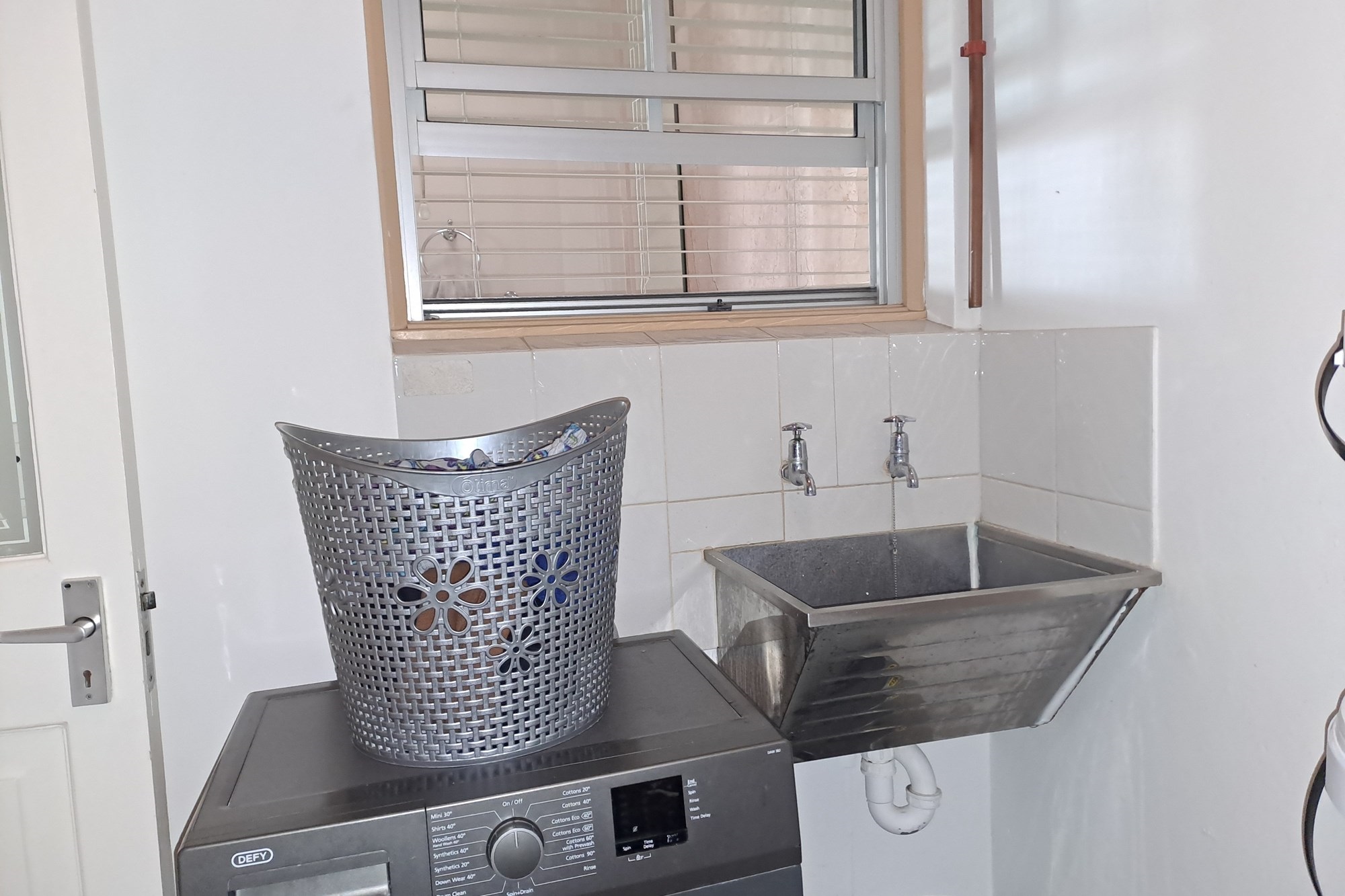 The sleek, well-appointed kitchen boasts granite countertops, a gas hob, and ample cupboard space. Adjacent to the kitchen is a convenient laundry area complete with a built-in basin, which also serves as an additional storage space.