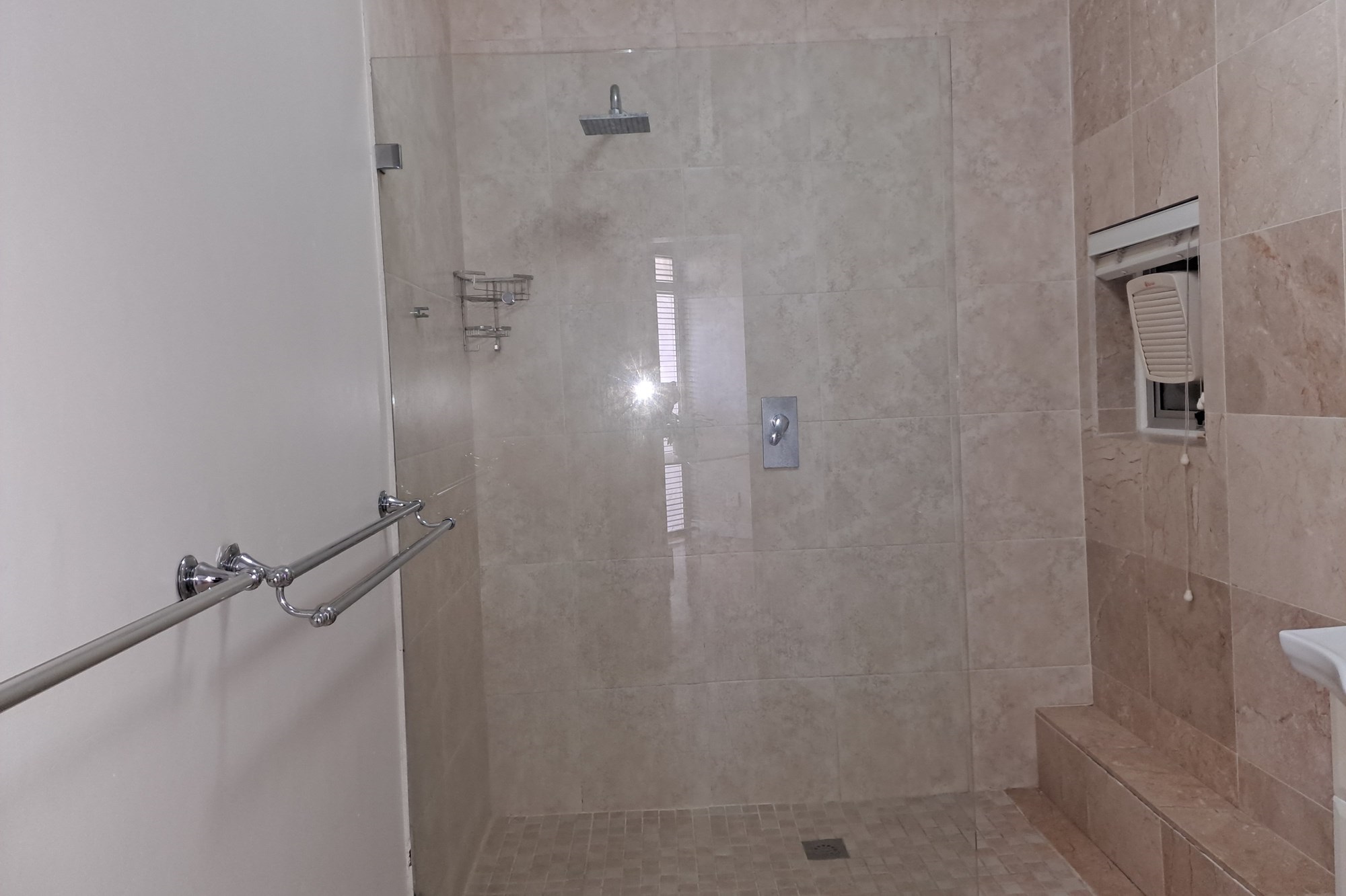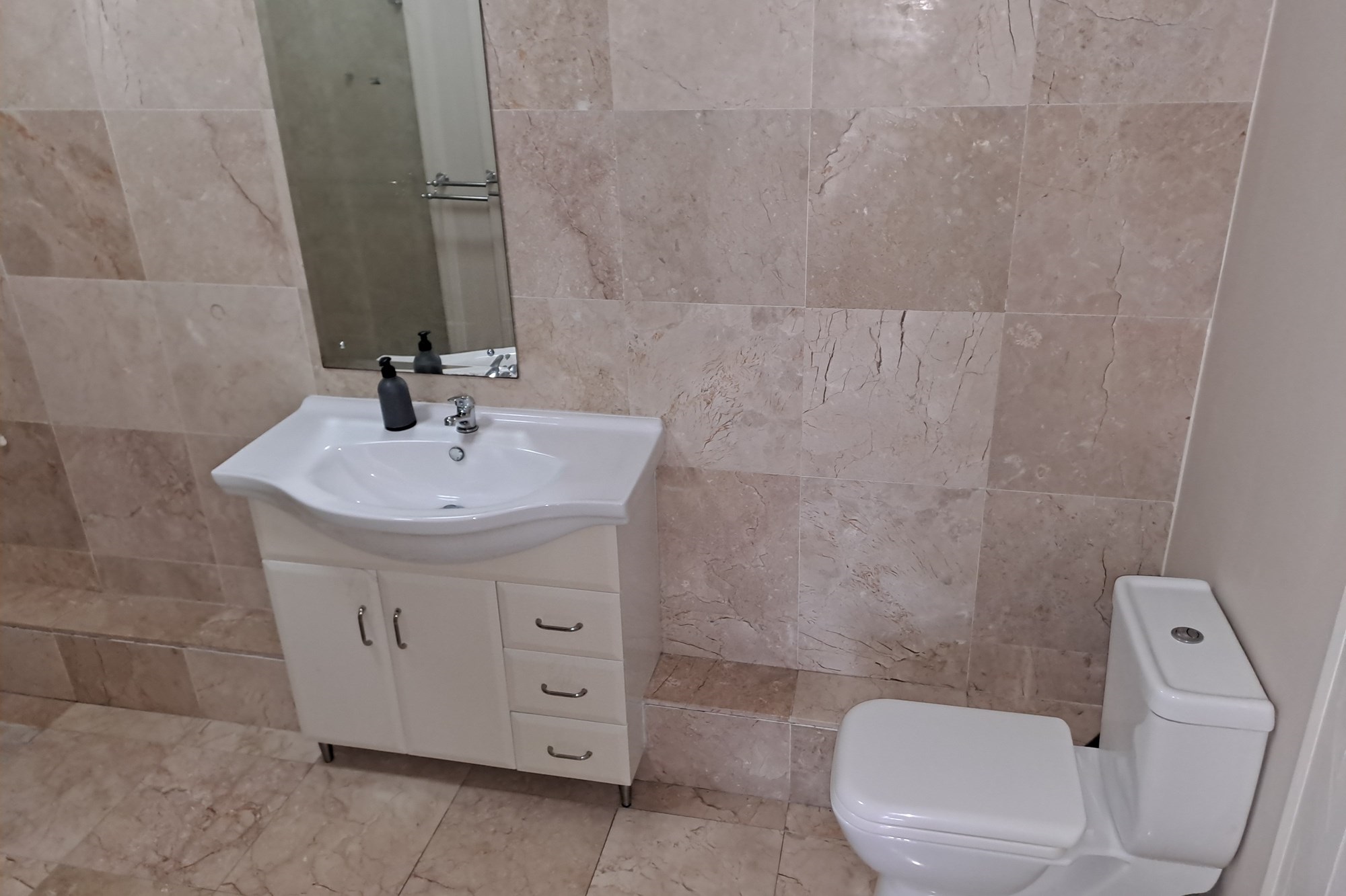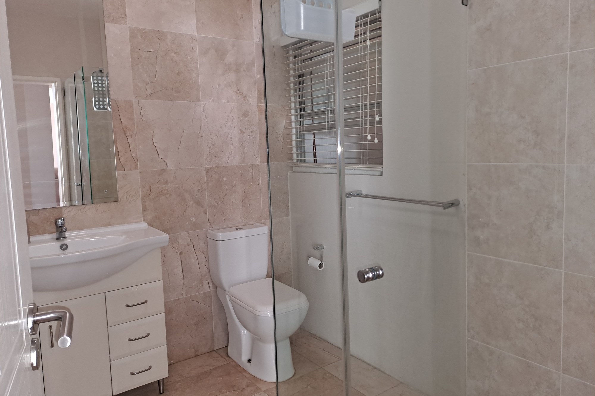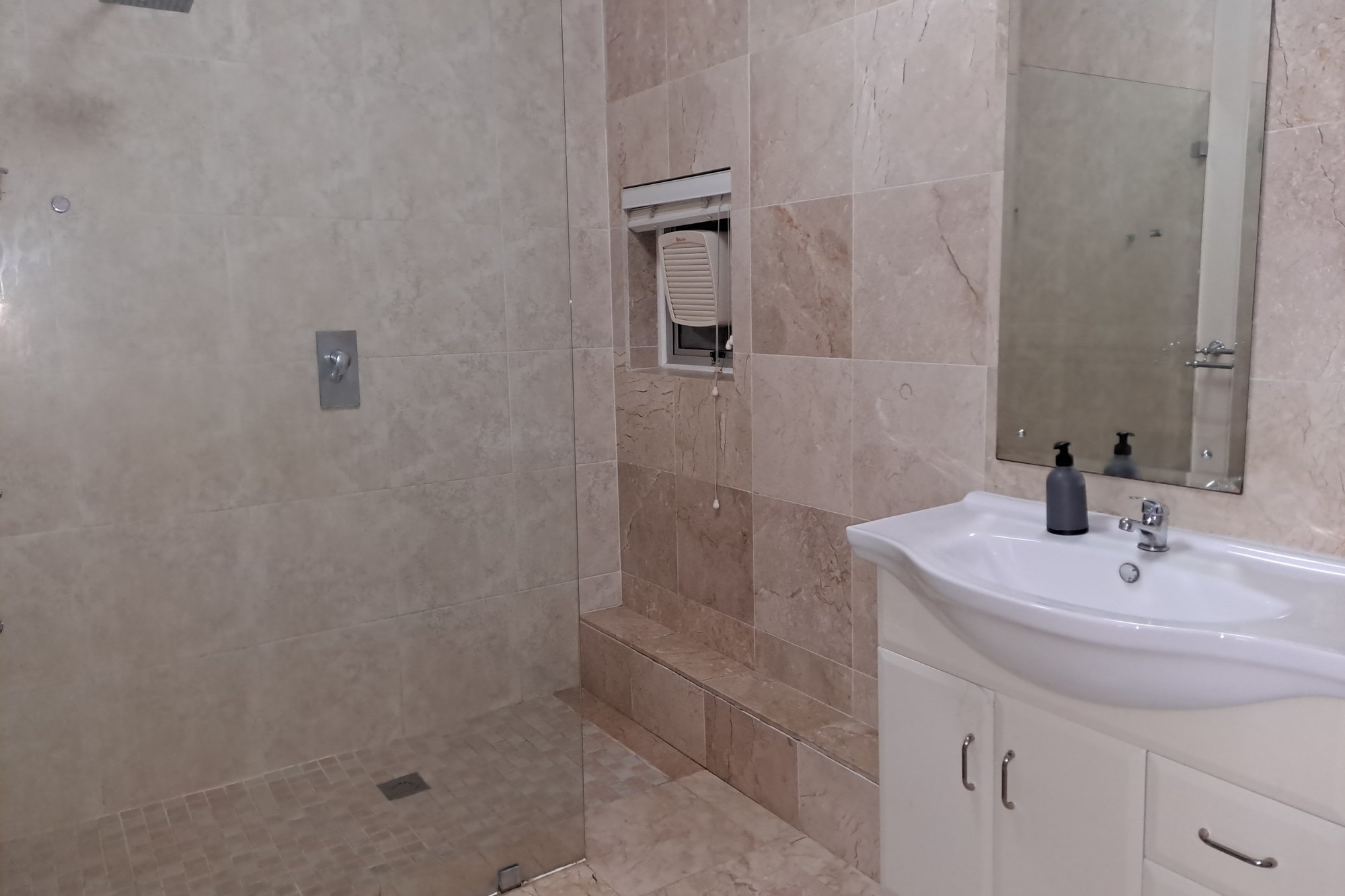The main bedroom is generously sized and complemented by a spacious en-suite bathroom featuring a shower, toilet, and basin.