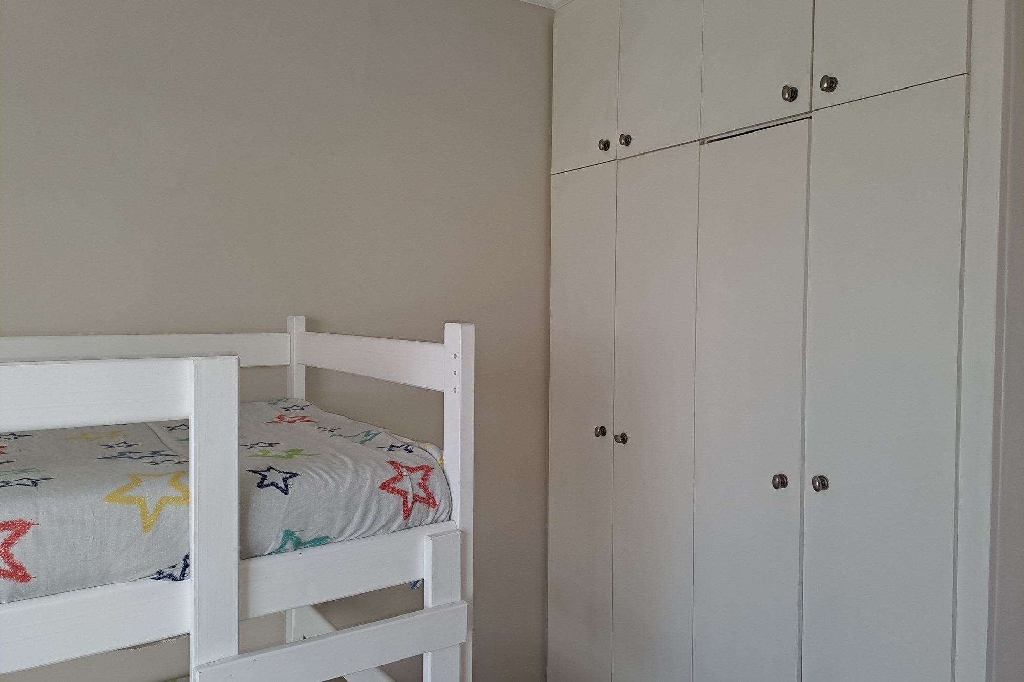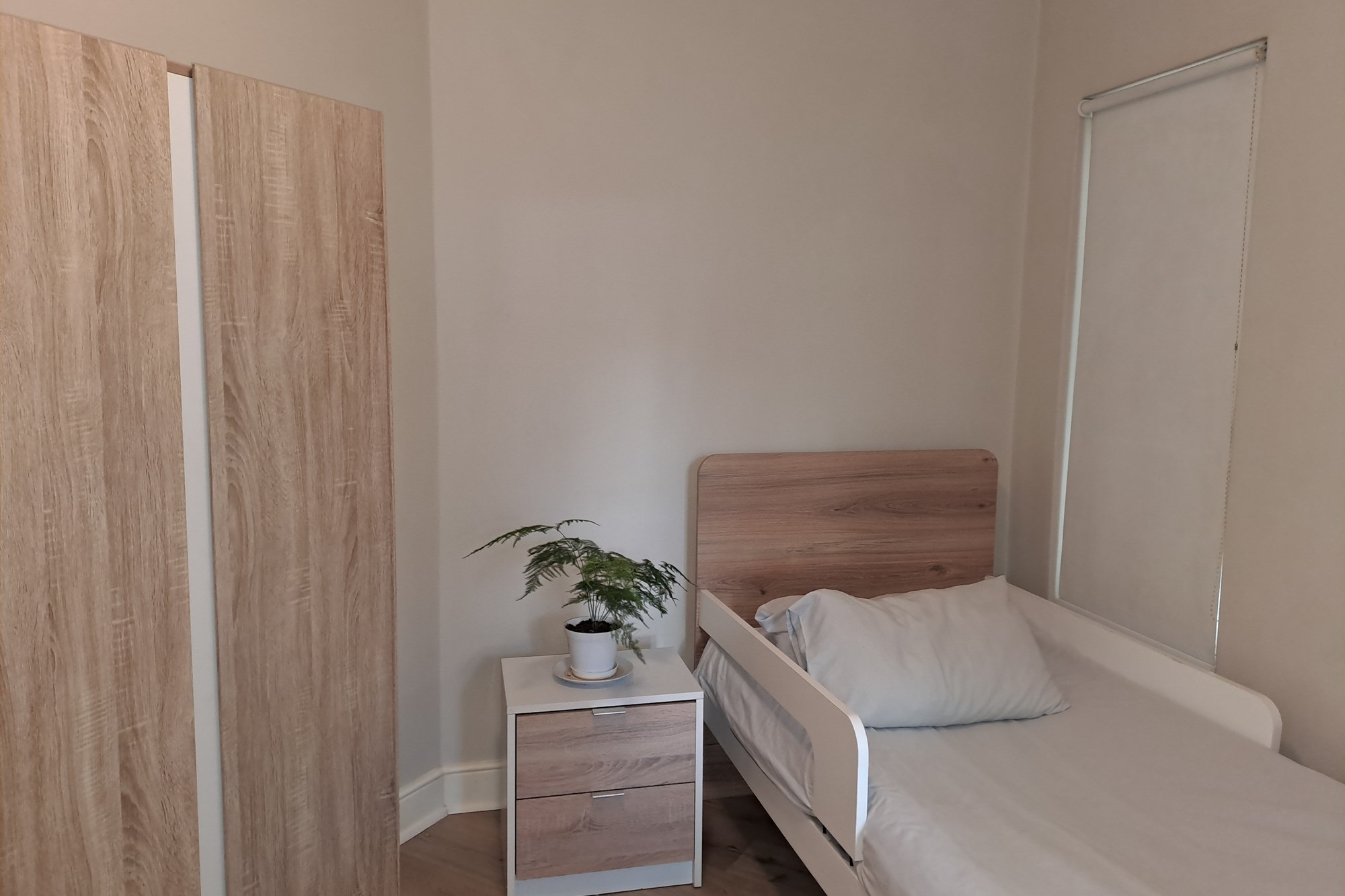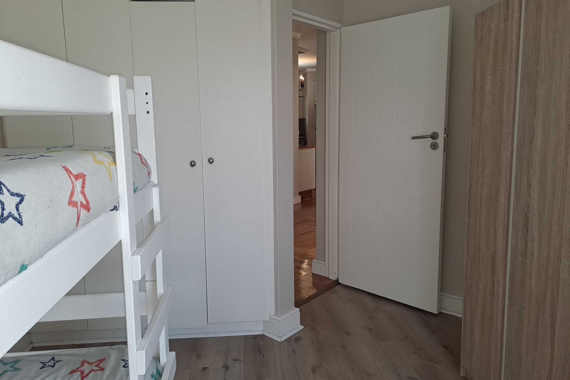 Accommodation includes three bedrooms. The first, a single room, is ideal as a guest bedroom, child’s room, or home office. The second bedroom is slightly more spacious. A large, full bathroom services these two rooms and includes a shower, toilet, and basin.