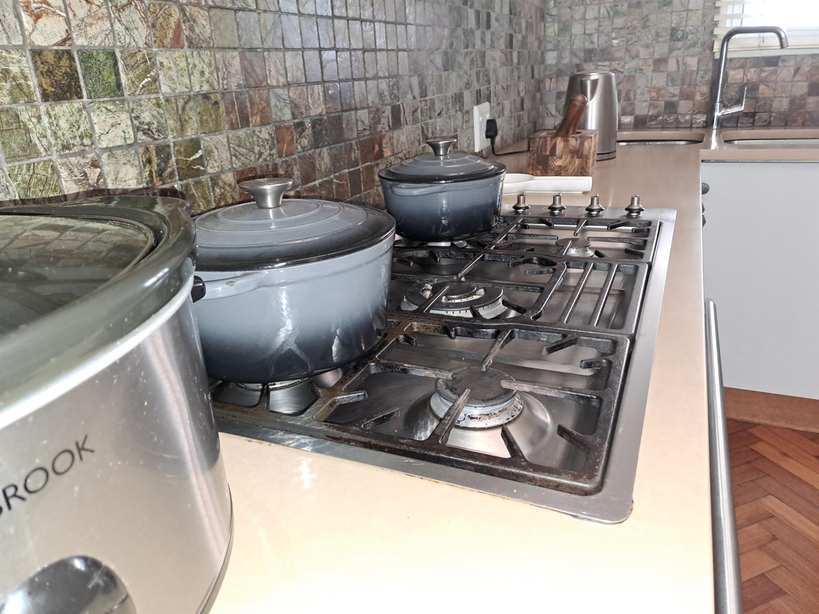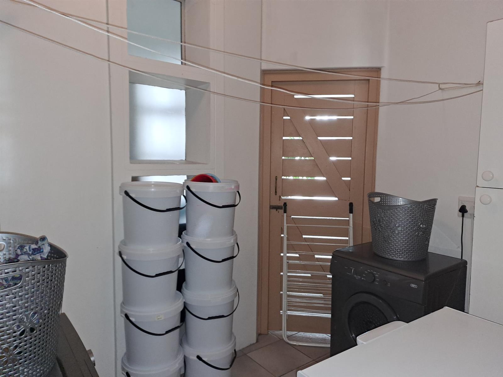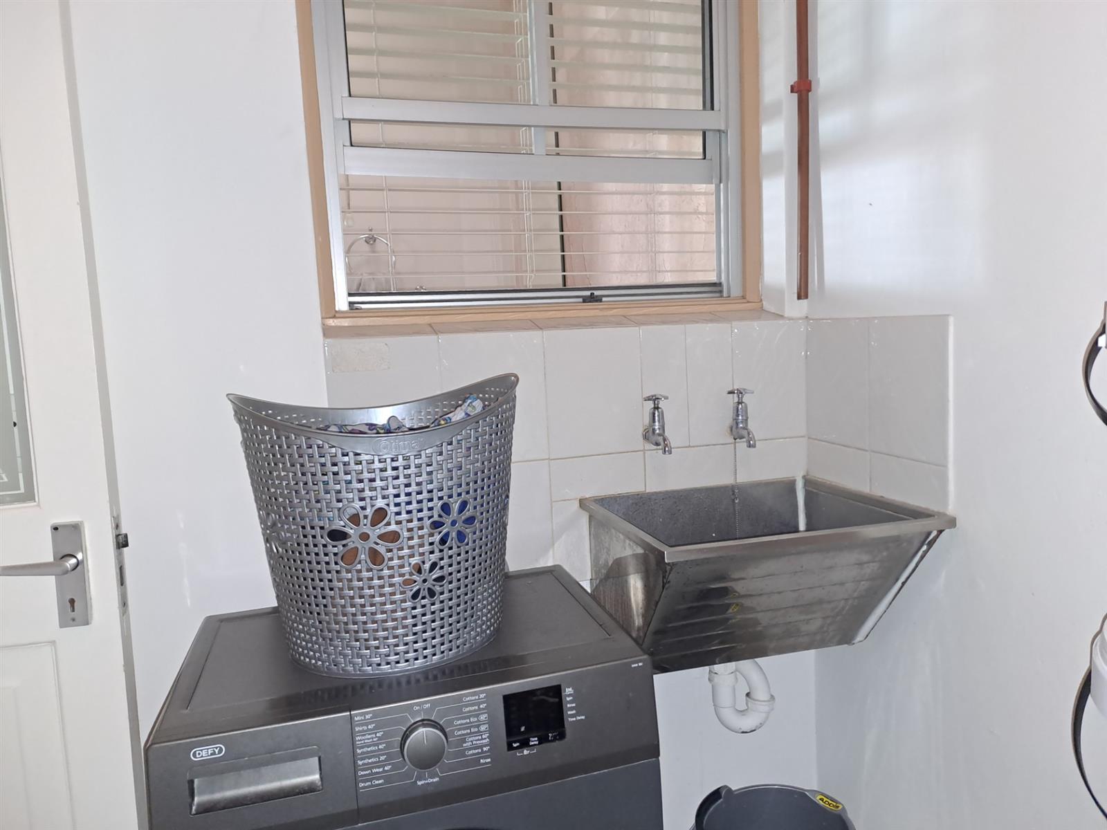 The kitchen is designed with both style and functionality in mind, featuring granite countertops, a gas hob, and ample storage. Just off the kitchen, a separate laundry room with a built-in basin adds versatility and additional storage space.