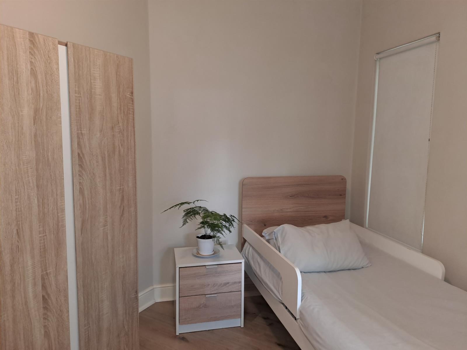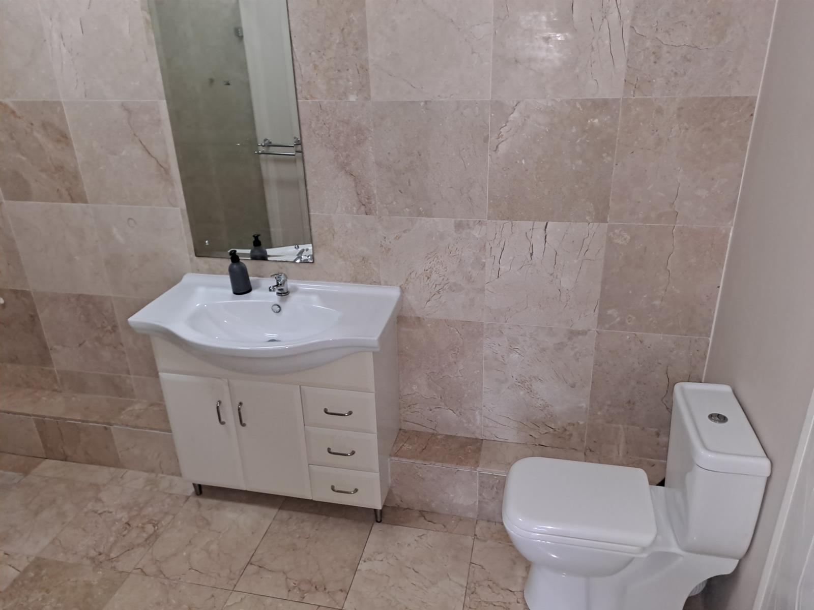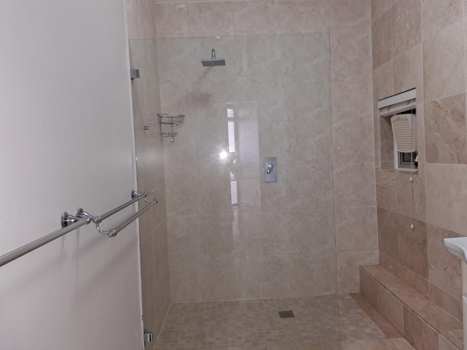 The main bedroom stands out with its generous proportions and private en-suite bathroom, complete with a shower, basin, and toilet.