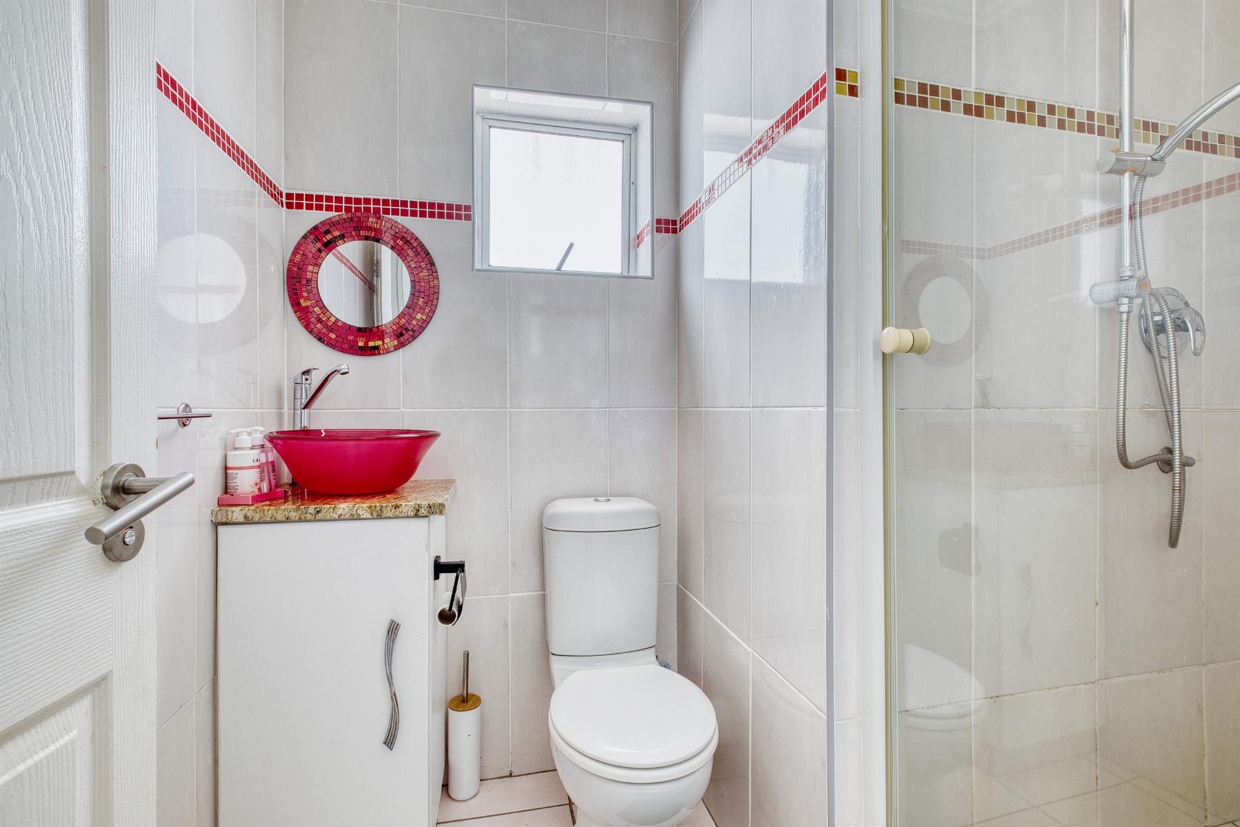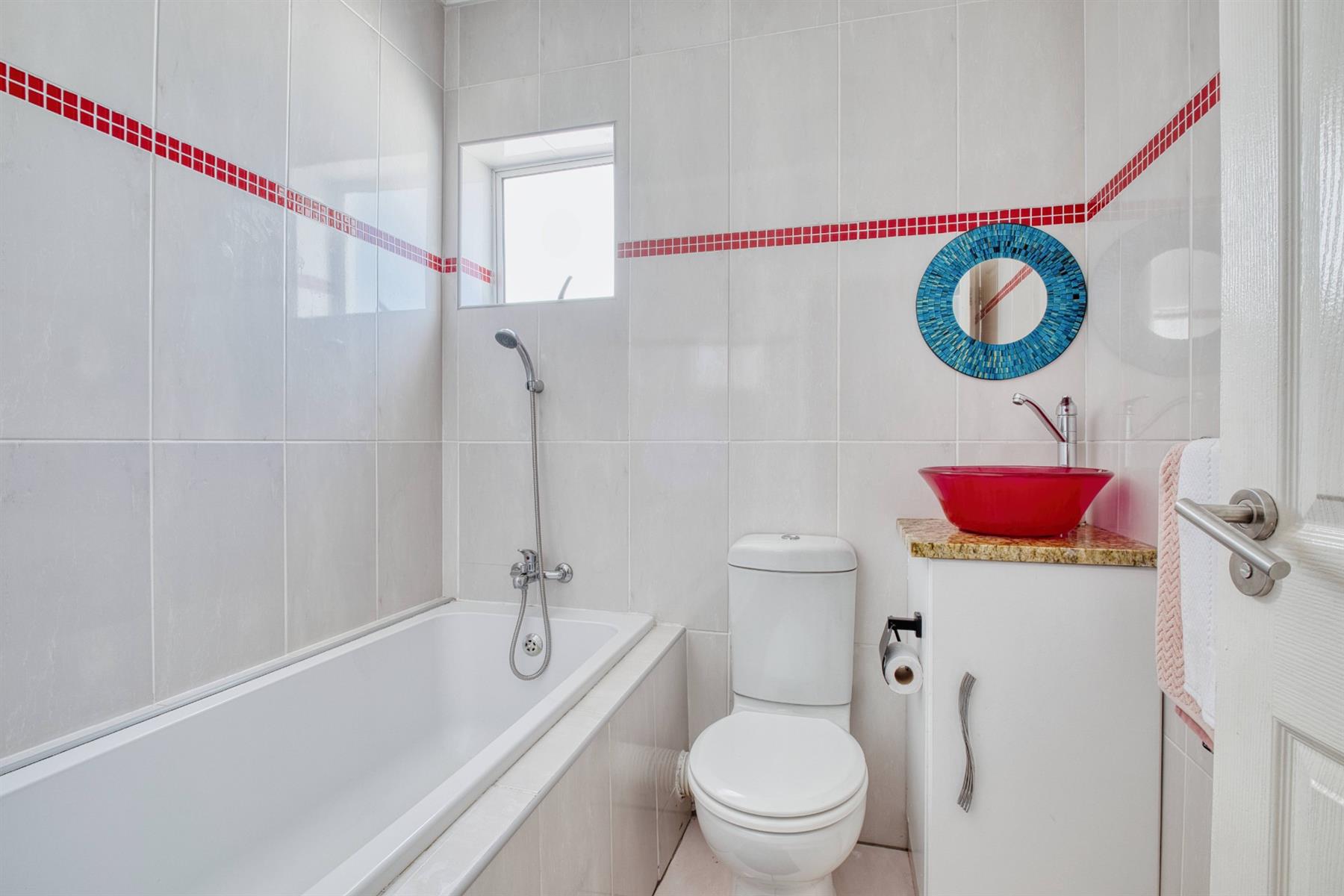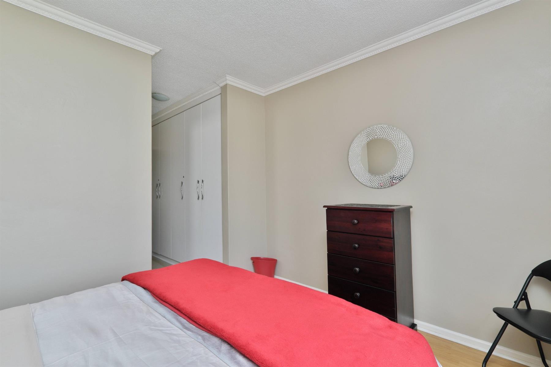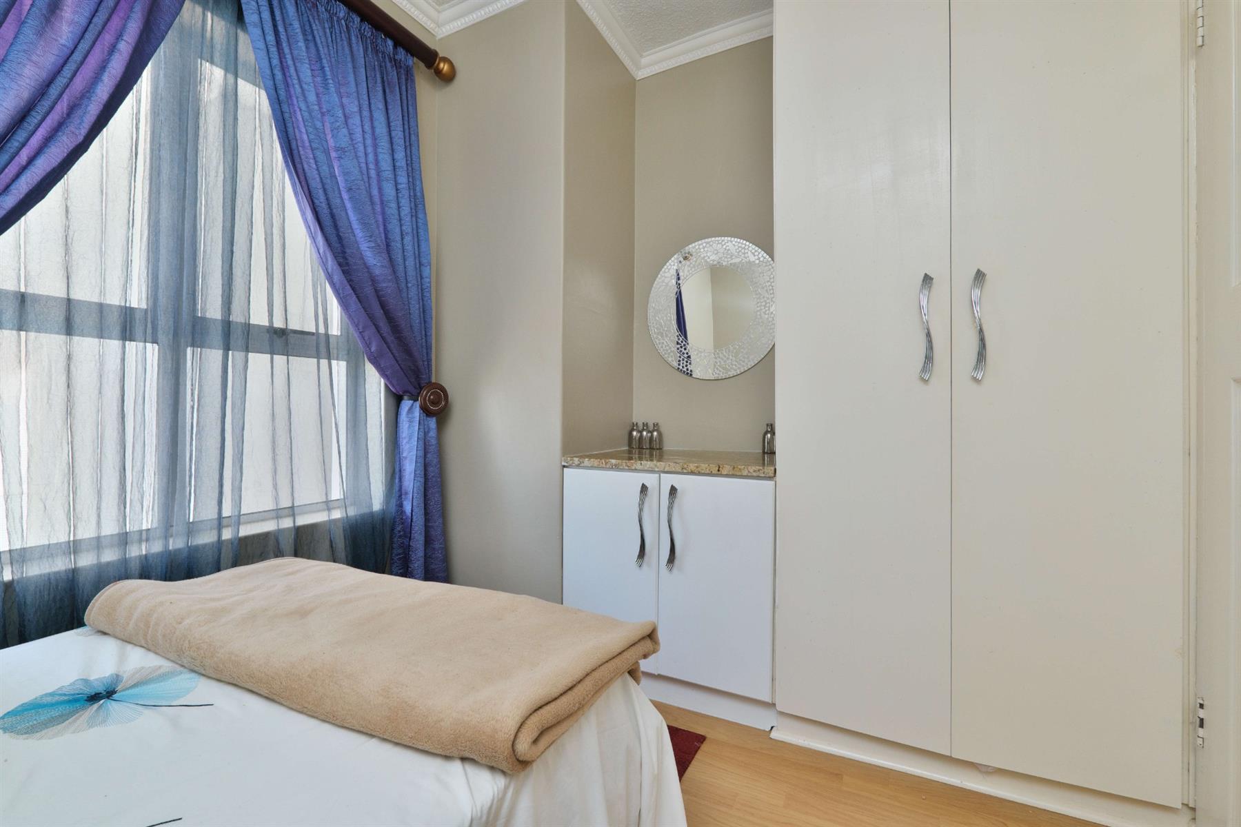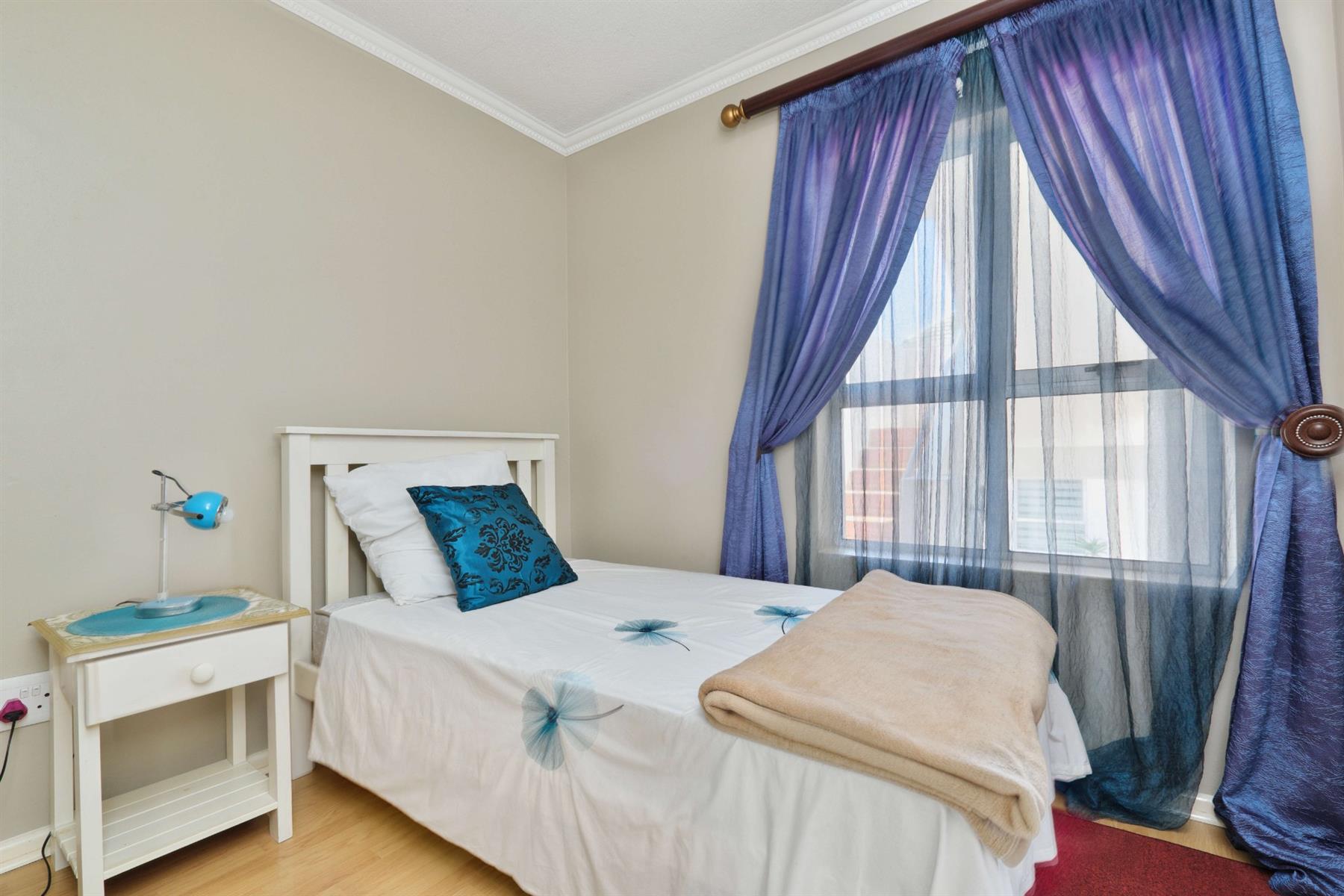 The spacious main bedroom features built-in cupboards and a private en-suite bathroom fitted with a shower, toilet, and basin. The second bedroom comfortably accommodates a single bed and offers built-in cupboards with a dresser. The main bathroom includes a bath with overhead shower, toilet, and basin.