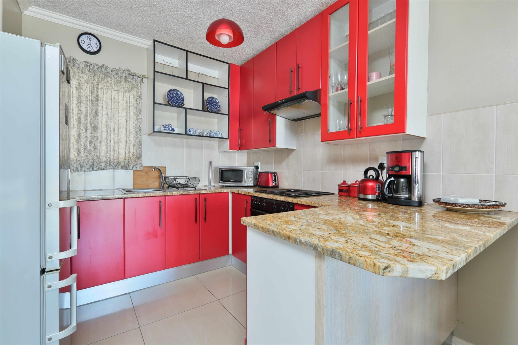 The open-plan kitchen and living area flow onto an enclosed verandah, creating additional living space while showcasing breathtaking sea views and overlooking the sparkling communal pool — a major drawcard for holiday guests. The kitchen is well-equipped with granite countertops, ample cupboard space, and an electric oven and hob, making it ideal for short- and long-term stays.