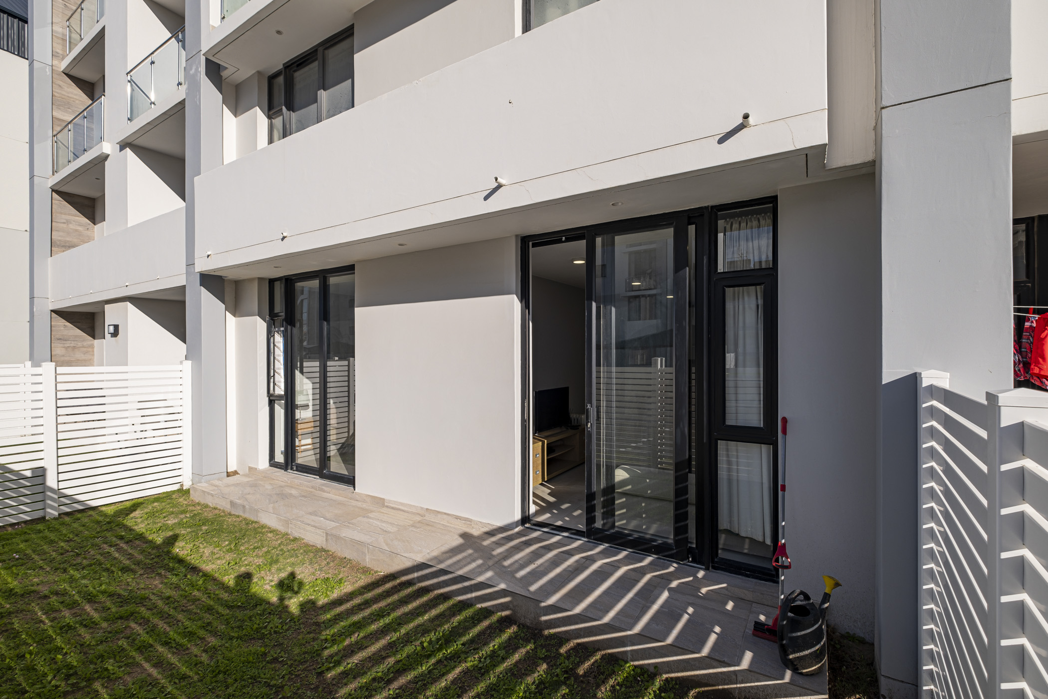 Sliding doors lead out to a private patio and garden