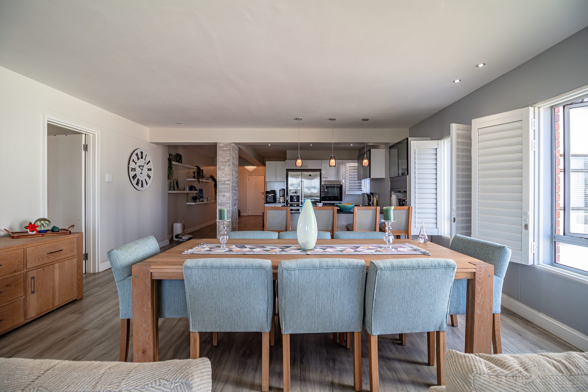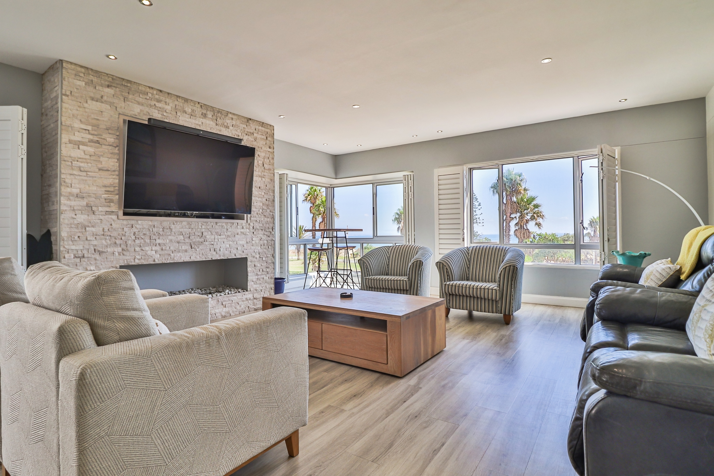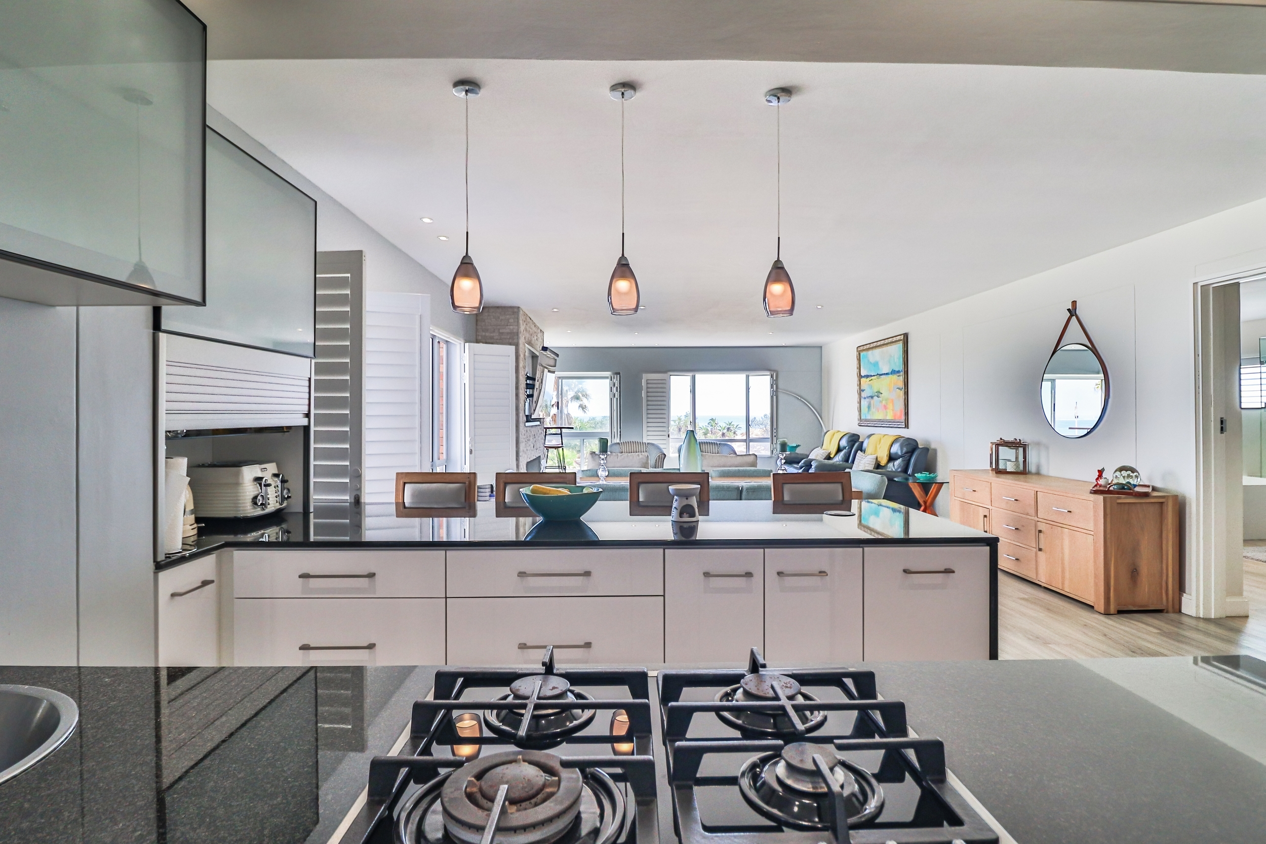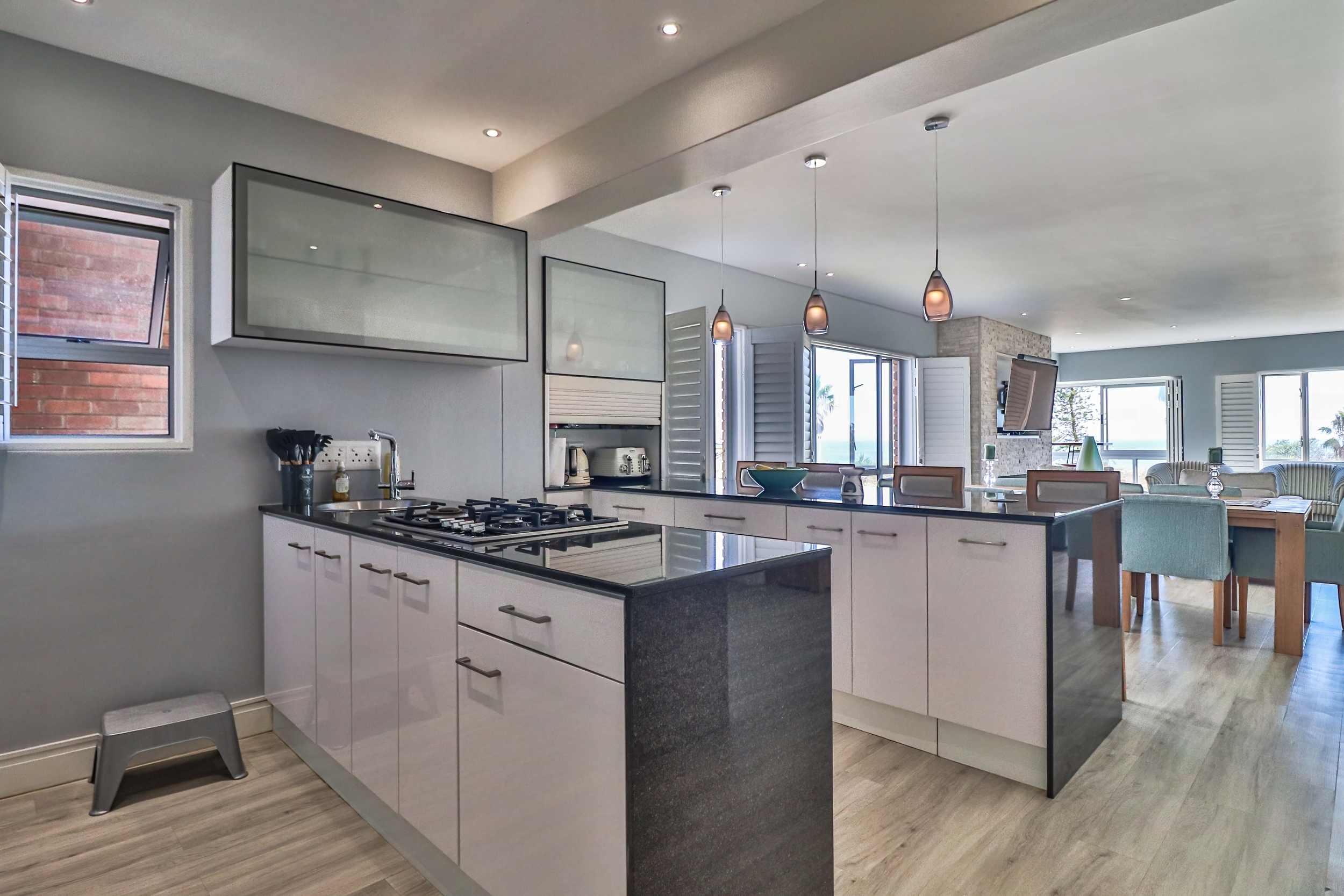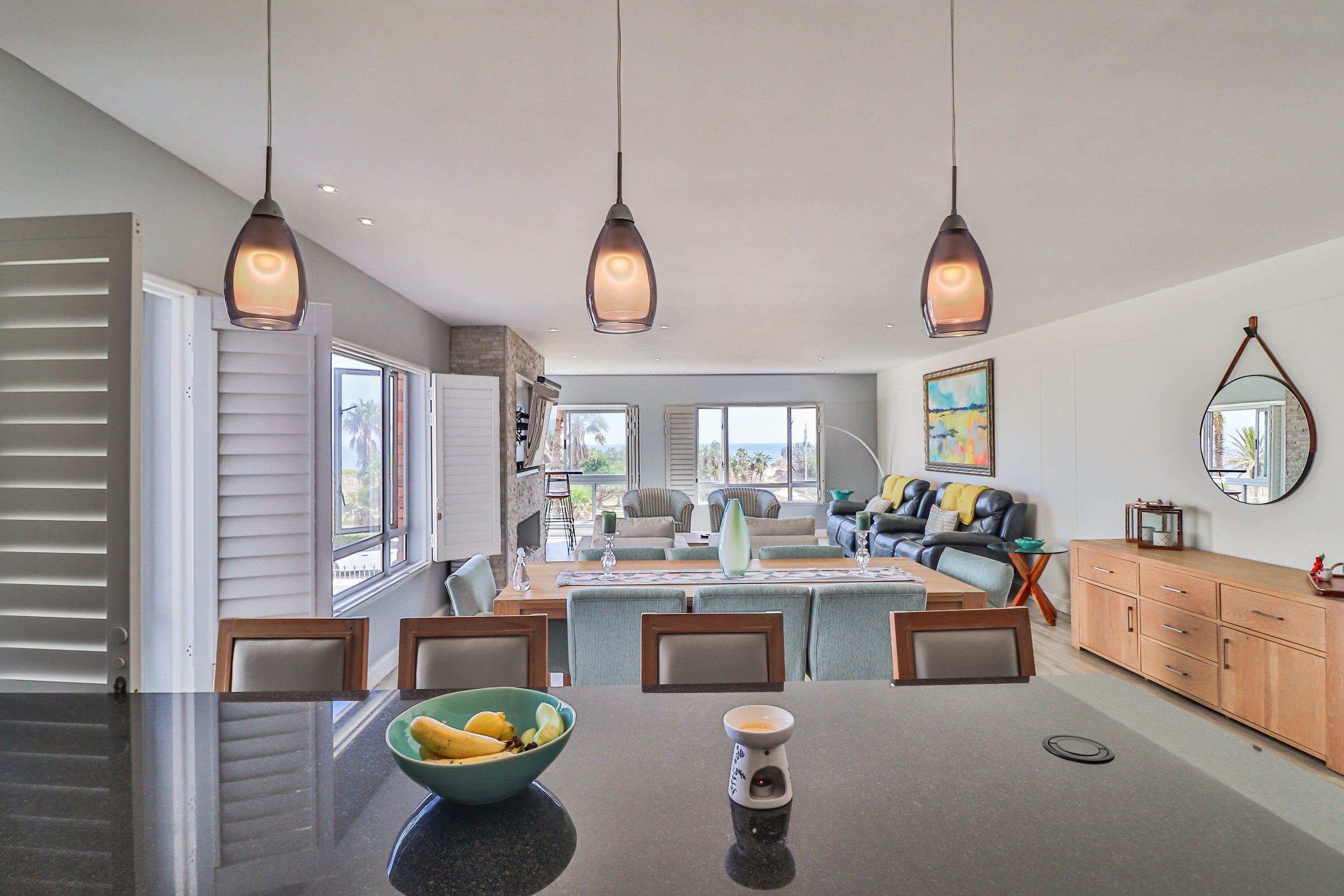 The open-plan living areas are designed to impress: a modern kitchen that flows into the dining and lounge area, complemented by a separate scullery. The lounge area has a gas fireplace for warmth and ambiance, not to mention the spectacular sea views from here.