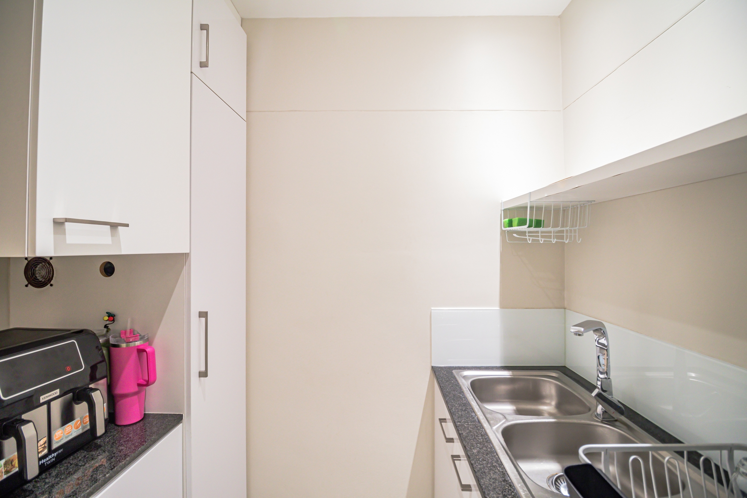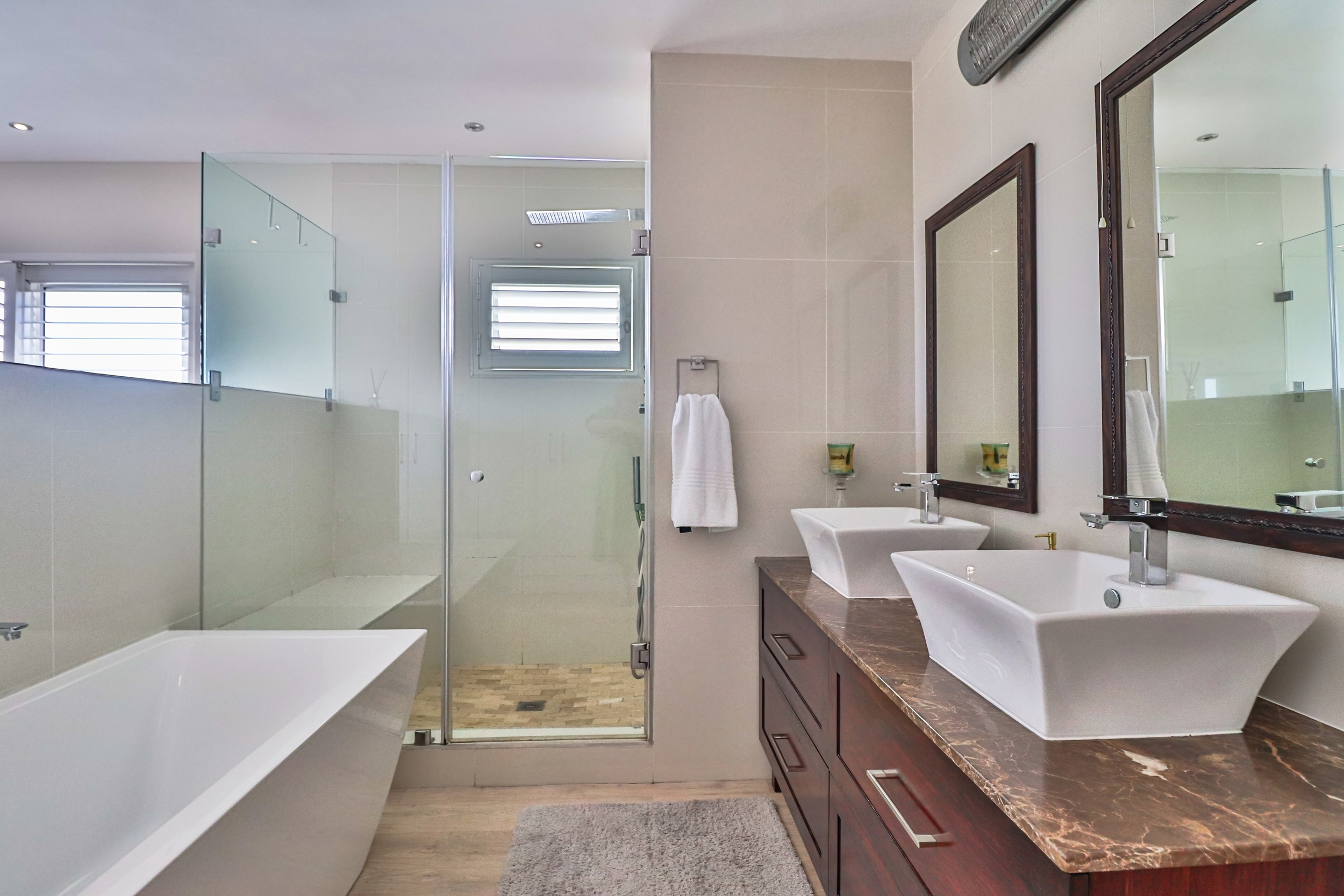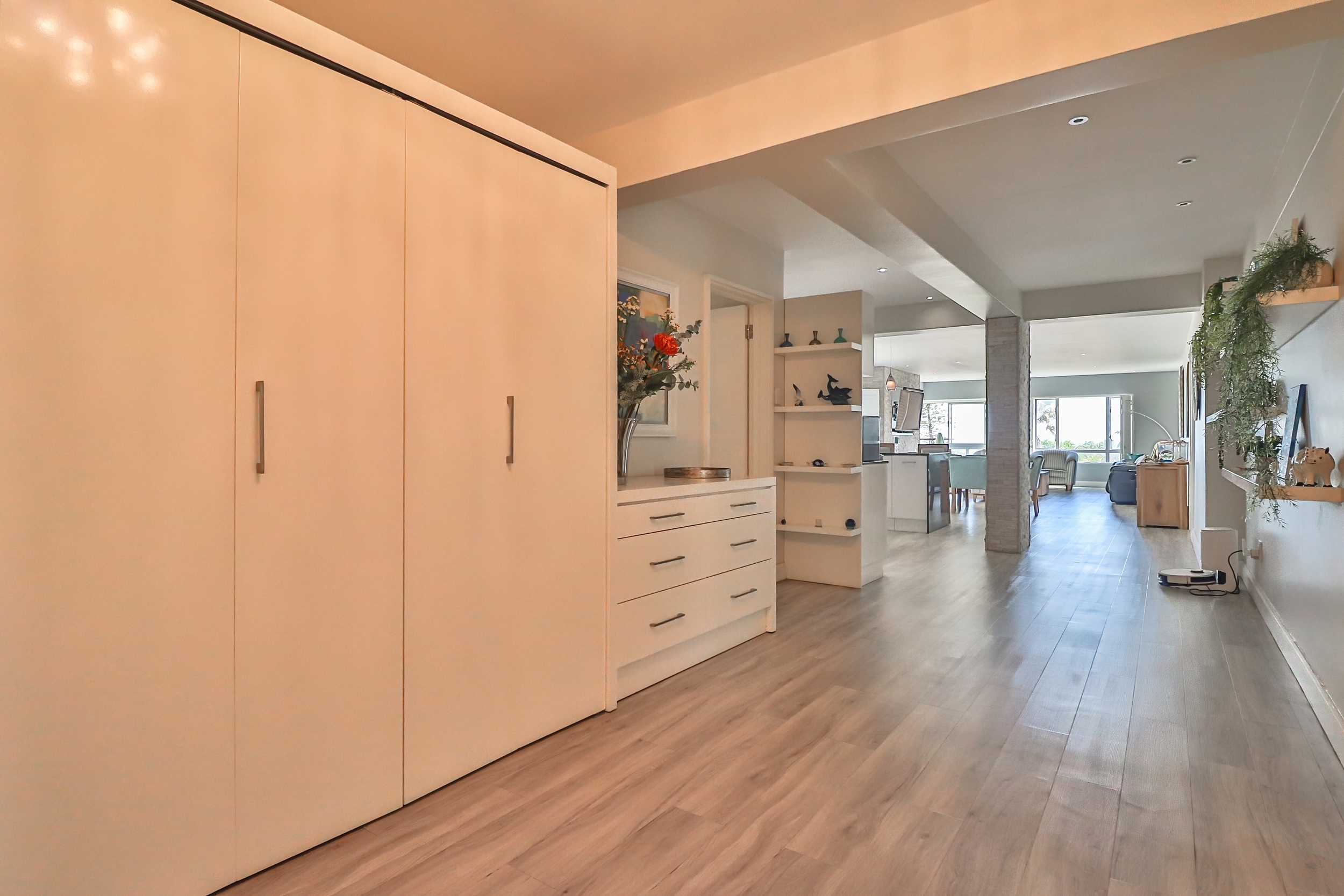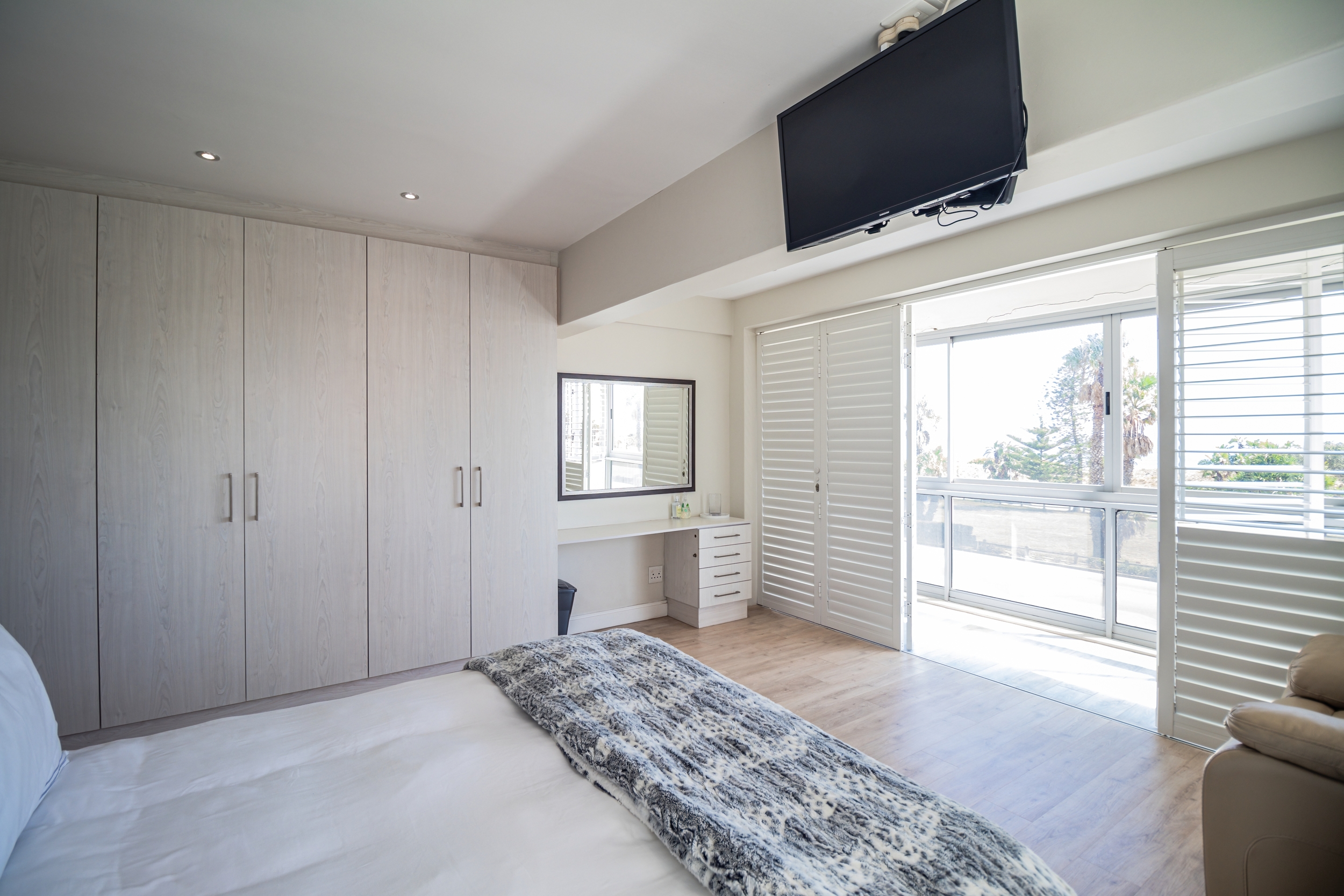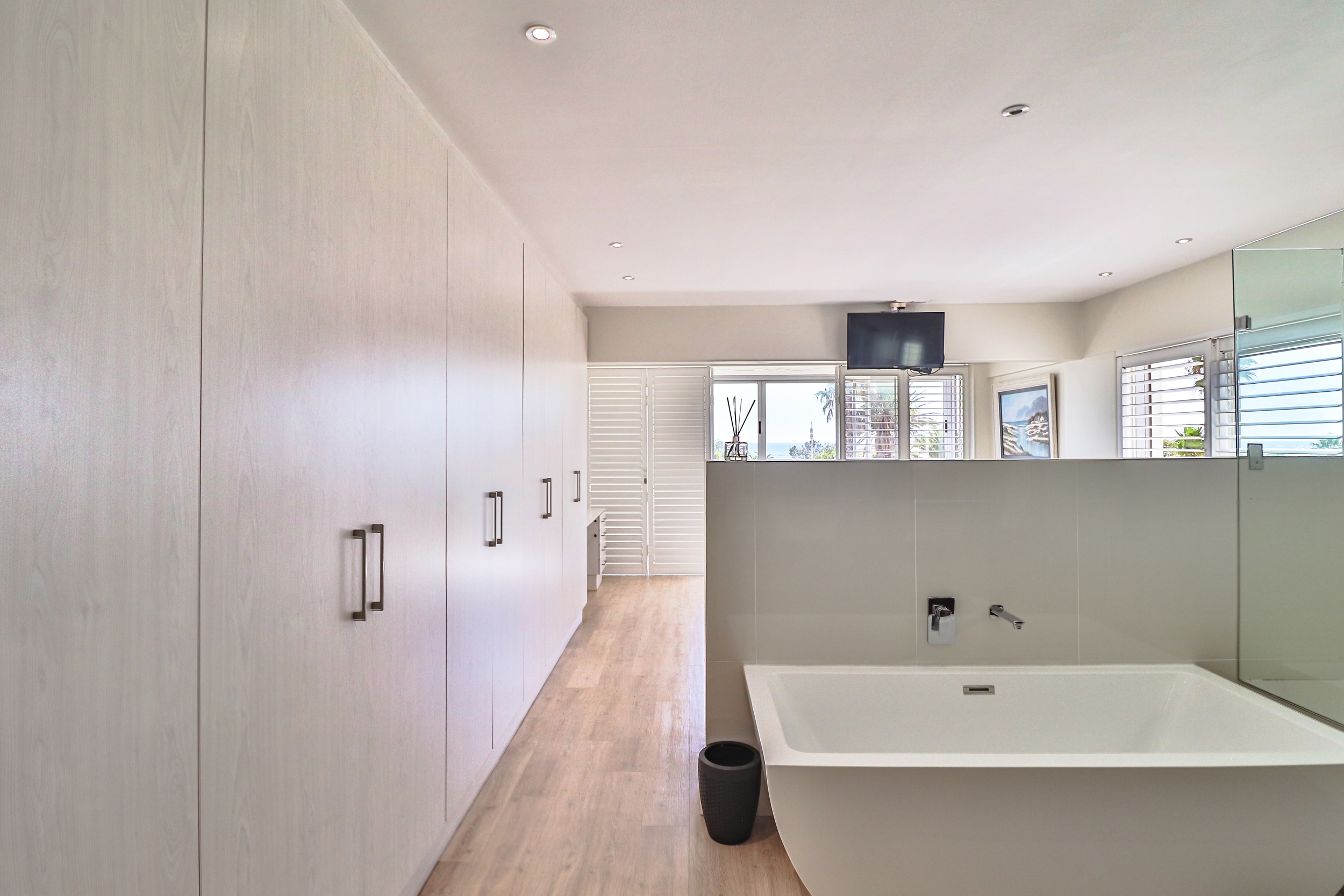 The open-plan living areas are designed to impress: a modern kitchen that flows into the dining and lounge area, complemented by a separate scullery. The lounge area has a gas fireplace for warmth and ambiance, not to mention the spectacular sea views from here.