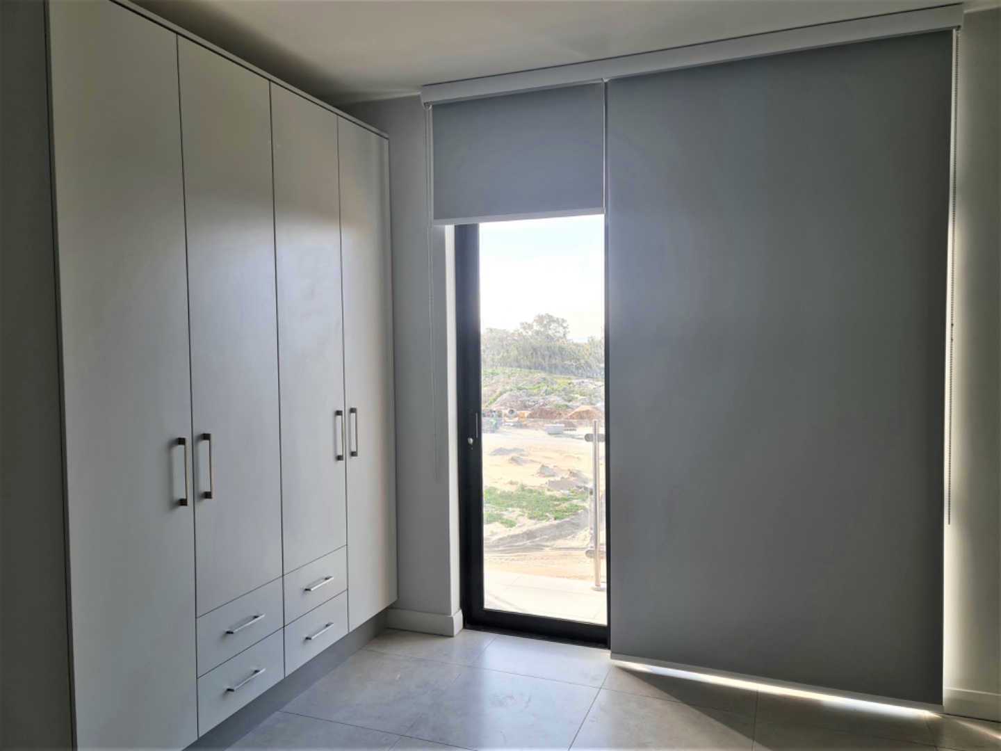 Both bedrooms are generously sized, with the main bedroom offering an en-suite bathroom for added convenience. Light grey walls, tiled flooring, and a neutral palette throughout provide a modern, easy-to-decorate space. Built-in wardrobes and an additional private storage room add excellent functionality.