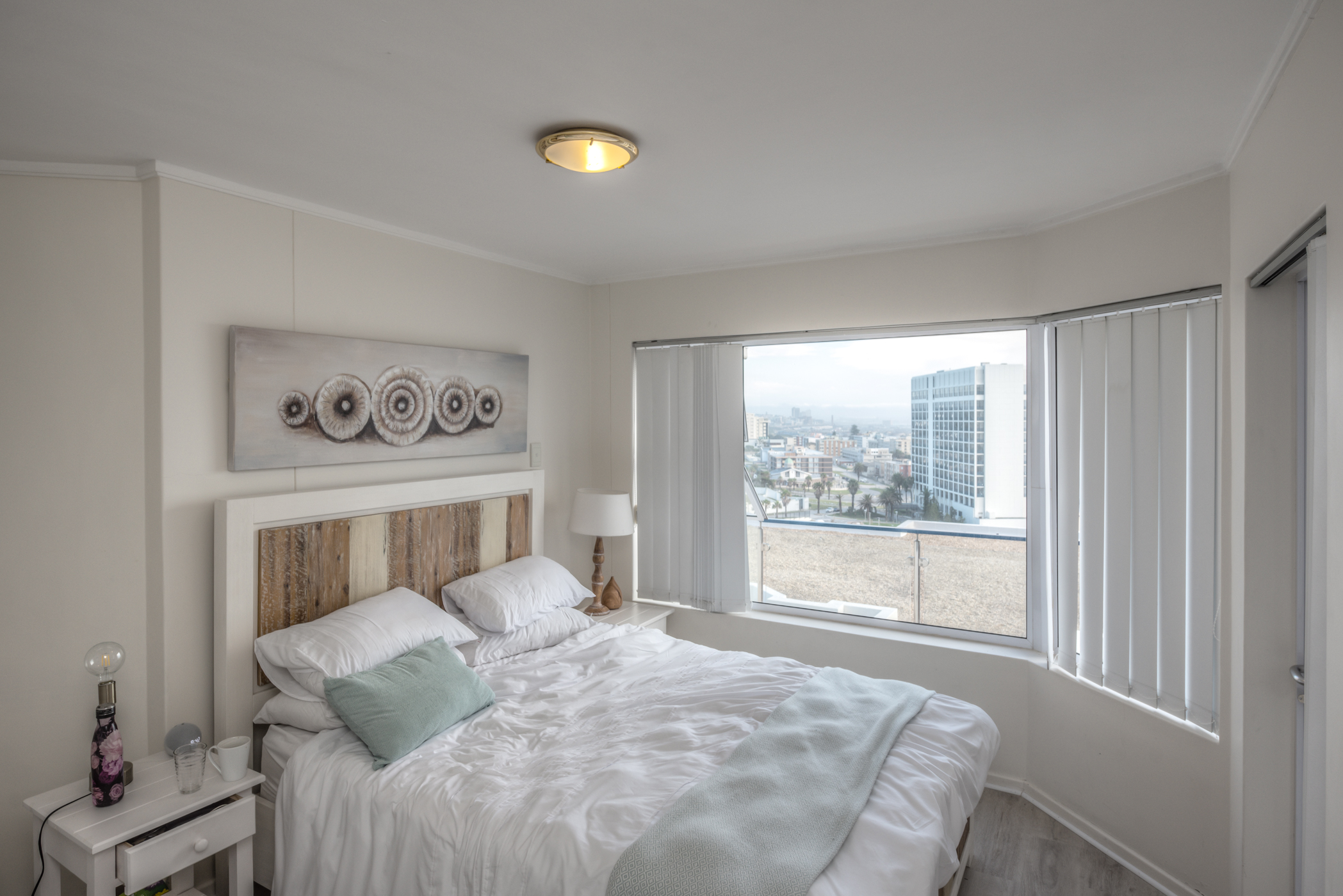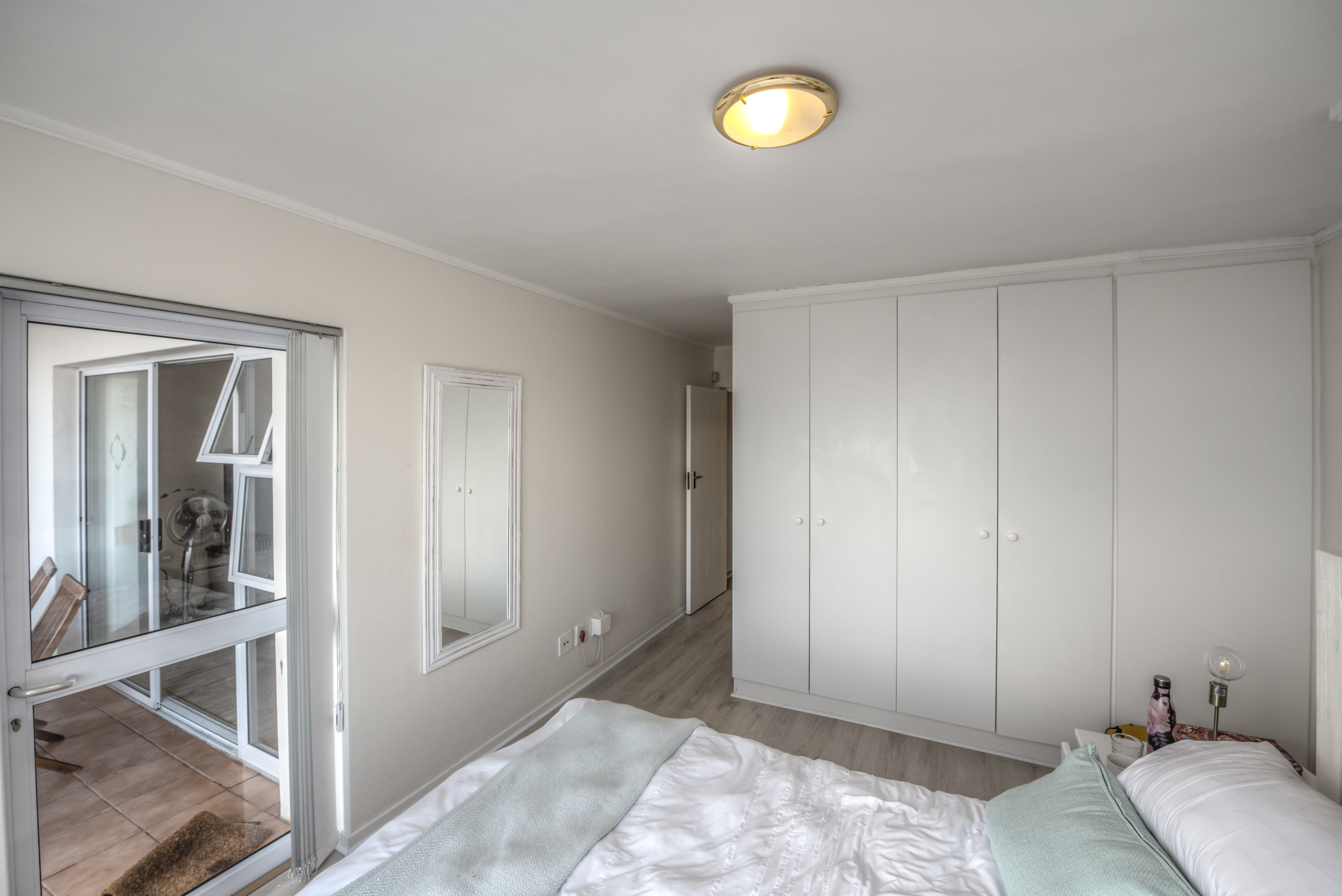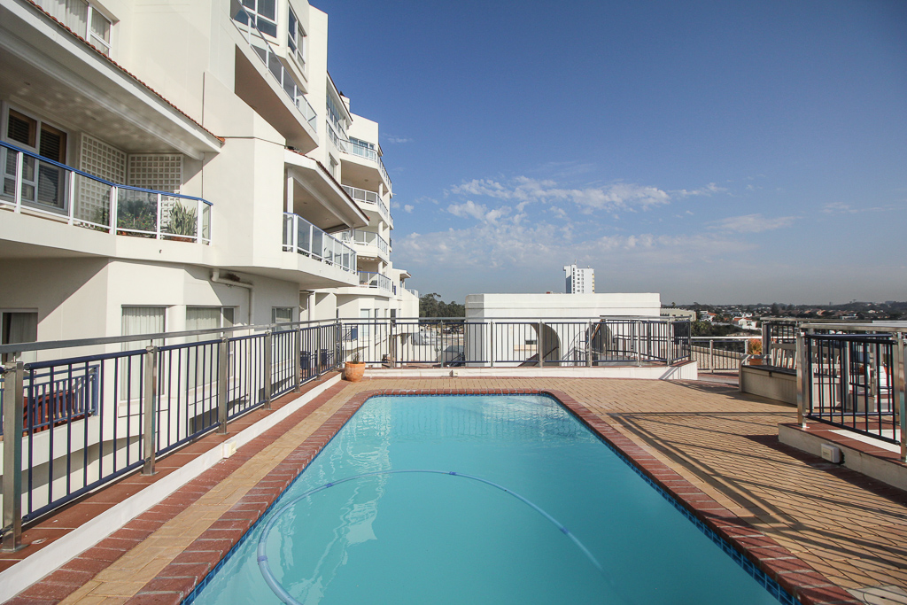 The main bedroom includes built-in cupboards, has beautiful sea views, and an interleading door to the balcony, along with an en-suite bathroom fitted with a shower and toilet. The second bedroom also includes built-in cupboards, and a separate family bathroom provides additional convenience with a bath, shower-over-bath, and toilet. The apartment further includes a single garage, and residents have access to a communal swimming pool.