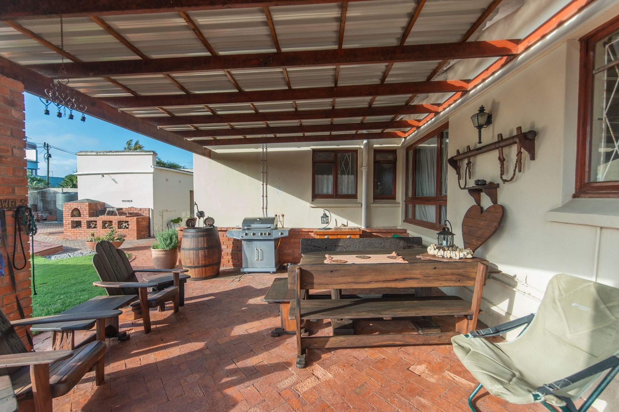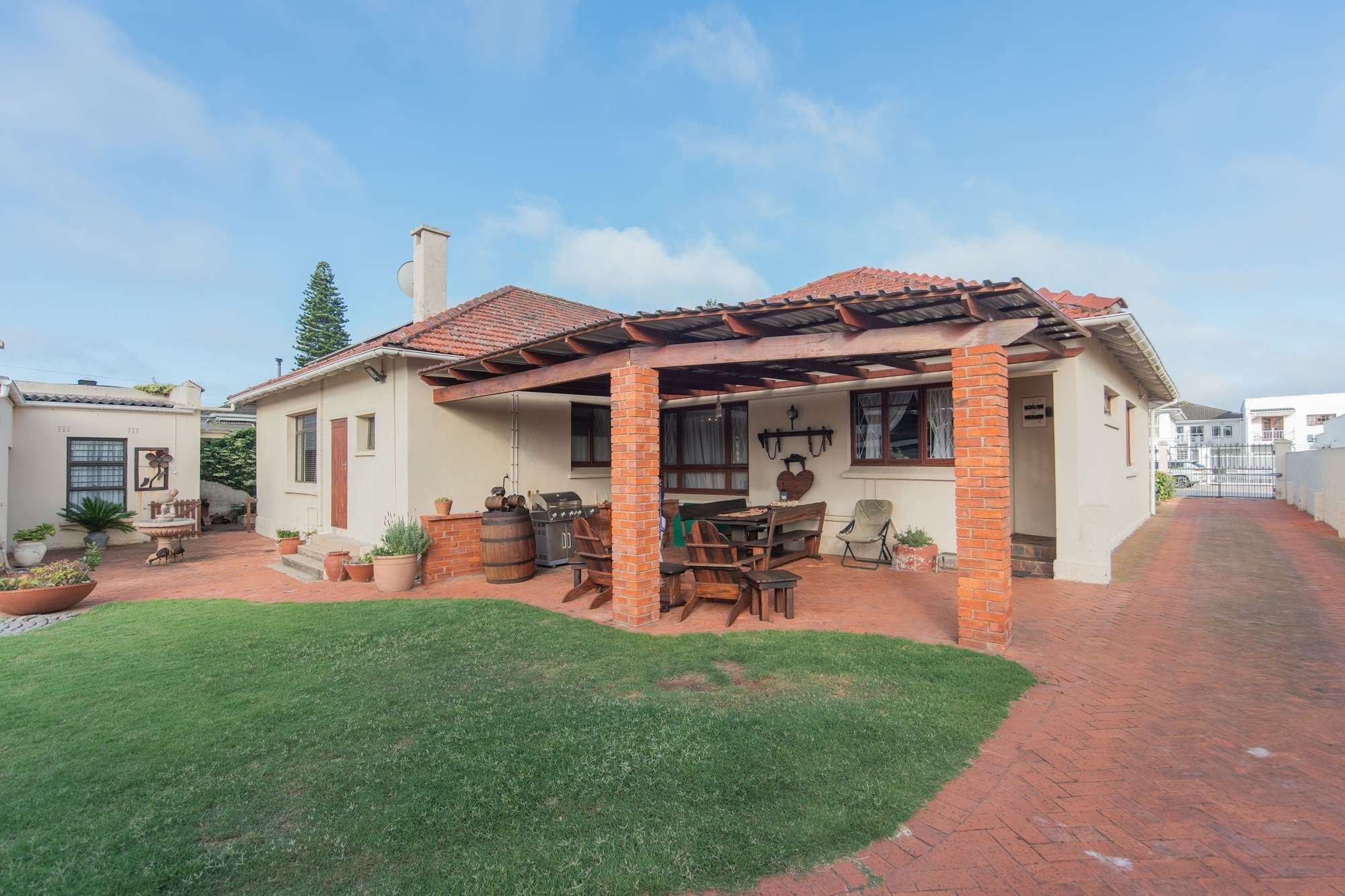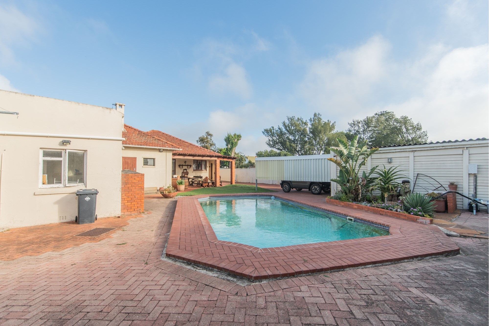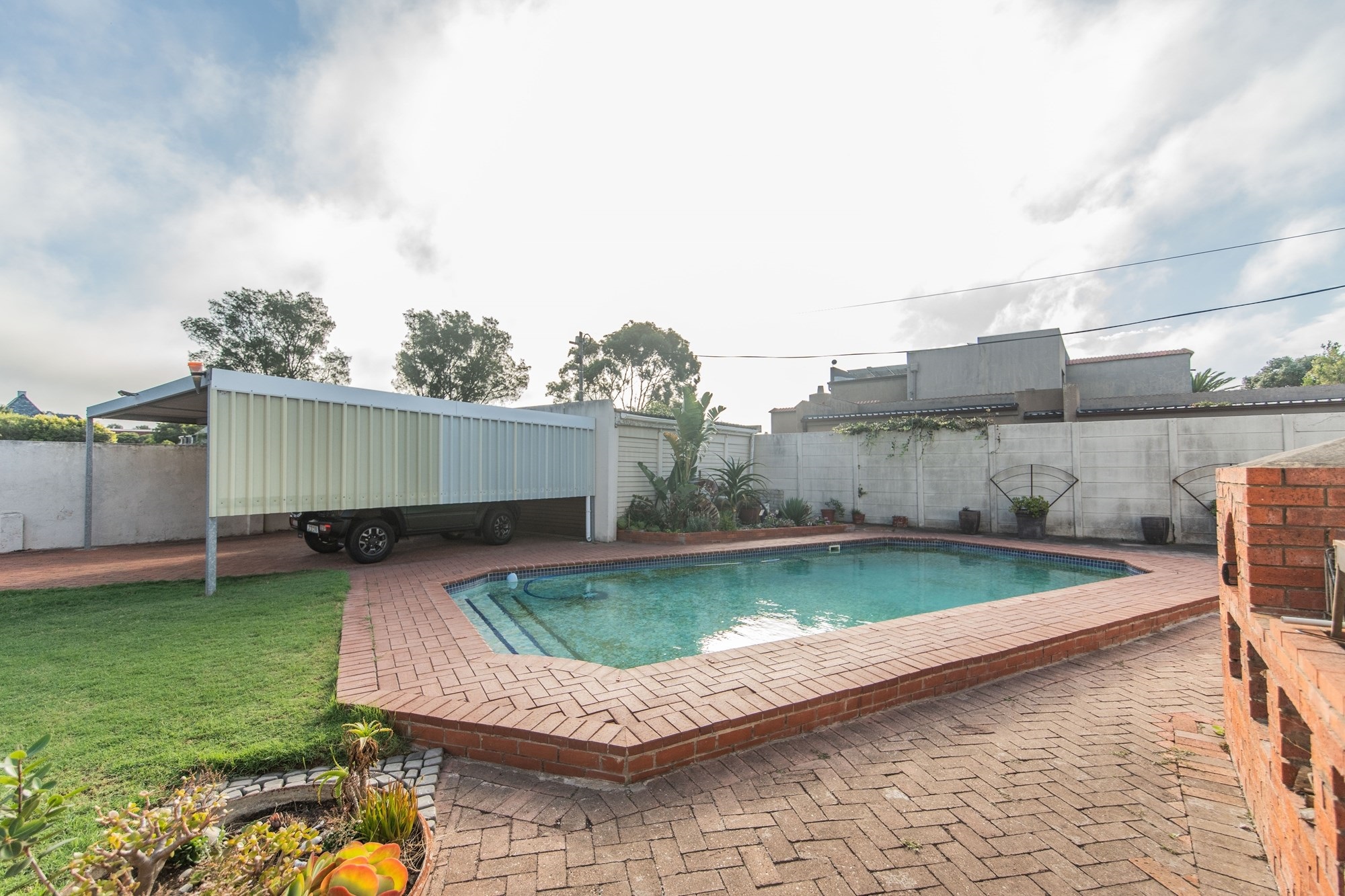 The outdoor space is designed for relaxation and entertainment, featuring a sparkling pool, a covered braai area and ample parking with a two-car garage and carport.