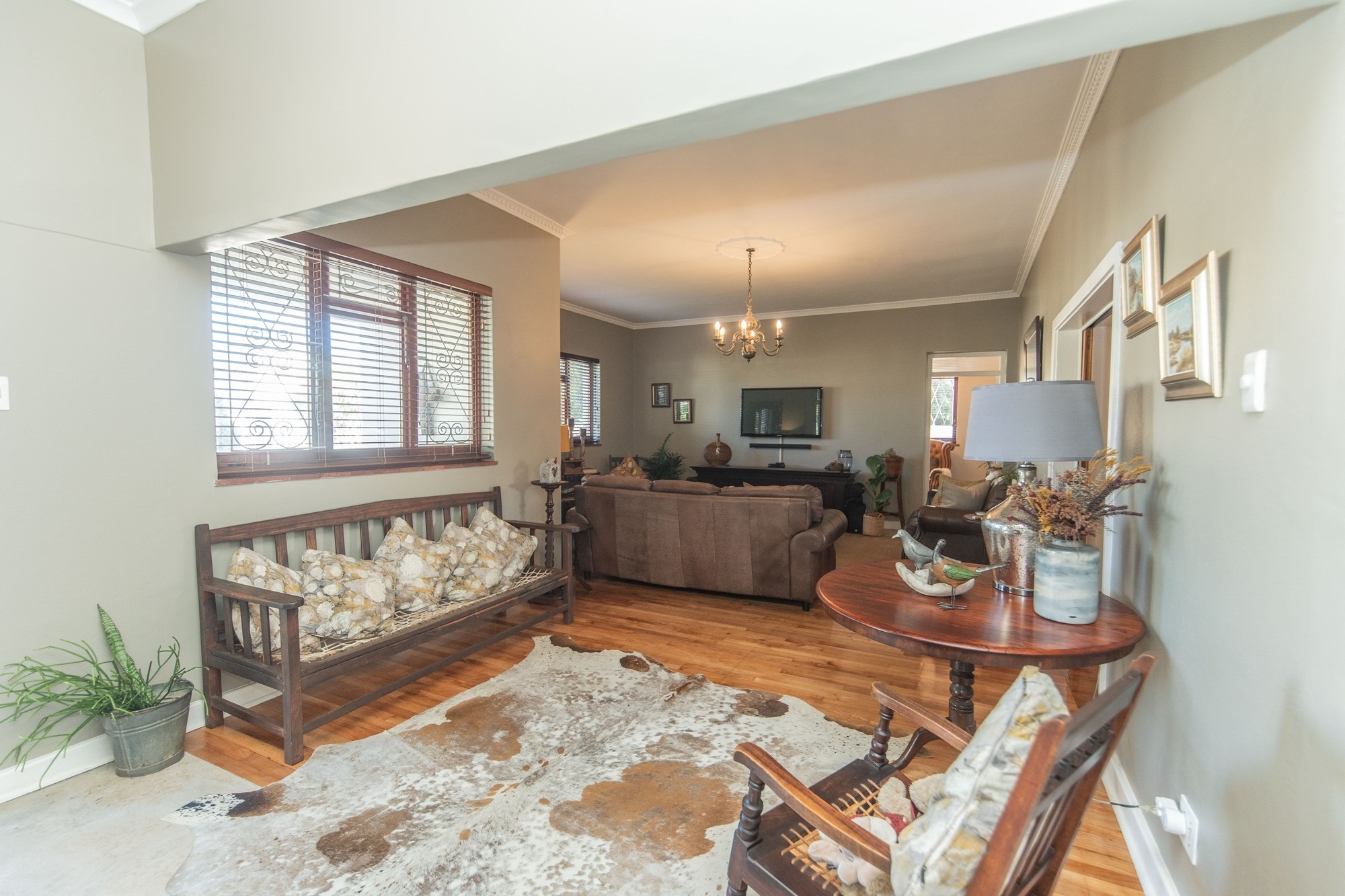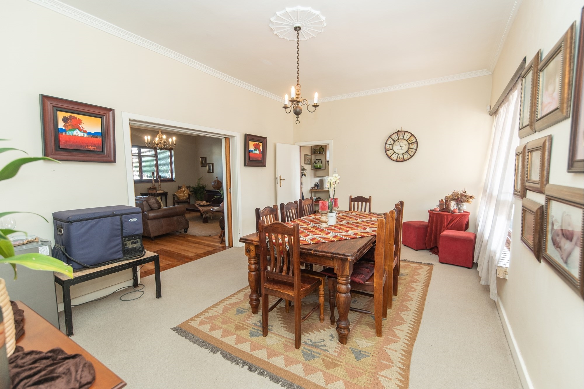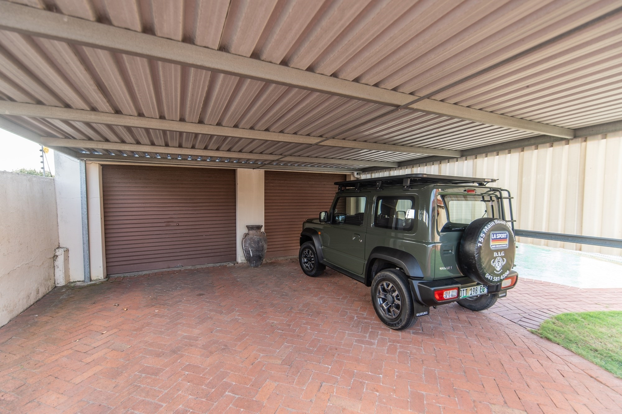 The outdoor space is designed for relaxation and entertainment, featuring a sparkling pool, a covered braai area and ample parking with a two-car garage and carport.