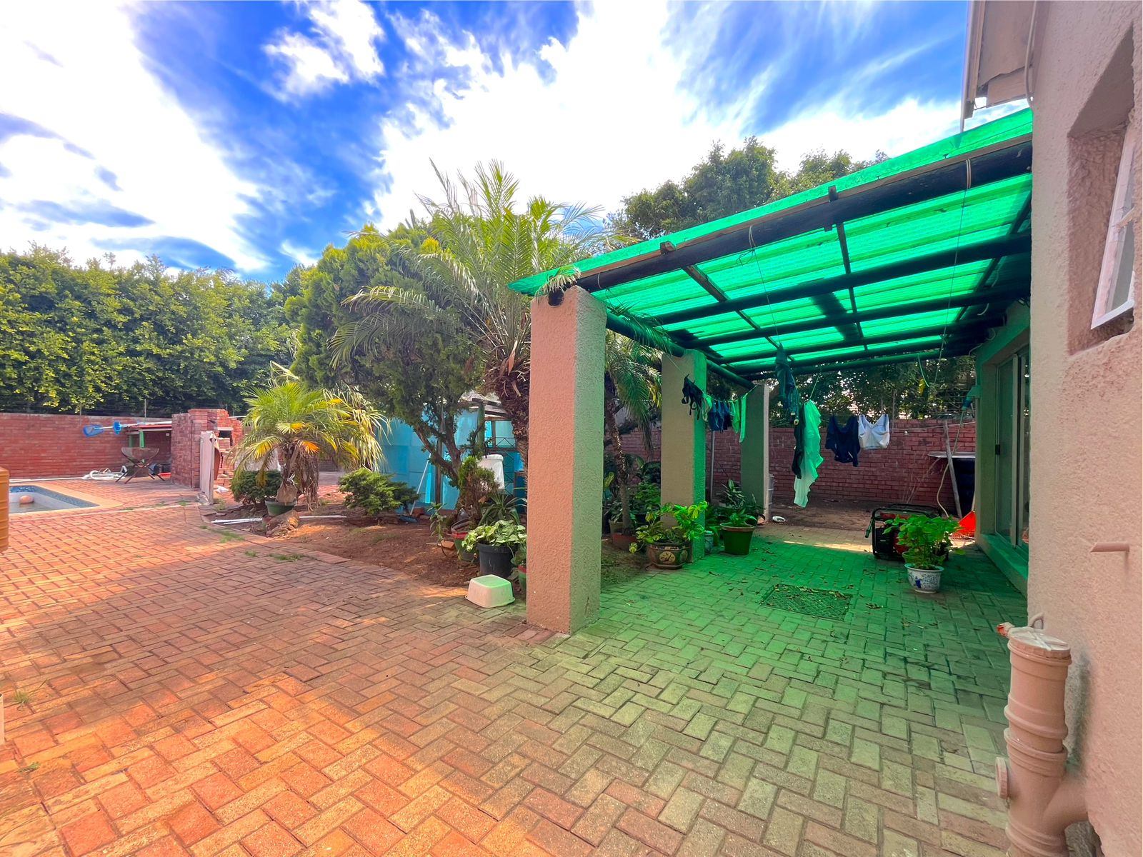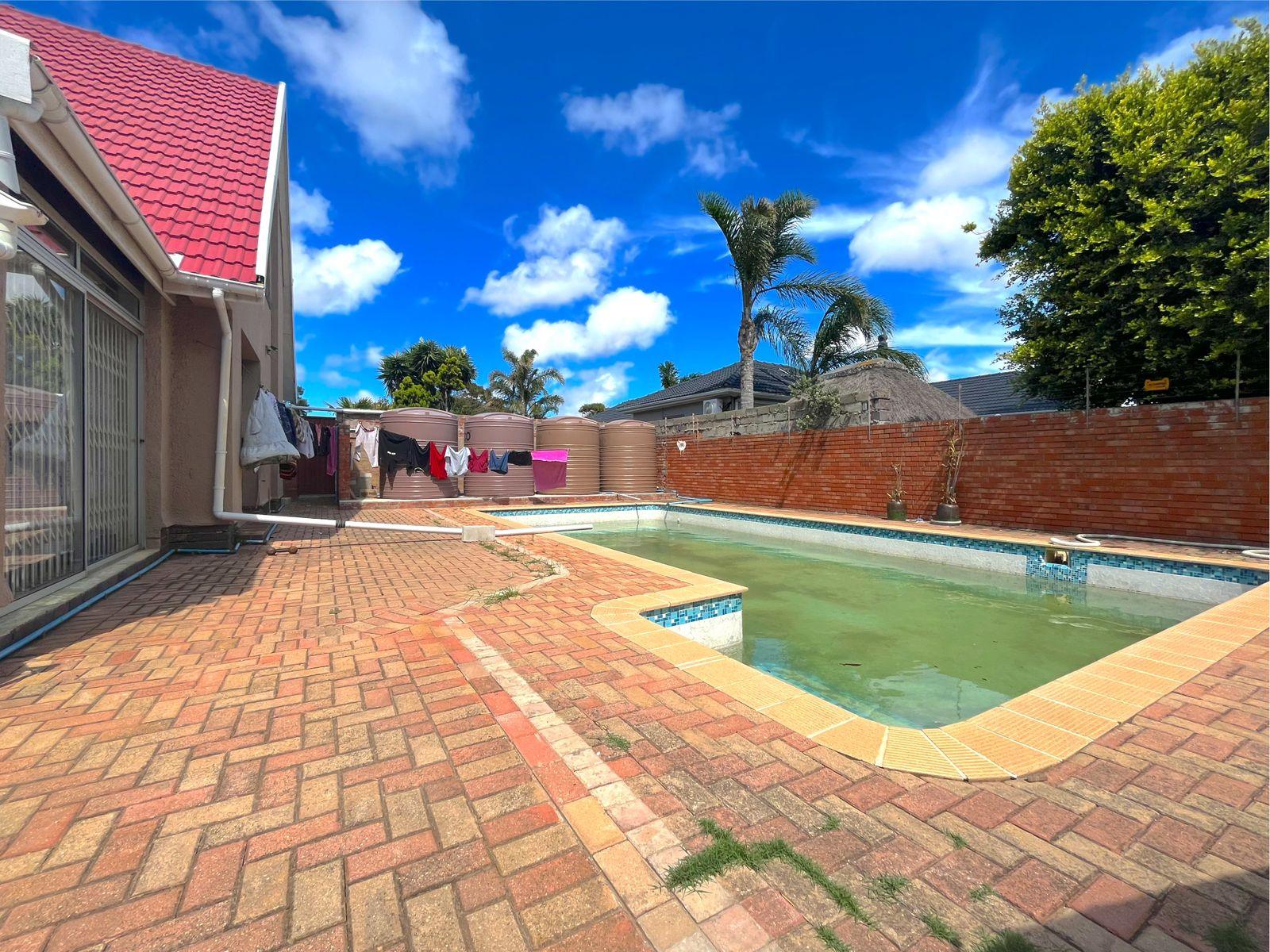The main residence comprises five well-proportioned bedrooms and welcoming living spaces that flow effortlessly toward the outdoor entertainment area, featuring a swimming pool and braai lapa—perfect for relaxed family living or guest enjoyment. The front exterior further offers creative landscaping potential, including space ideal for tranquil garden or pond features.