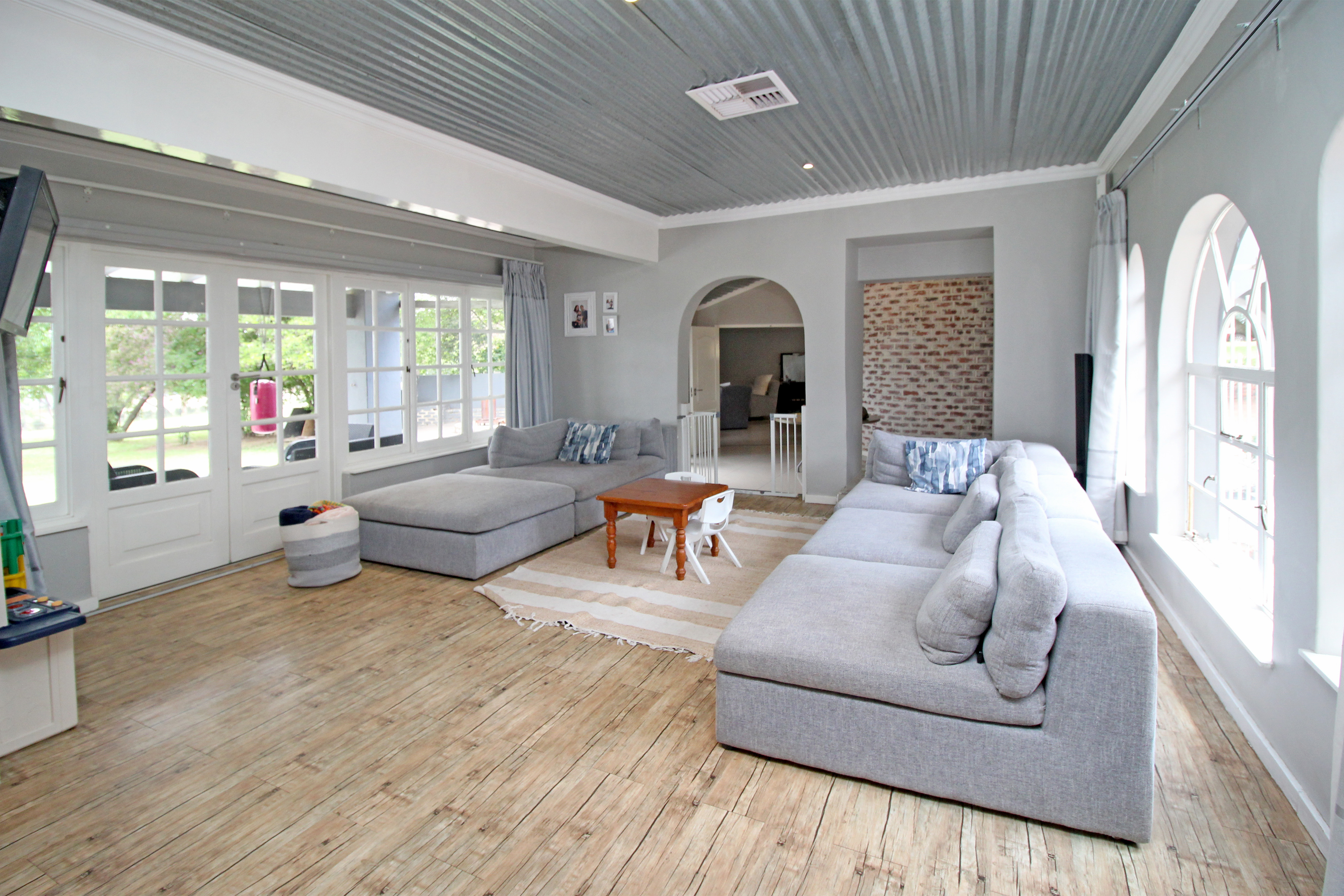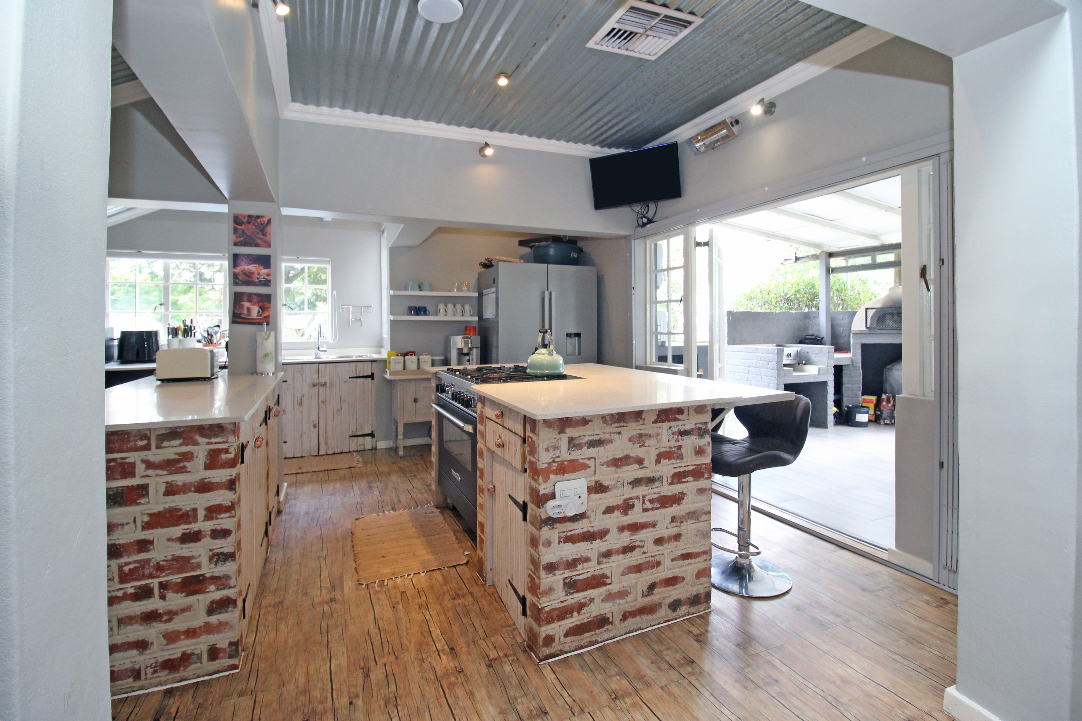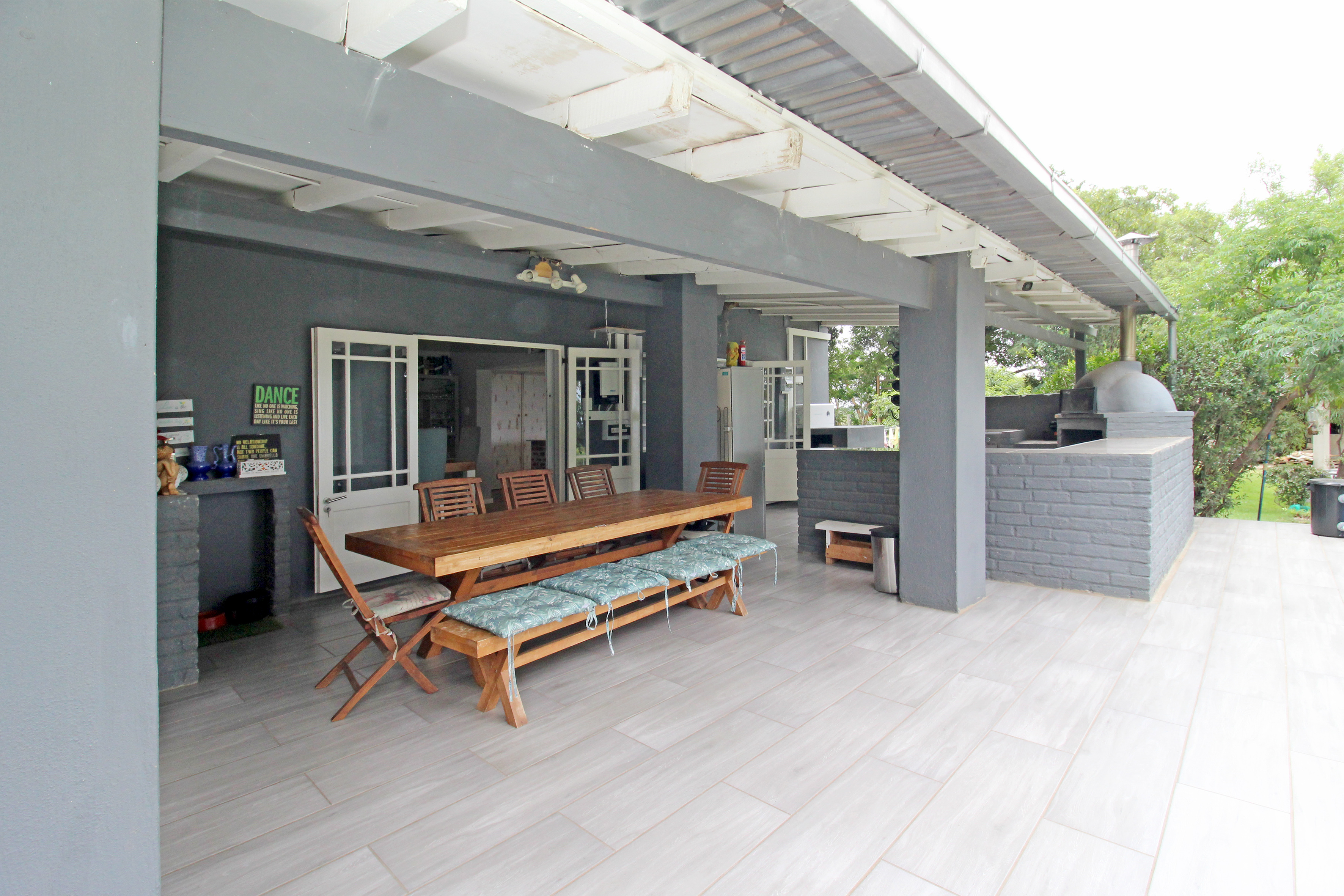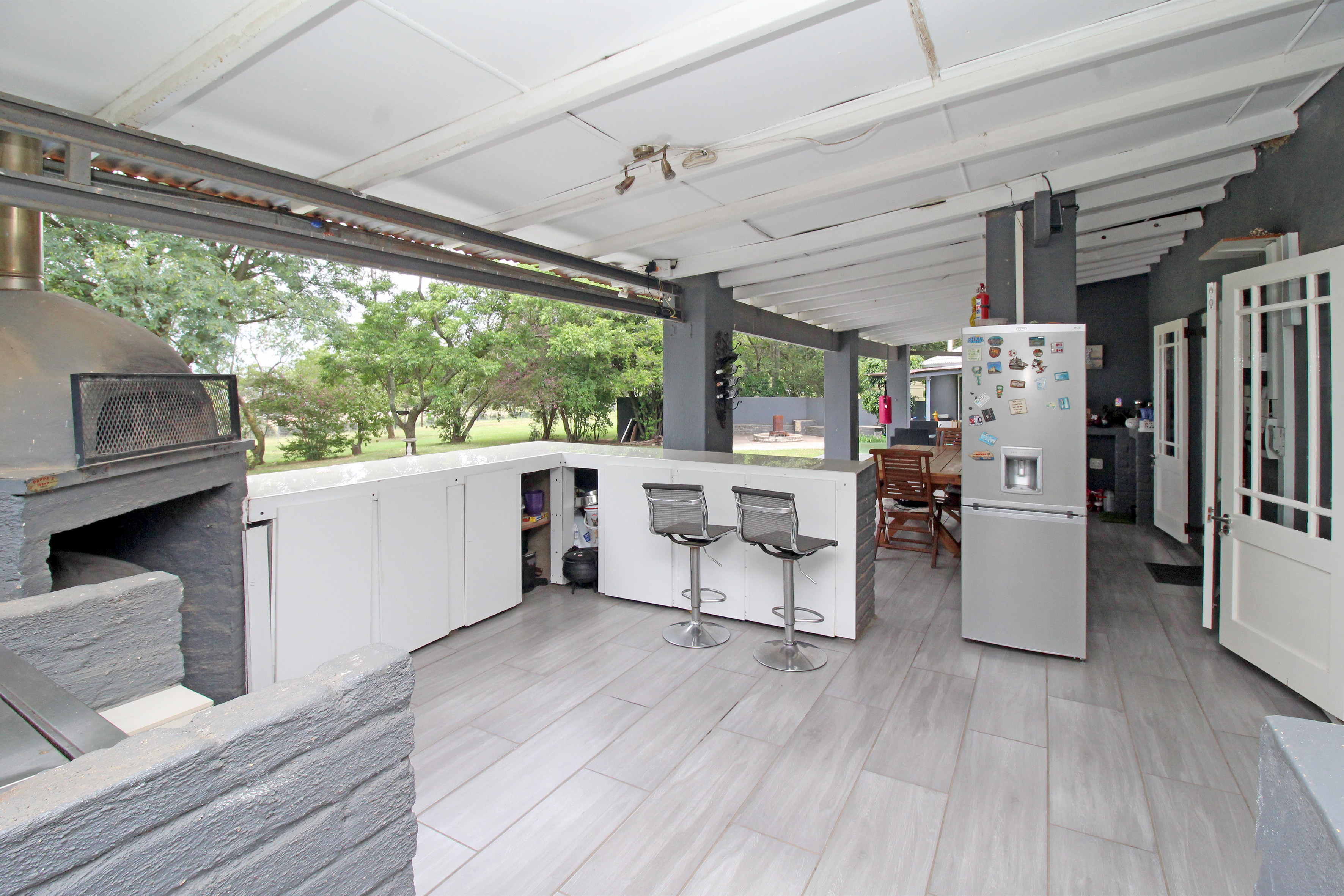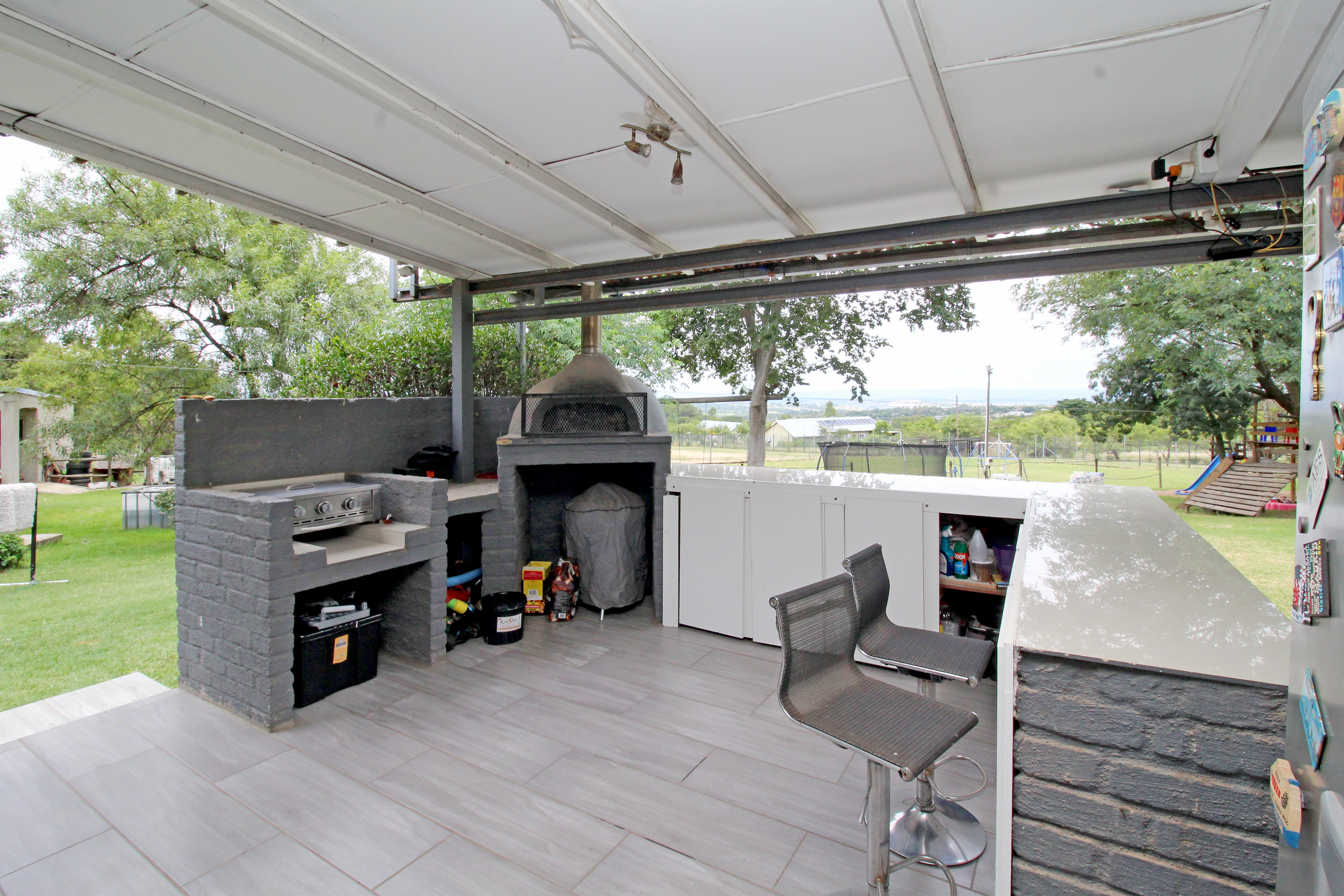 The TV room, dining area, and kitchen all feature doors that open onto a spacious, covered patio, thoughtfully divided into zones. The first zone is a dedicated play area for children, while the dining area and outdoor kitchen—complete with a gas braai, pizza oven, outside sink and food preparation area—offer the perfect space for entertaining.