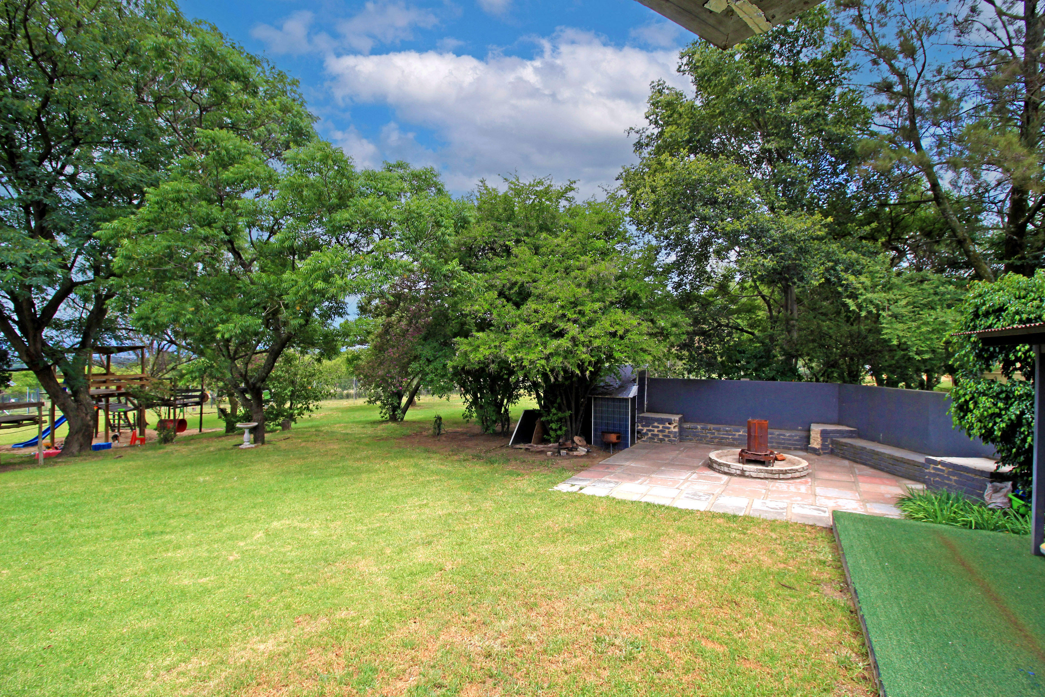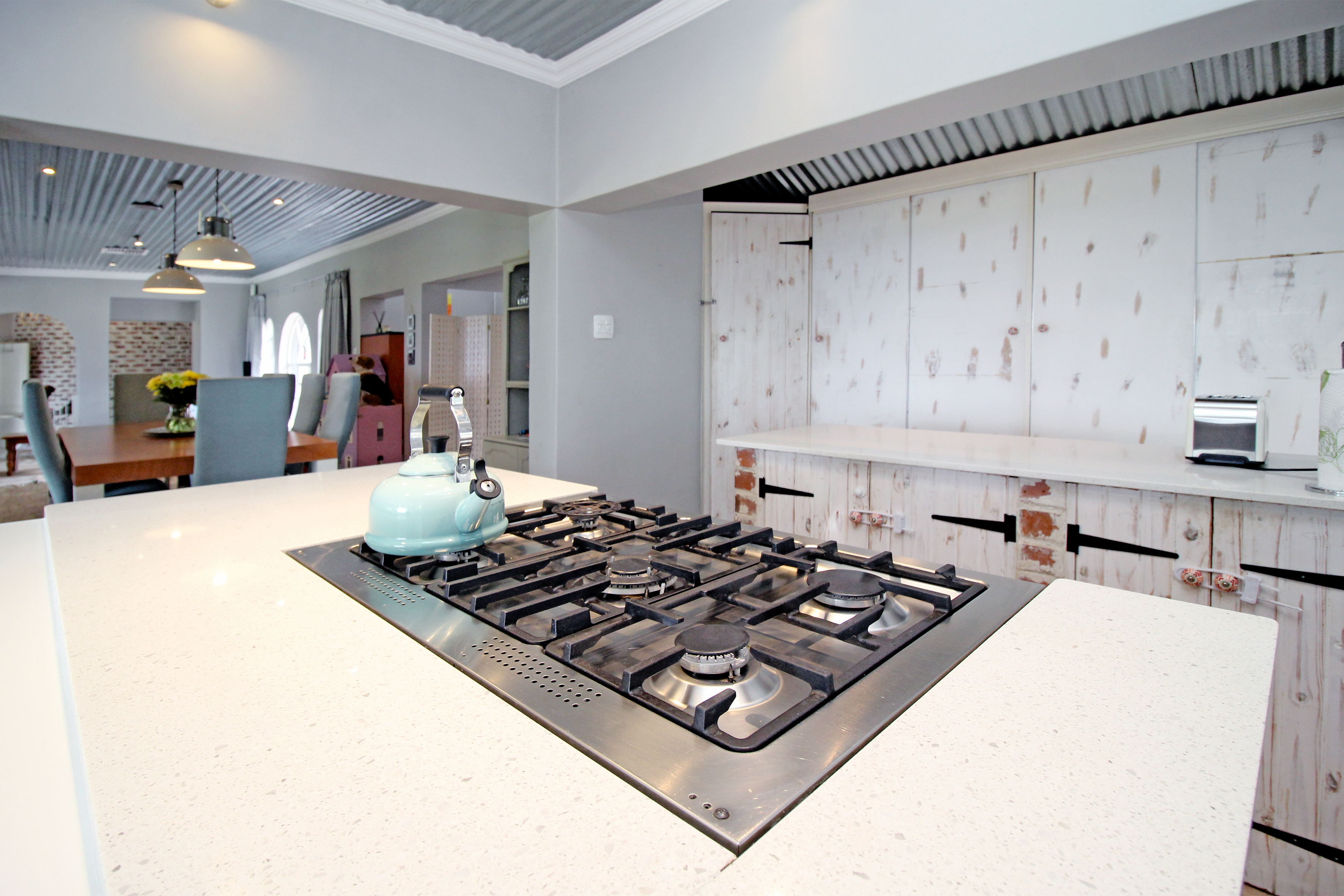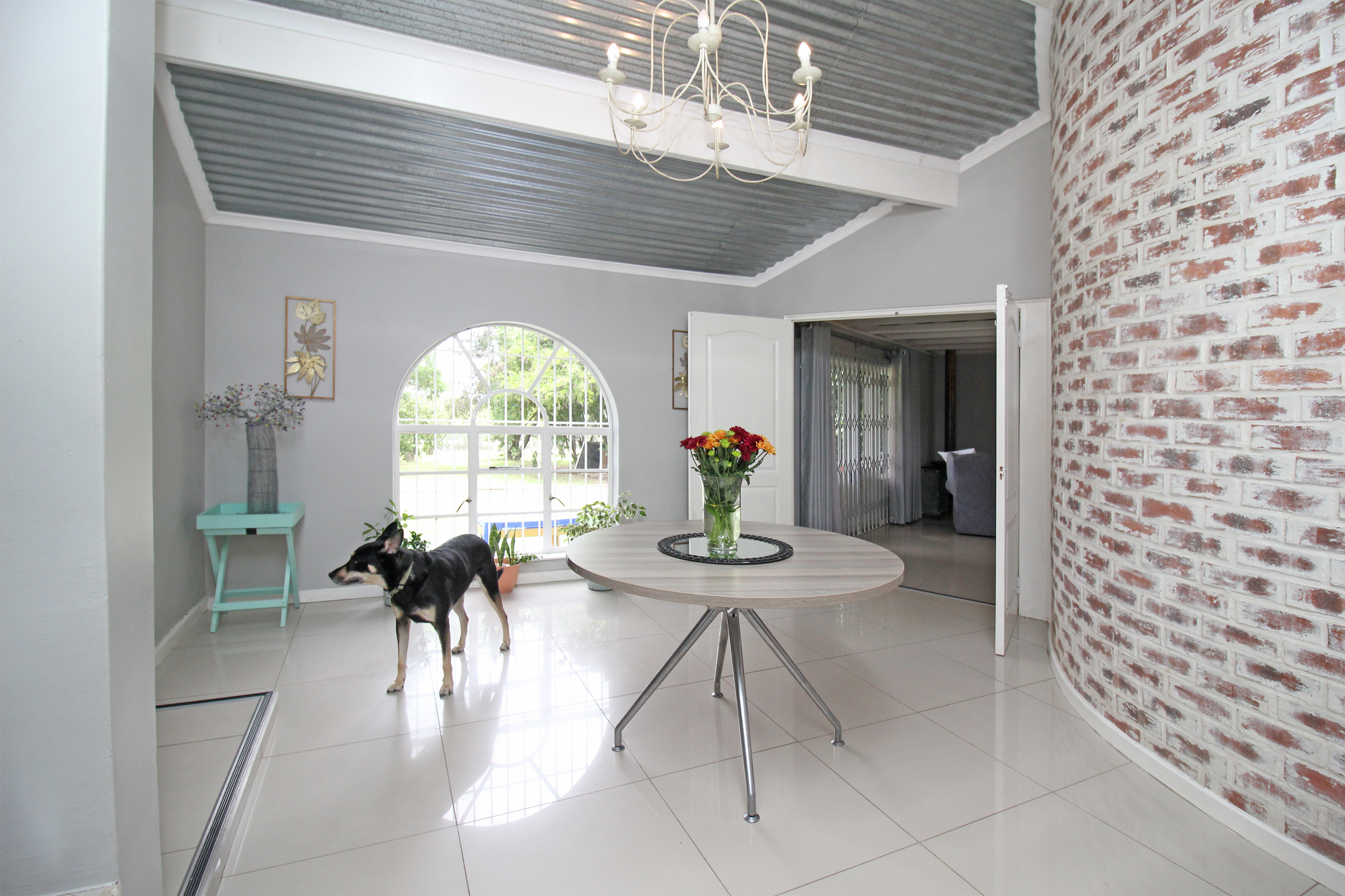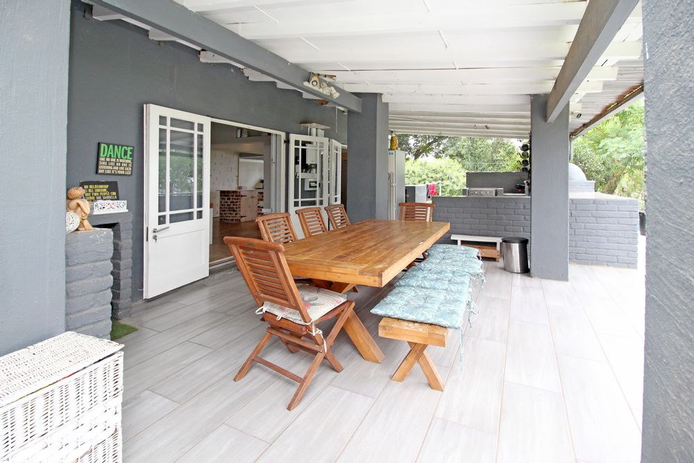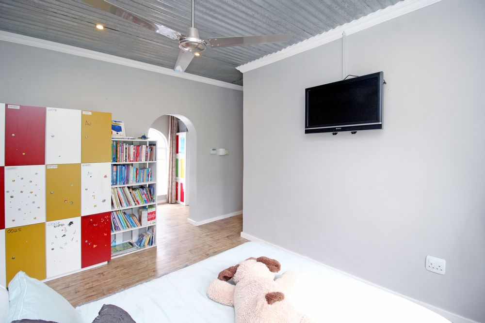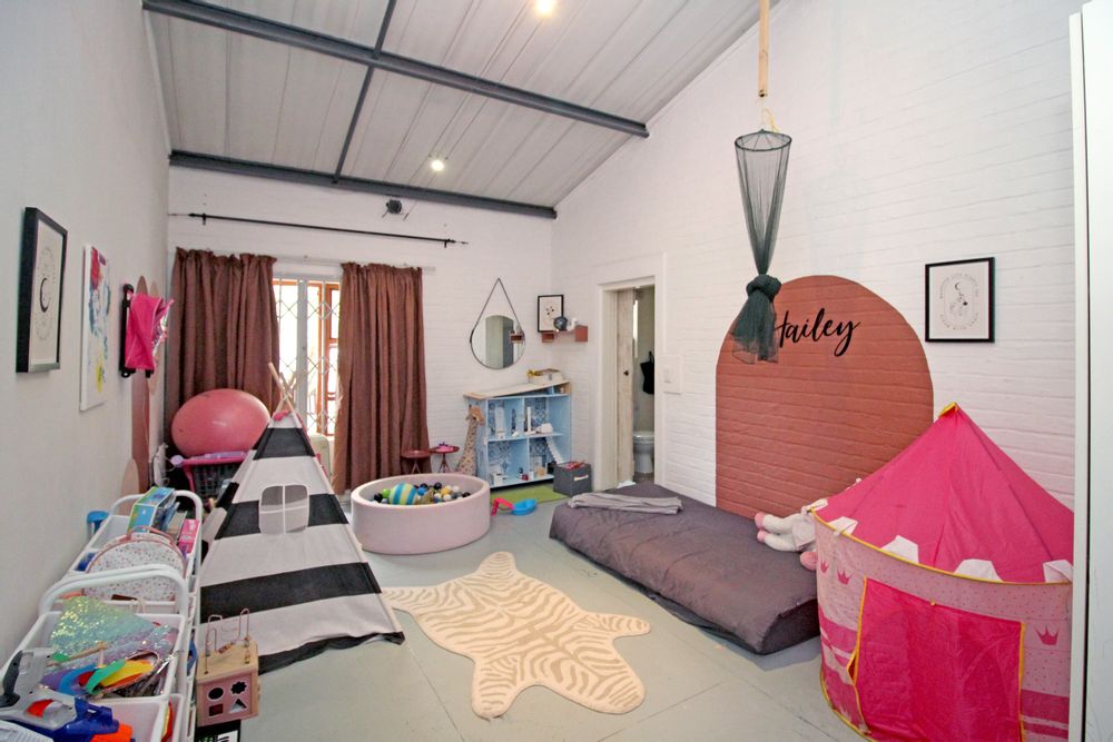 The TV room, dining area, and kitchen all feature doors that open onto a spacious, covered patio, thoughtfully divided into zones. The first zone is a dedicated play area for children, while the dining area and outdoor kitchen—complete with a gas braai, pizza oven, outside sink and food preparation area—offer the perfect space for entertaining.